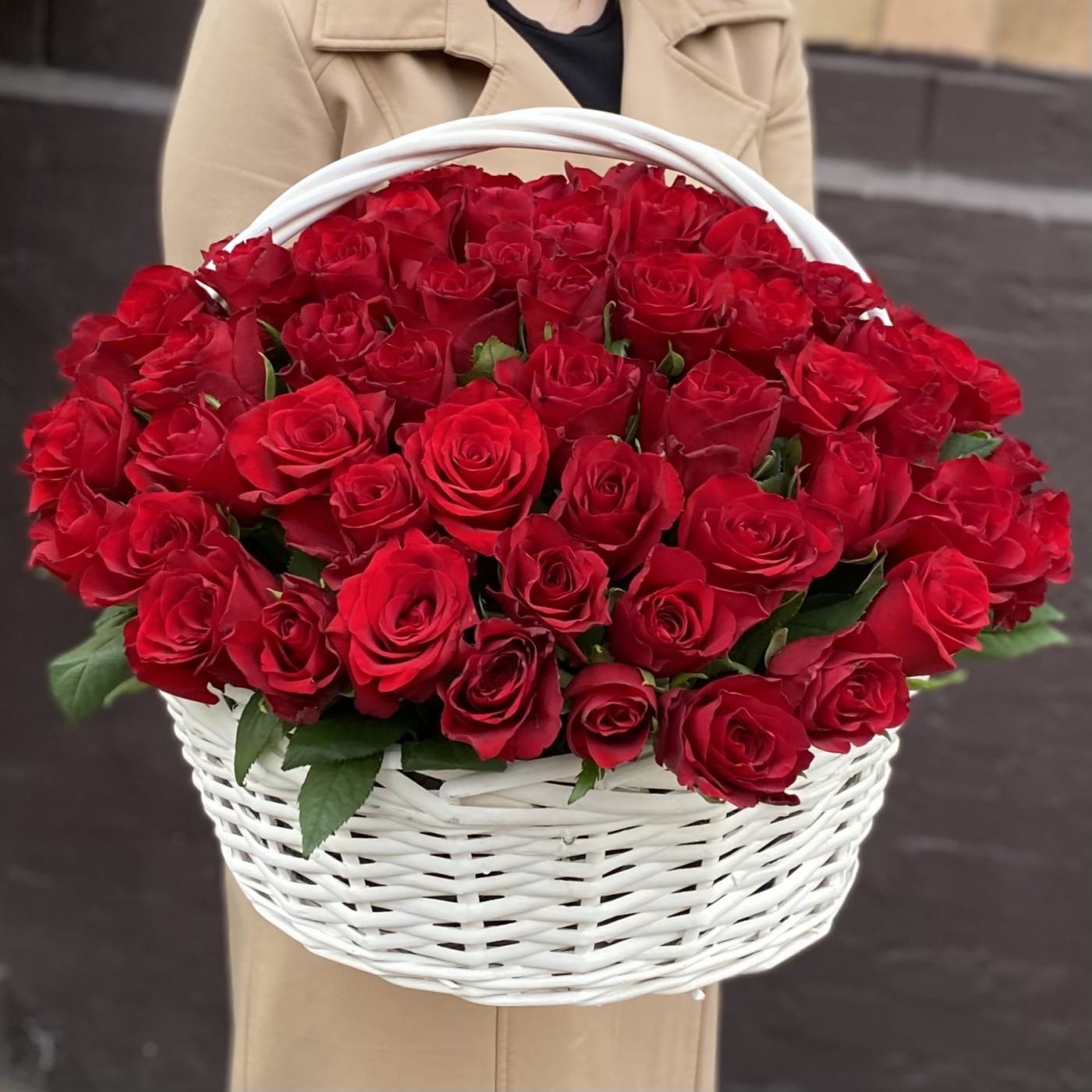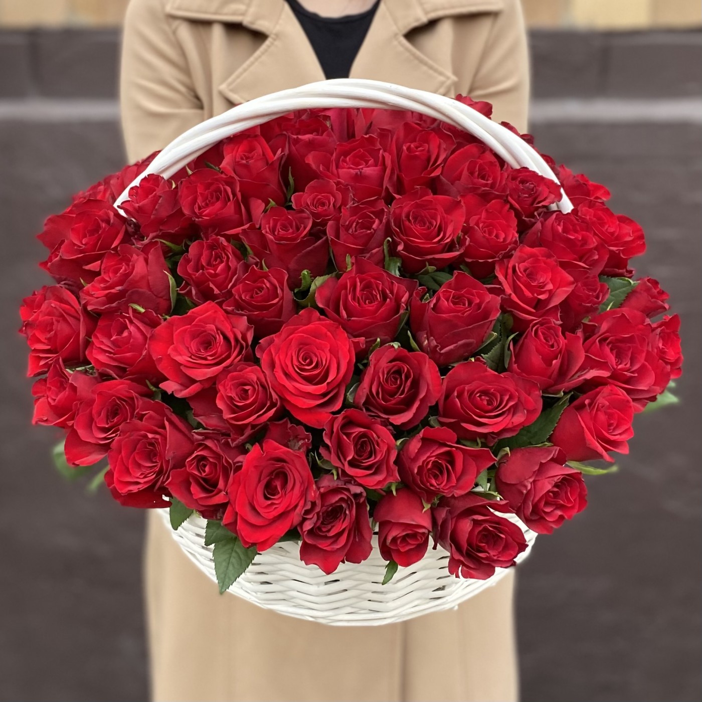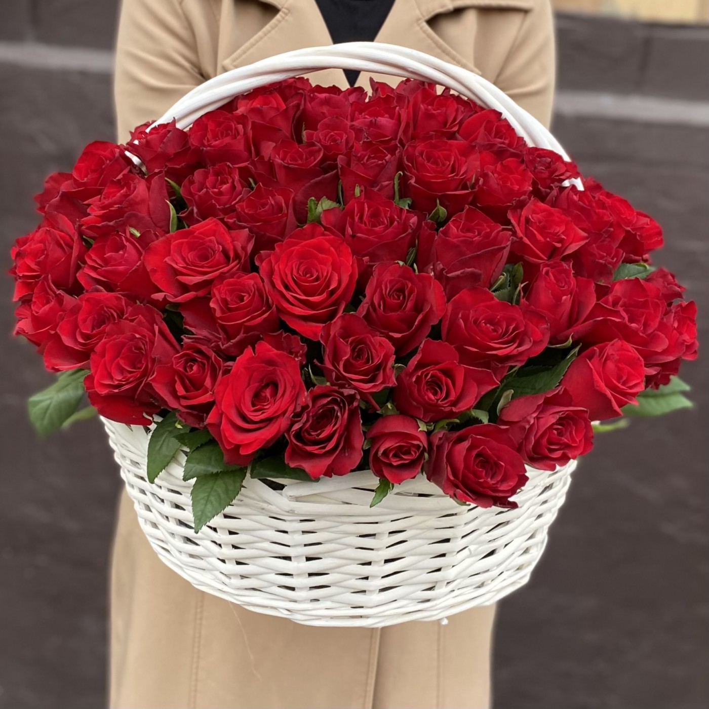 Классическая композиция из 101 красный розы в корзине. Такой презент можно подарить на день рождения, юбилей или признаться в своих чувствах и сделать неожиданный сюрприз с признанием.