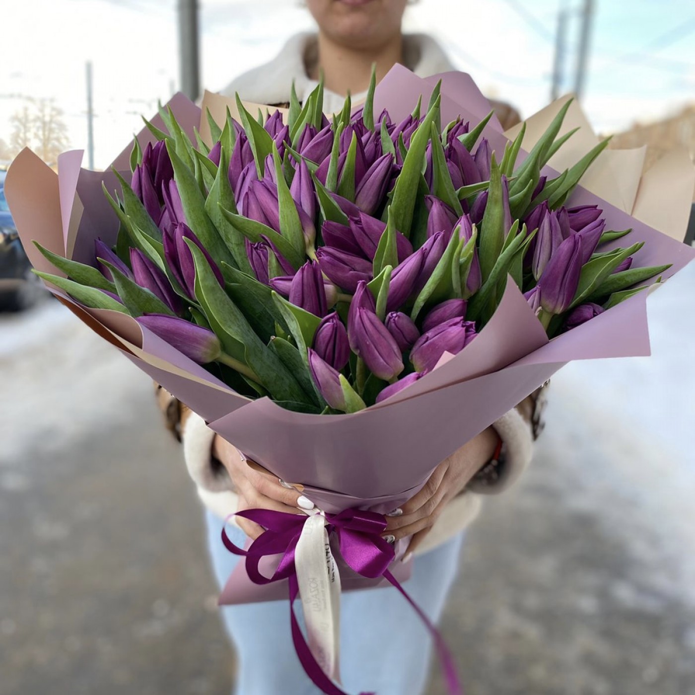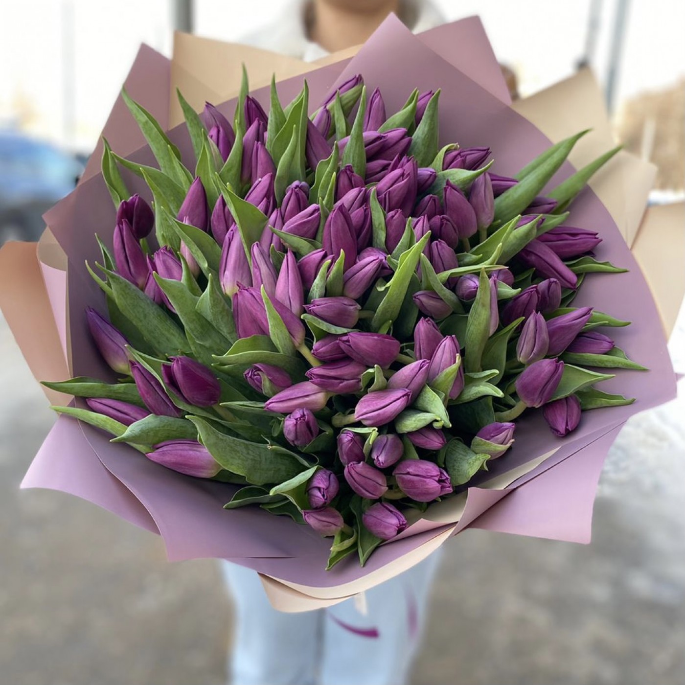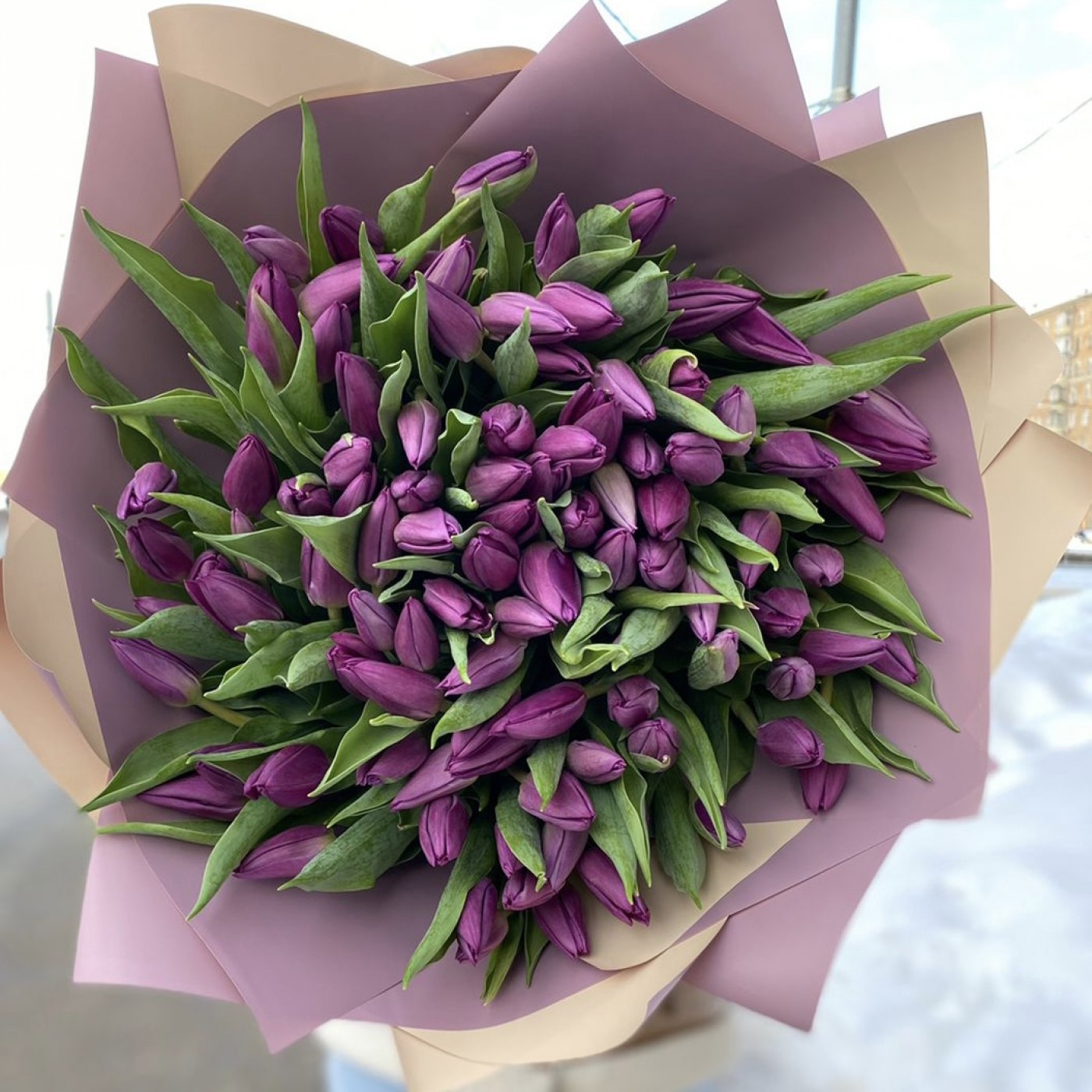 Букет из 101 фиолетового тюльпана. Удивите получателя необычным букетом на день рождения или праздник 8 марта.