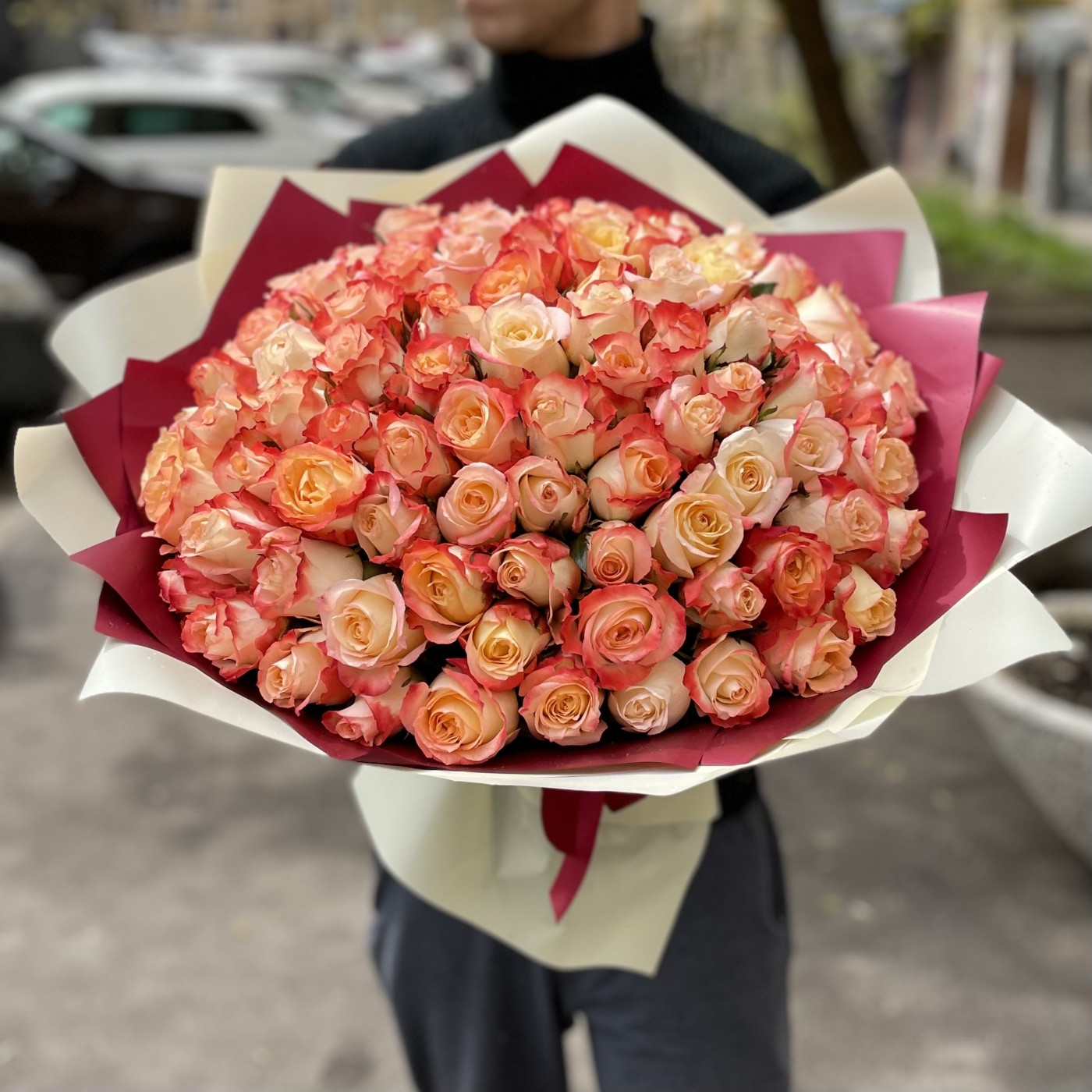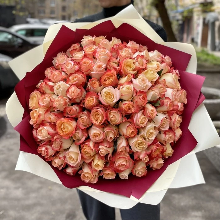 Порадуйте композицией из 101 розы Кабаре своих близких - а мы обеспечим свежесть и эстетику каждого цветка, бережную сборку и быструю круглосуточную доставку по Москве и Подмосковью.