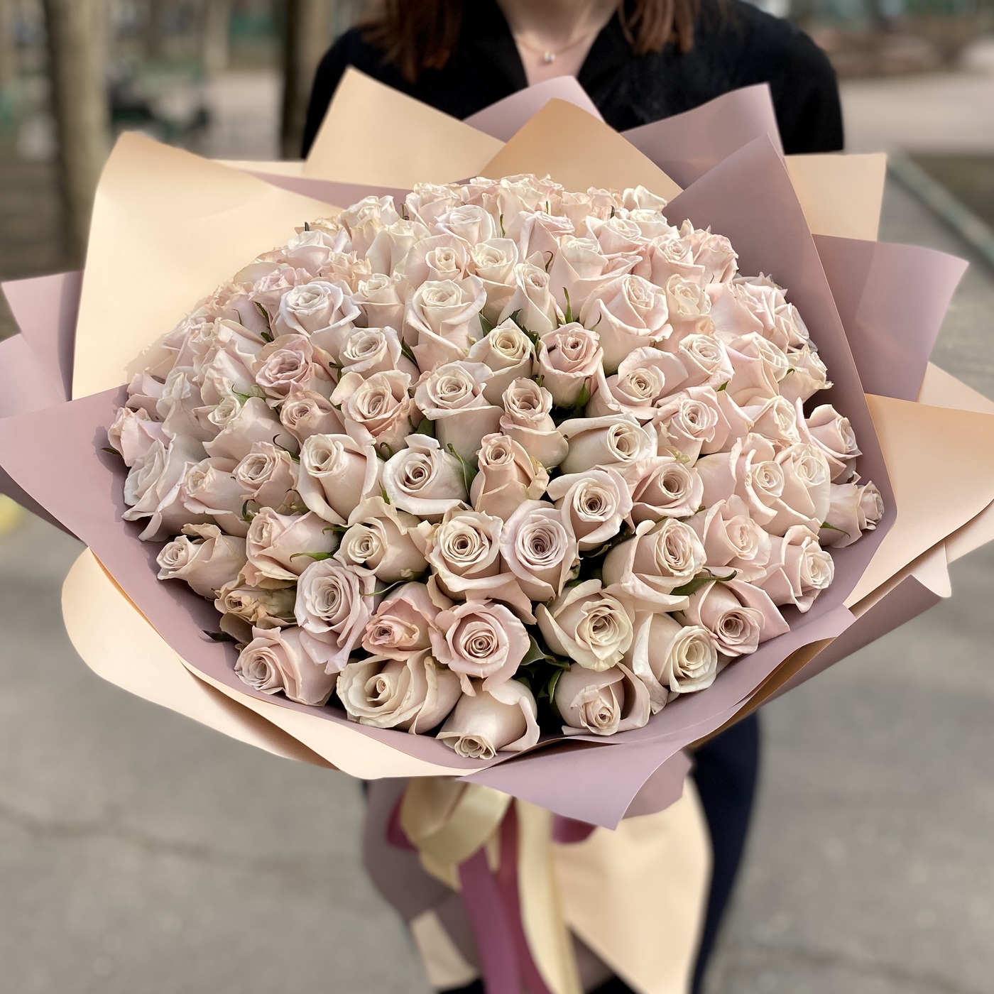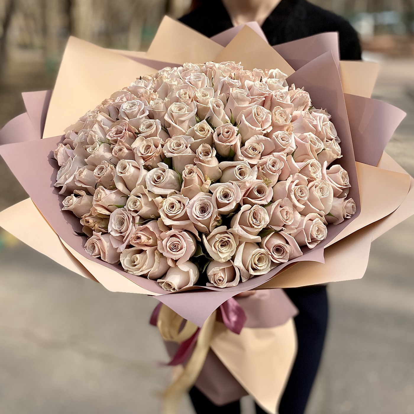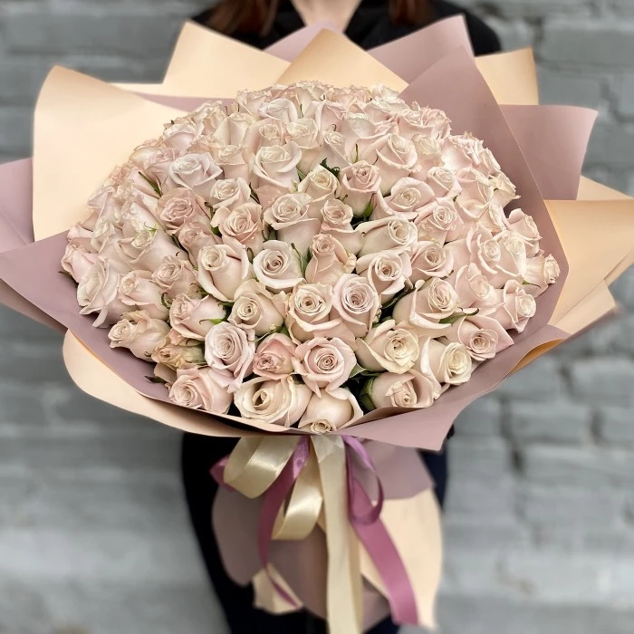 Букет из необыкновенной 101 розы сорта “Мента” высотой 40 сантиметров. Если вы хотите удивить необычными розами своего получателя, тогда остановите свой выбор на этом букете. Нежные розы сорта “Мента” имеют необычный кремовый, пыльный цвет и тонкий приятный аромат. Такие цветы придутся по вкусу как любимой девушке, так и бизнес-партнеру. Также букет можно преподнести на свадьбу, торжество, День Рождения или по любому поводу. Особенно приятно получить такой букет с доставкой на дом или в офис.