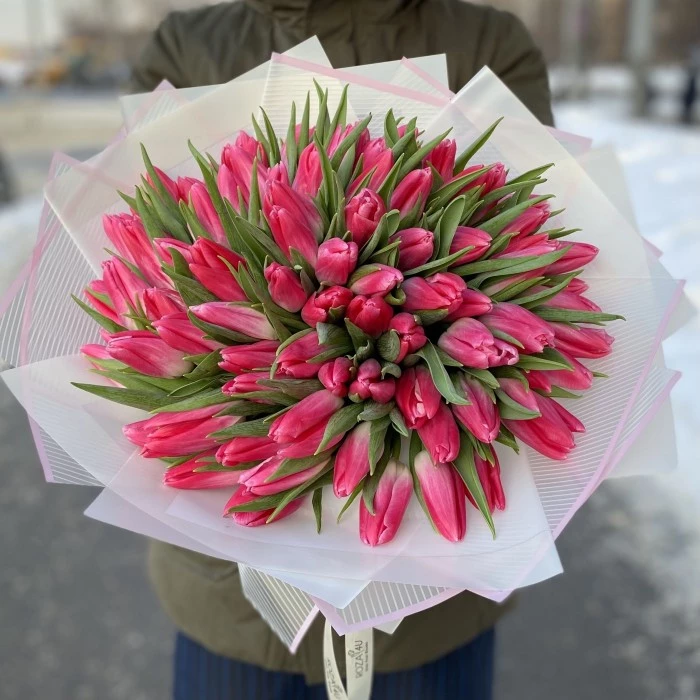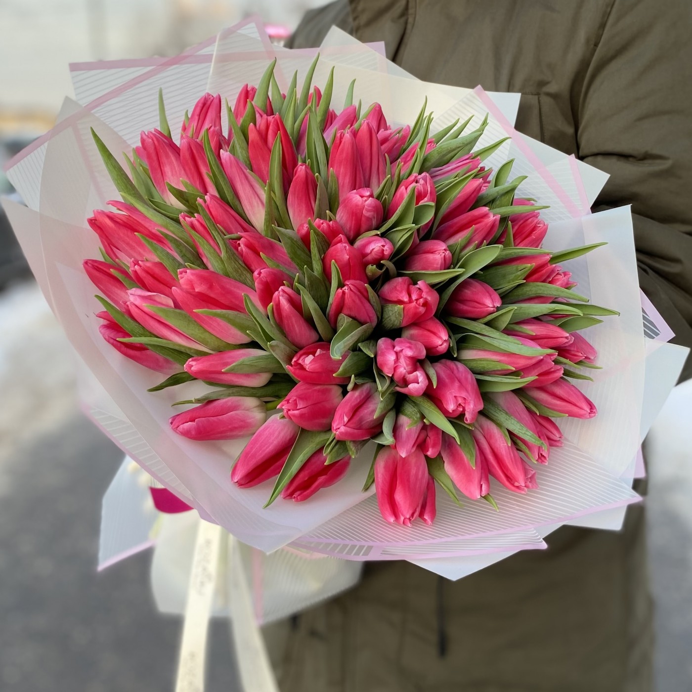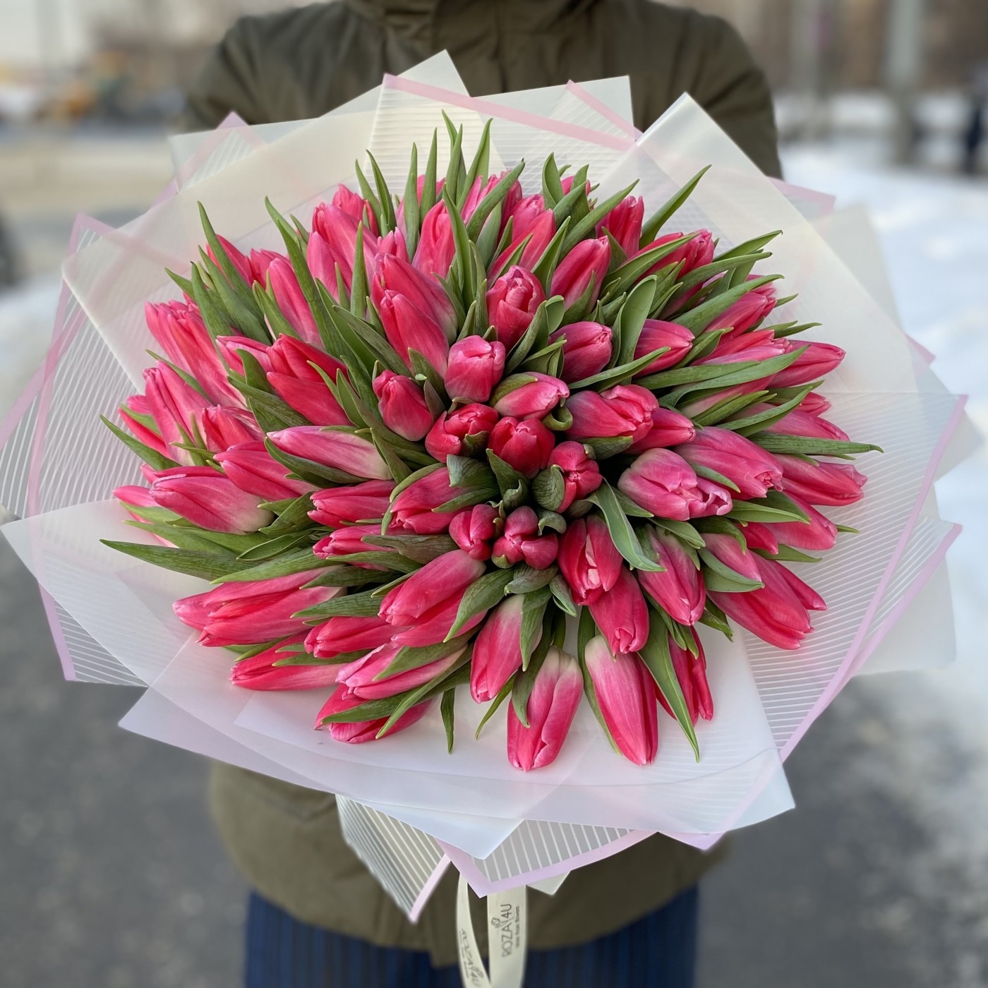 Букет из розового 101 тюльпана Болроял. Прекрасный вариант чтобы впечатлить на свою вторую половинку. Подарите большой букет тюльпанов на день рождения или юбилей.