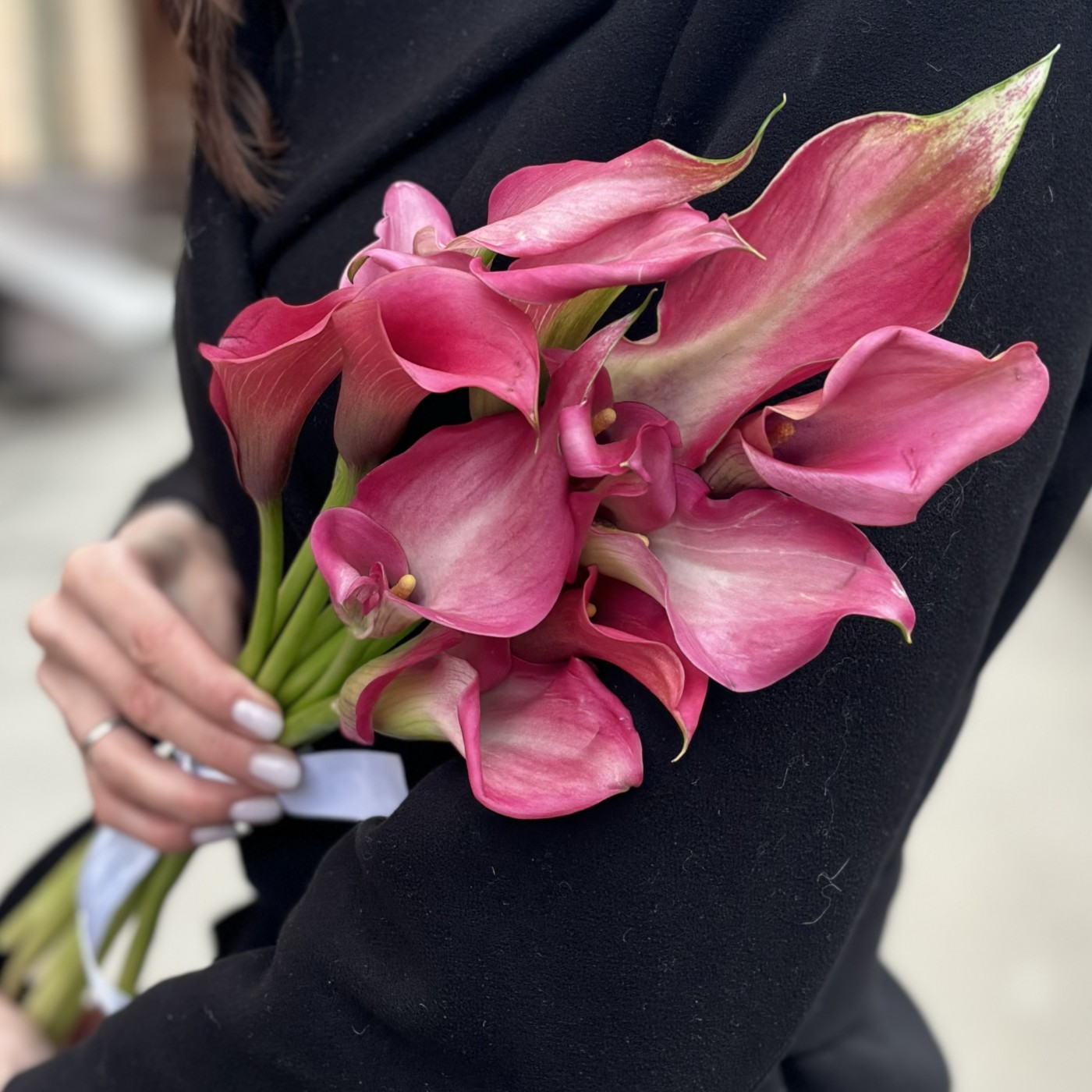 Этот букет из 11 малиновых калл – воплощение элегантности и страсти. Каллы, известные своим утонченным видом, имеют глубокий малиновый оттенок, который символизирует романтику и глубокие чувства. Их гладкие, воронкообразные лепестки создают впечатление роскоши и изысканности, привлекая внимание своим ярким цветом и утонченной формой. Лента придает букету завершенность и добавляет нотку торжественности, делая его еще более привлекательным и презентабельным.