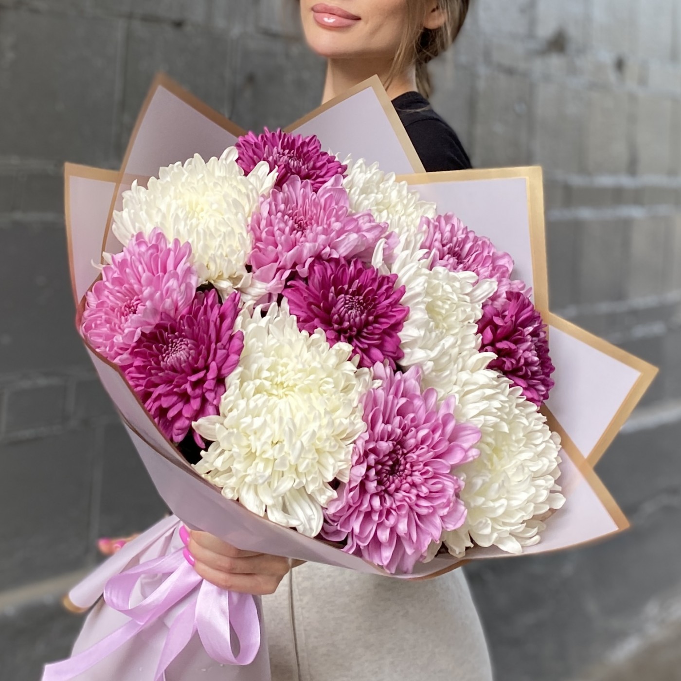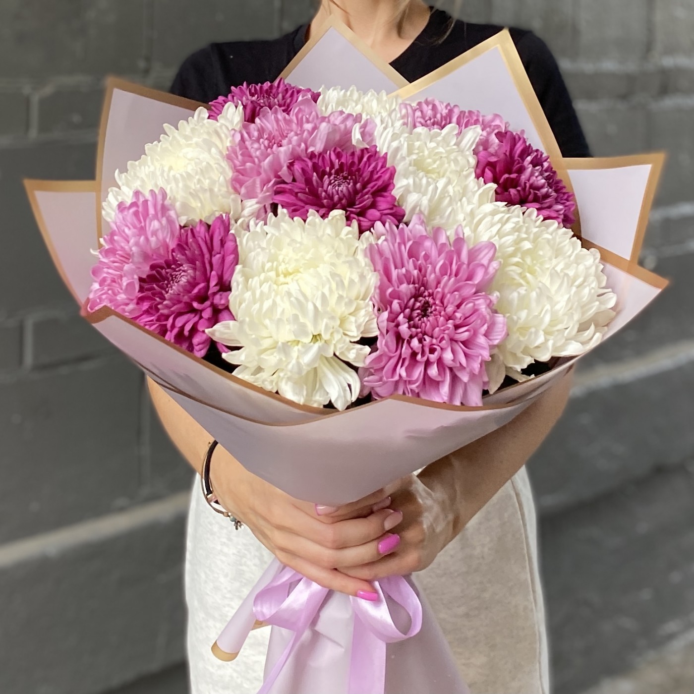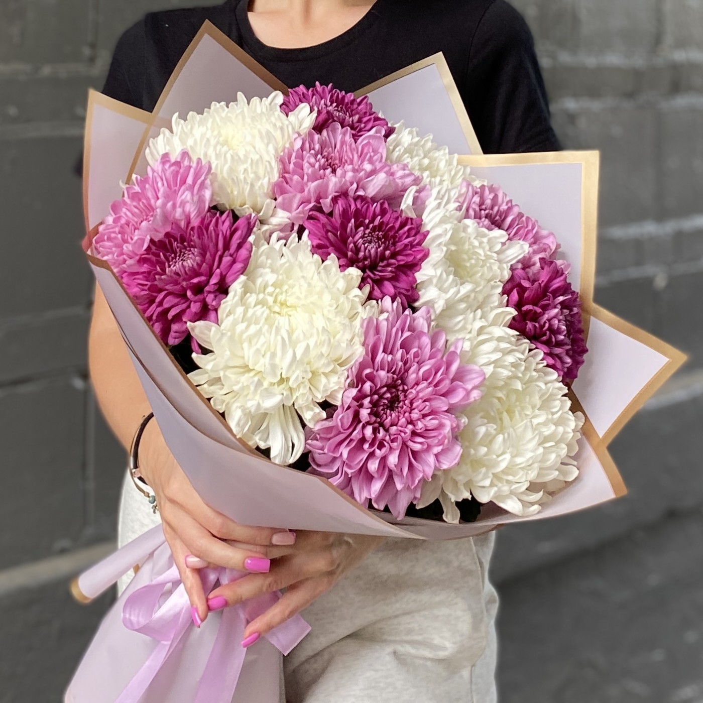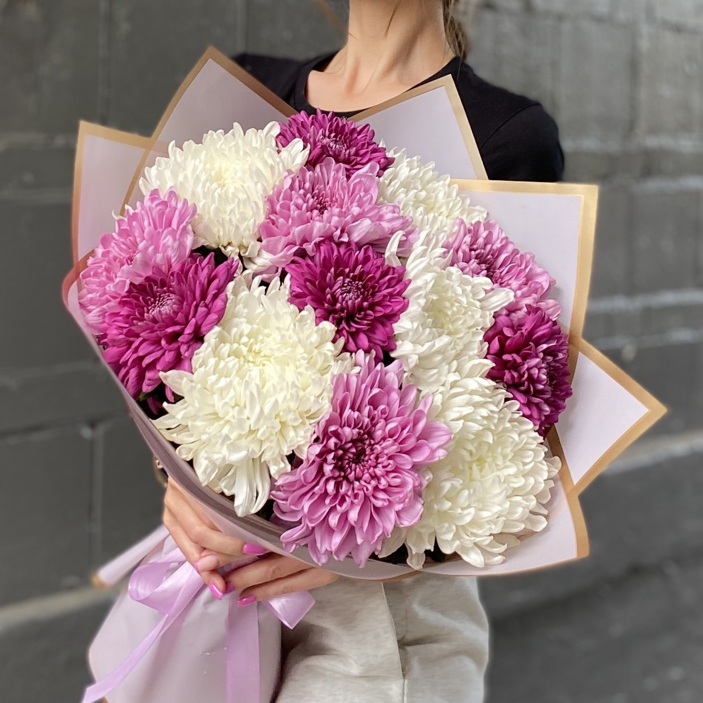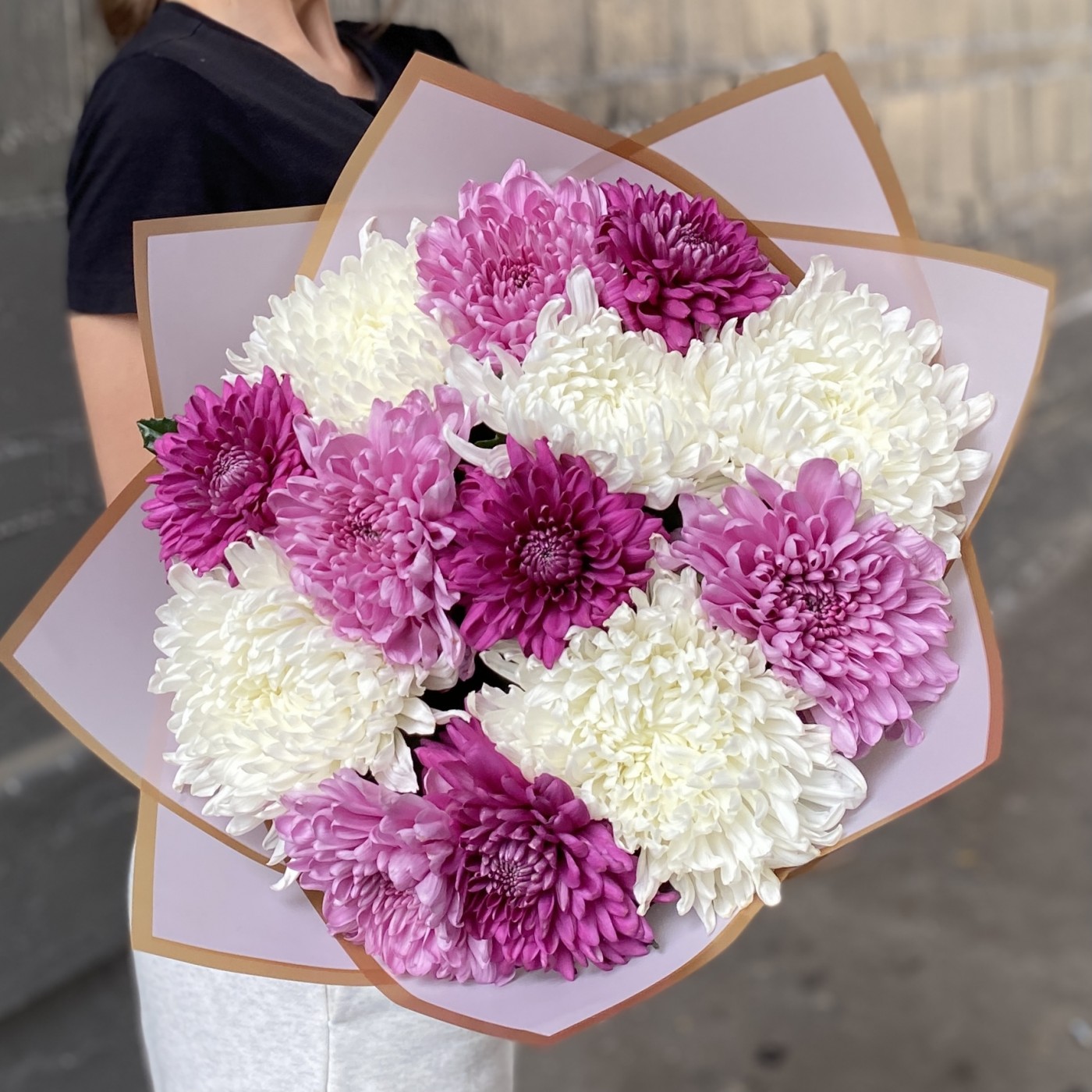 Букет из 13 белых, фиолетовых и сиреневых крупных хризантем отлично подойдет для поздравления учительницы или коллеги.