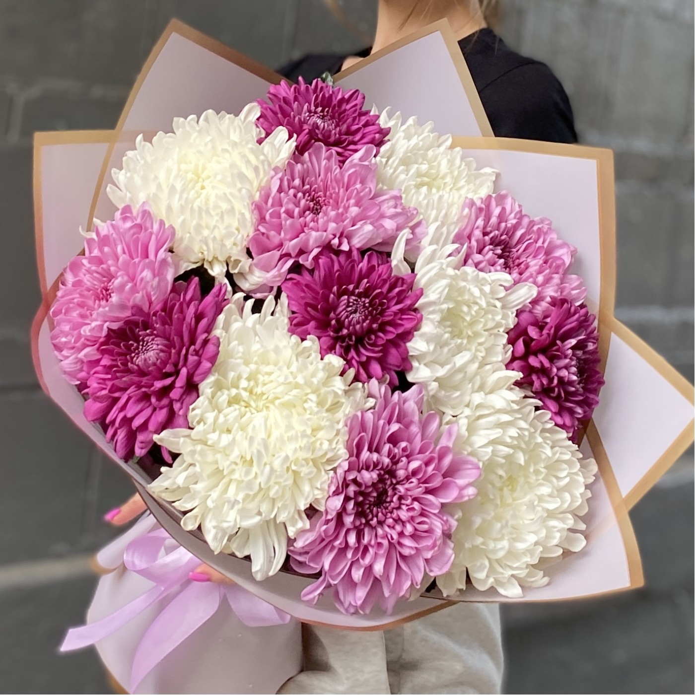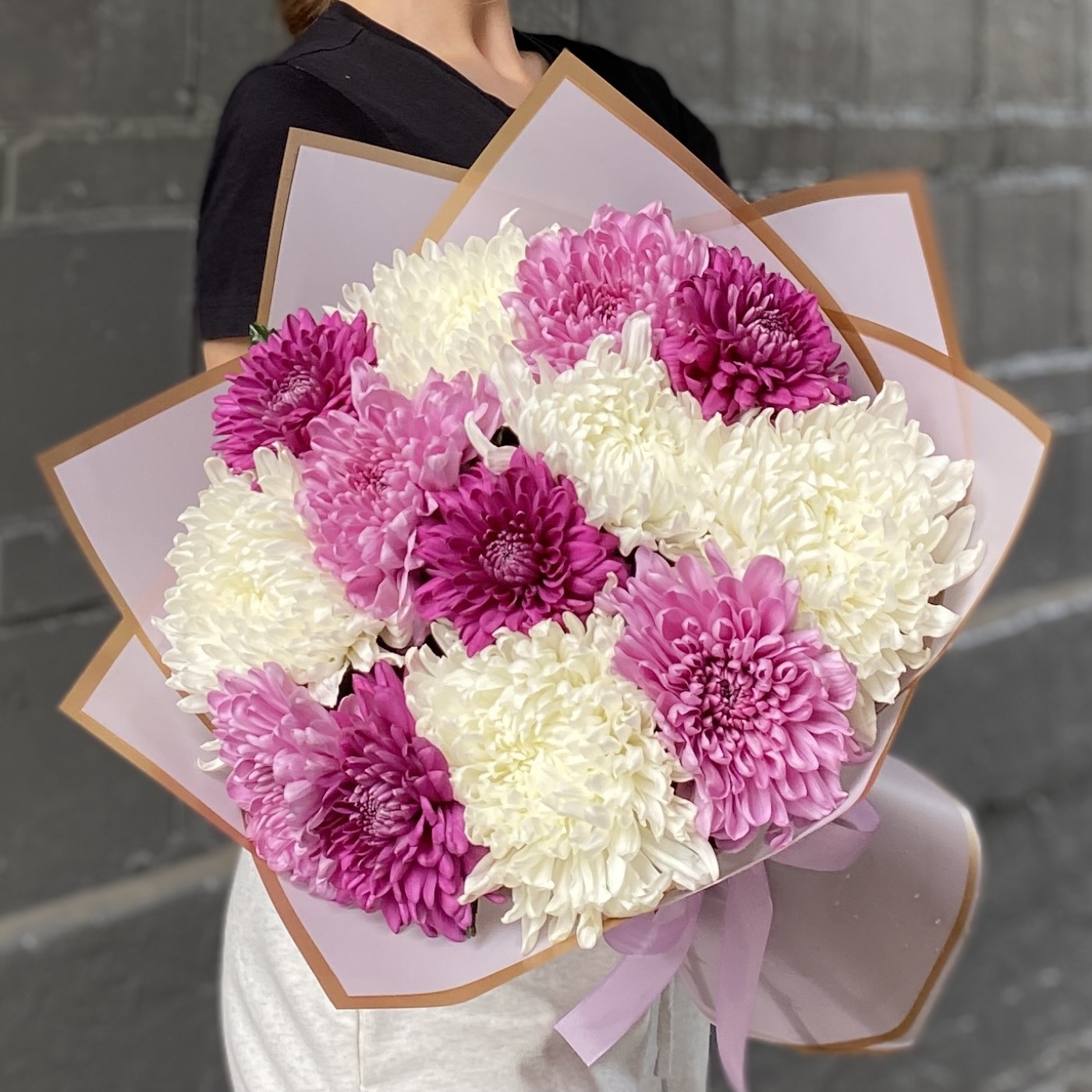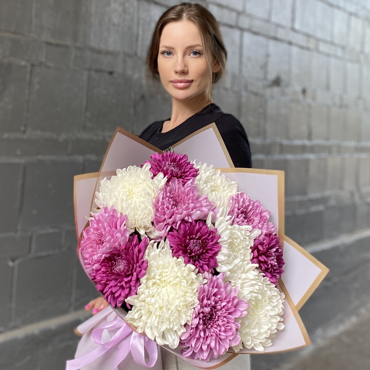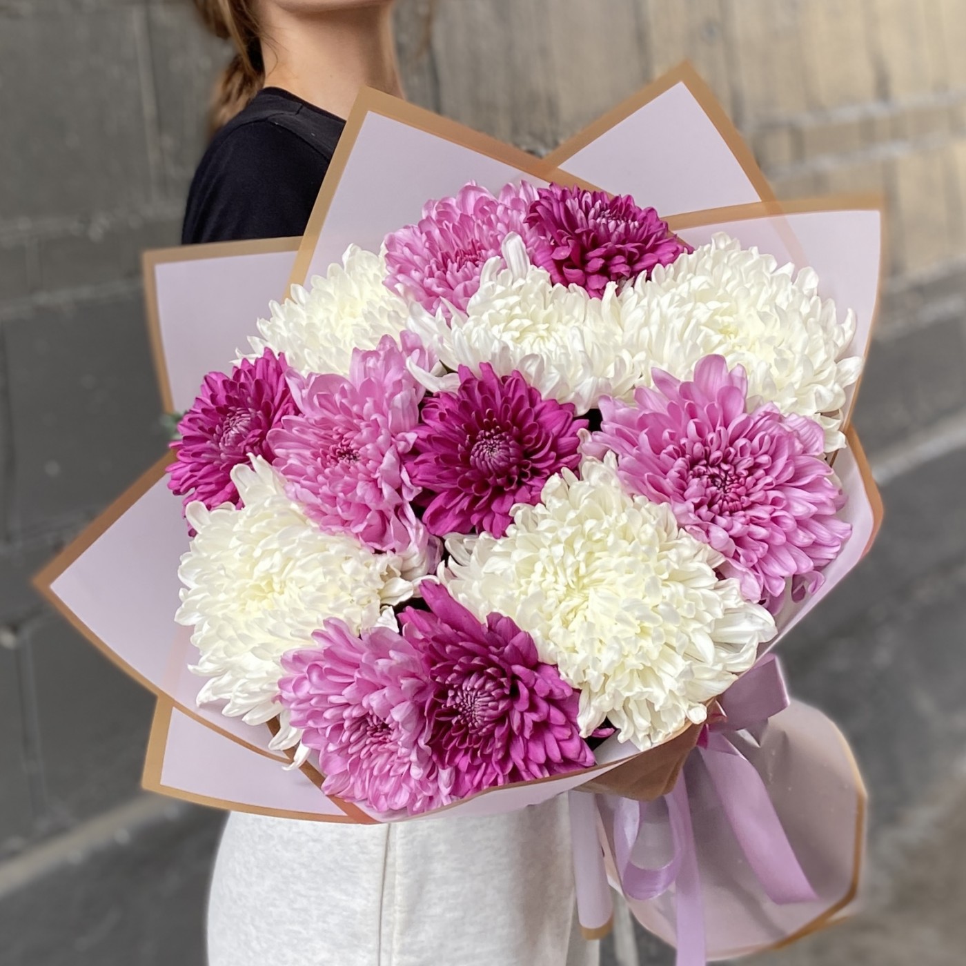 Букет из 13 белых, фиолетовых и сиреневых крупных хризантем отлично подойдет для поздравления учительницы или коллеги.