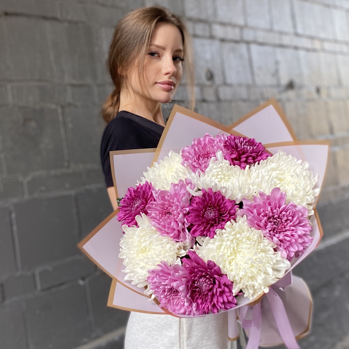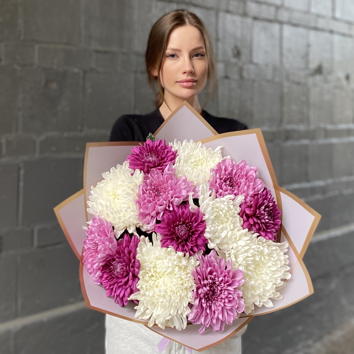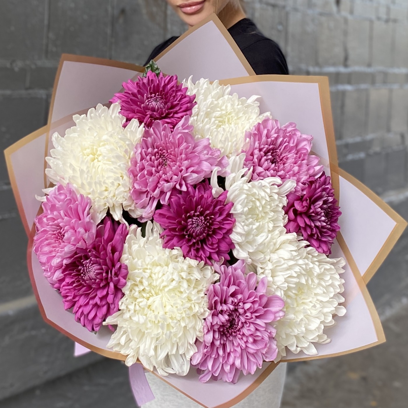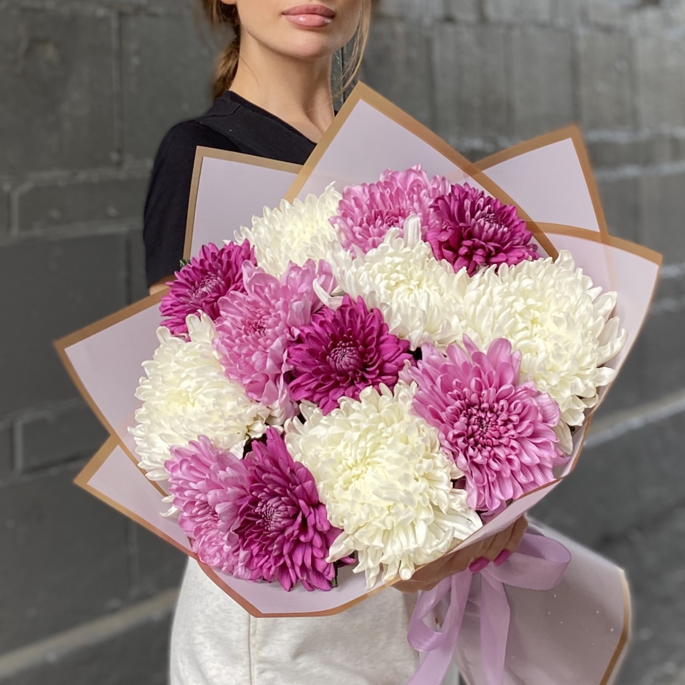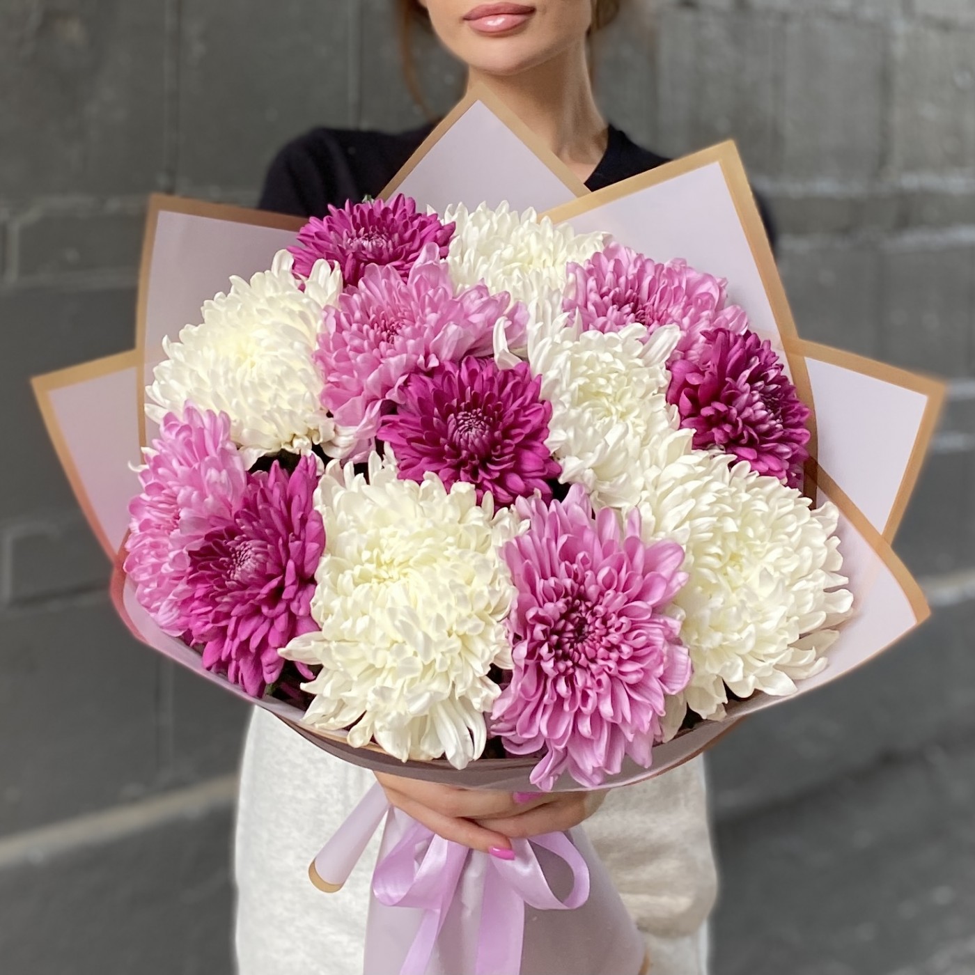 Букет из 13 белых, фиолетовых и сиреневых крупных хризантем отлично подойдет для поздравления учительницы или коллеги.