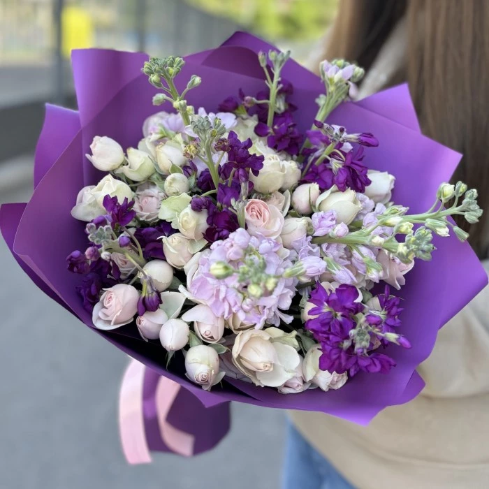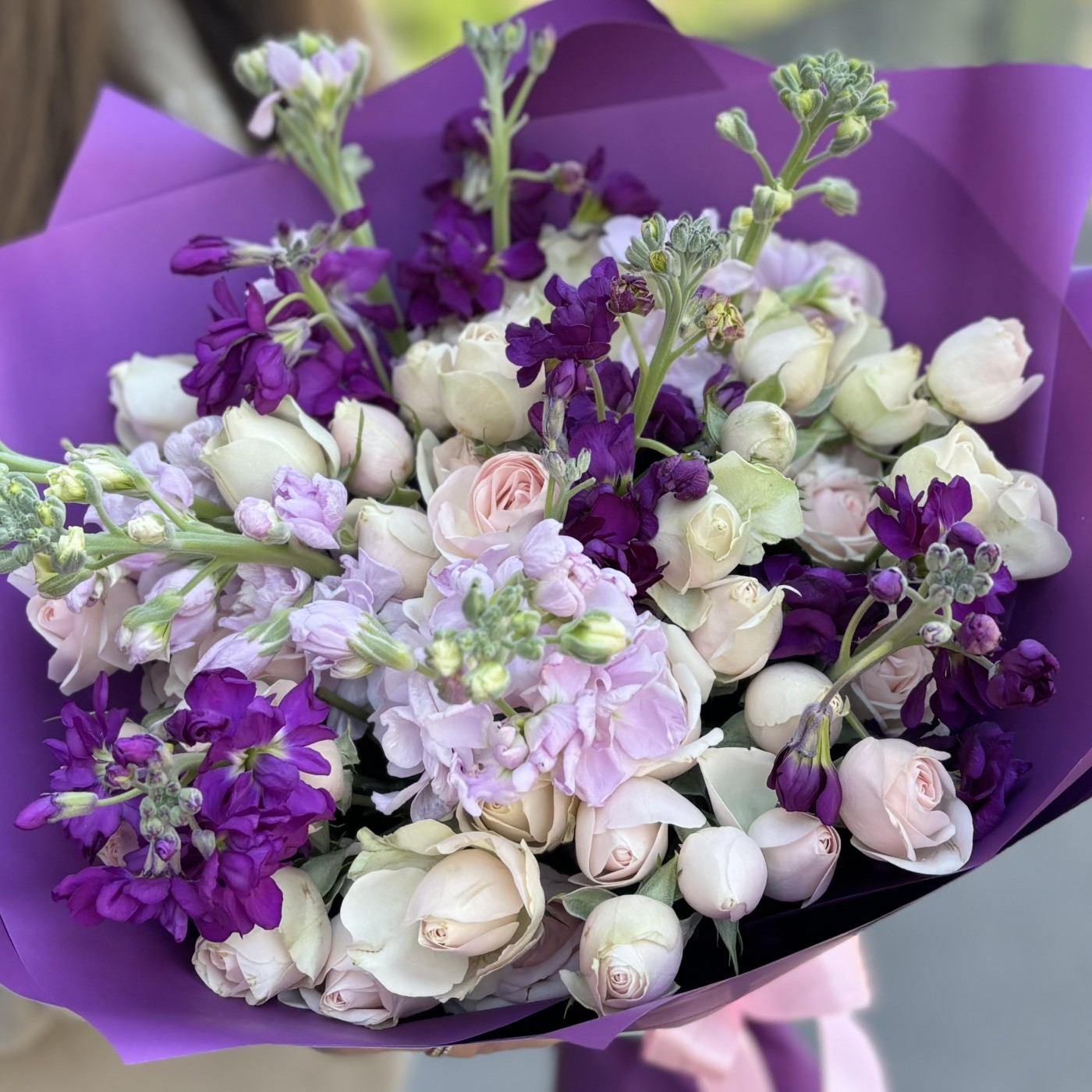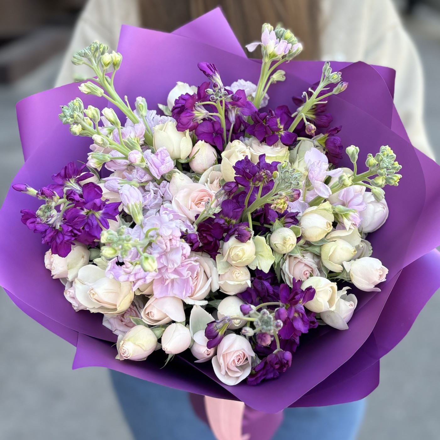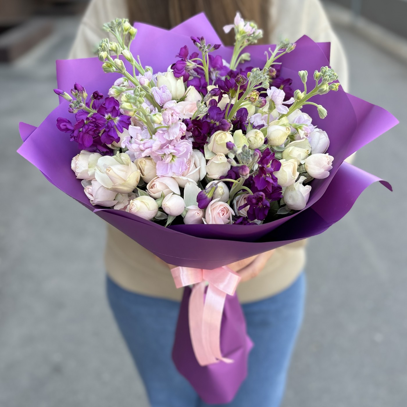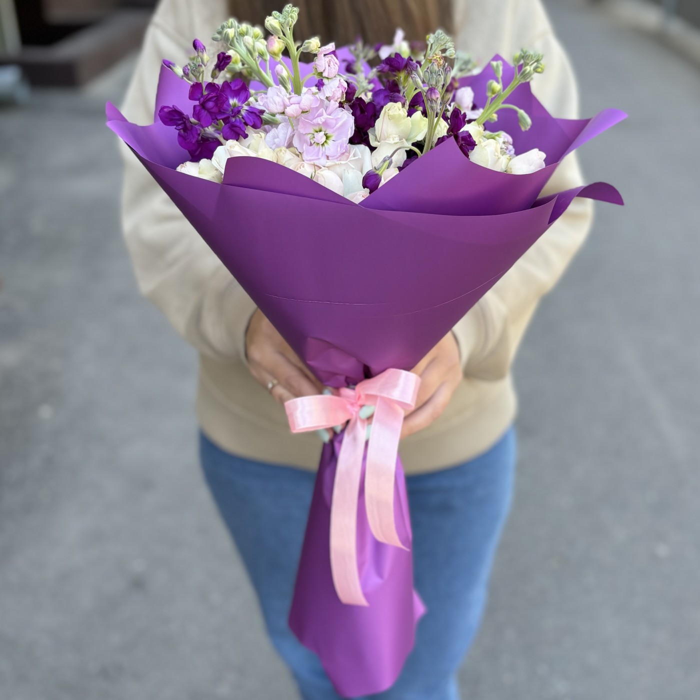 Легкий и нежный букет из ароматных маттиол и пионовидной кустовой розы Свит Блоссом, подарит чарующий аромат.