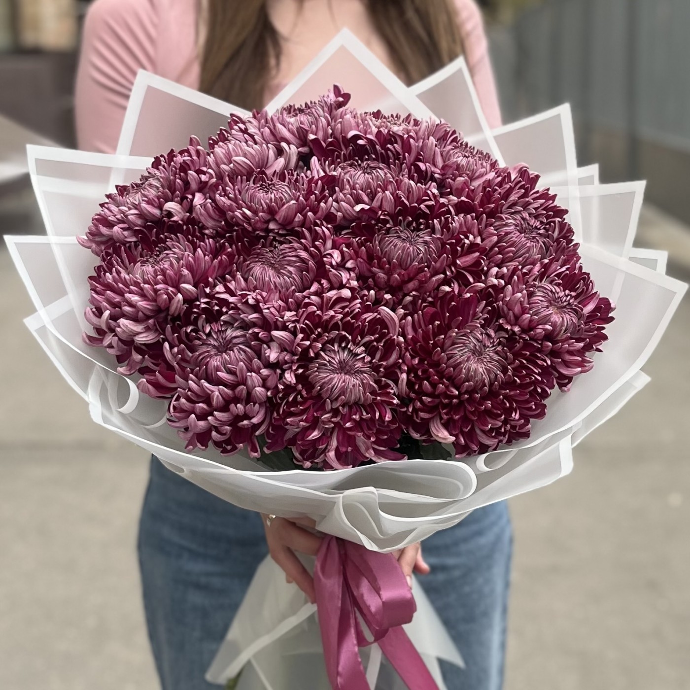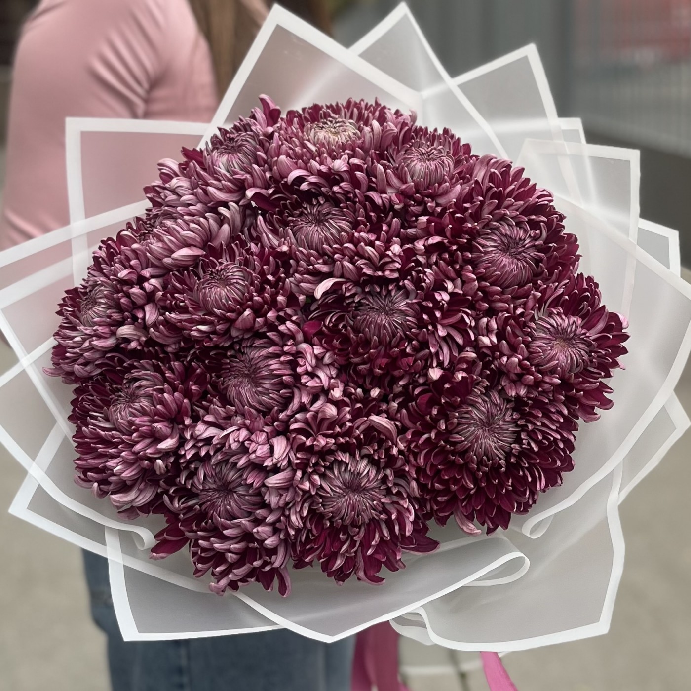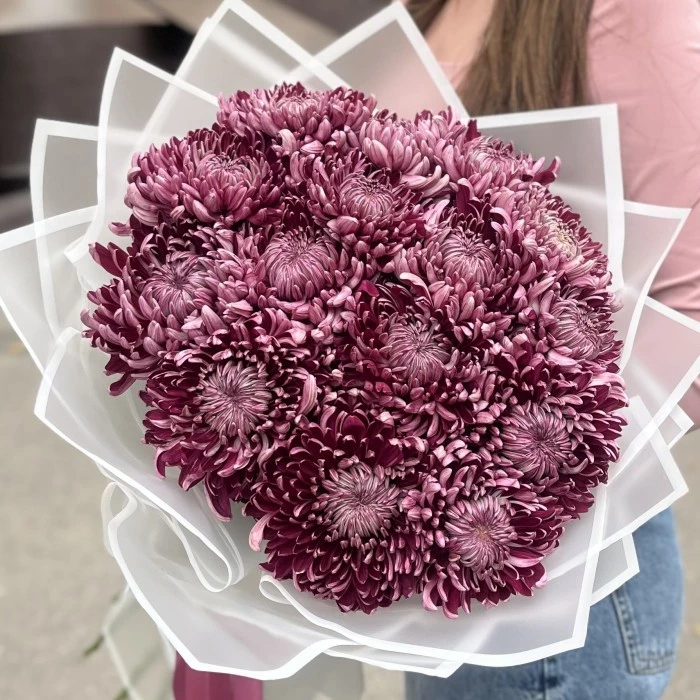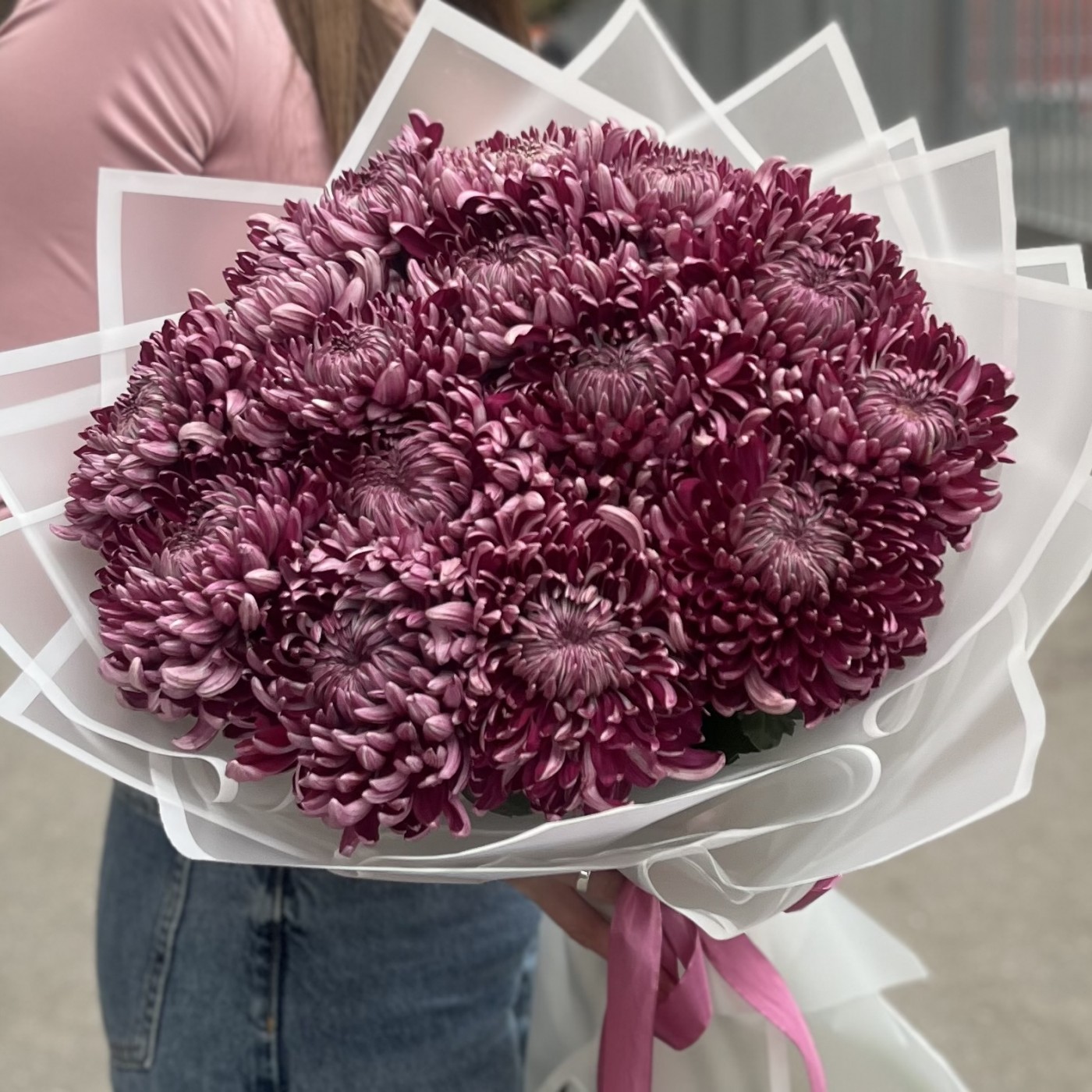 Букет из 15 крупных фиолетовых хризантем не оставит свою получательницу равнодушной.