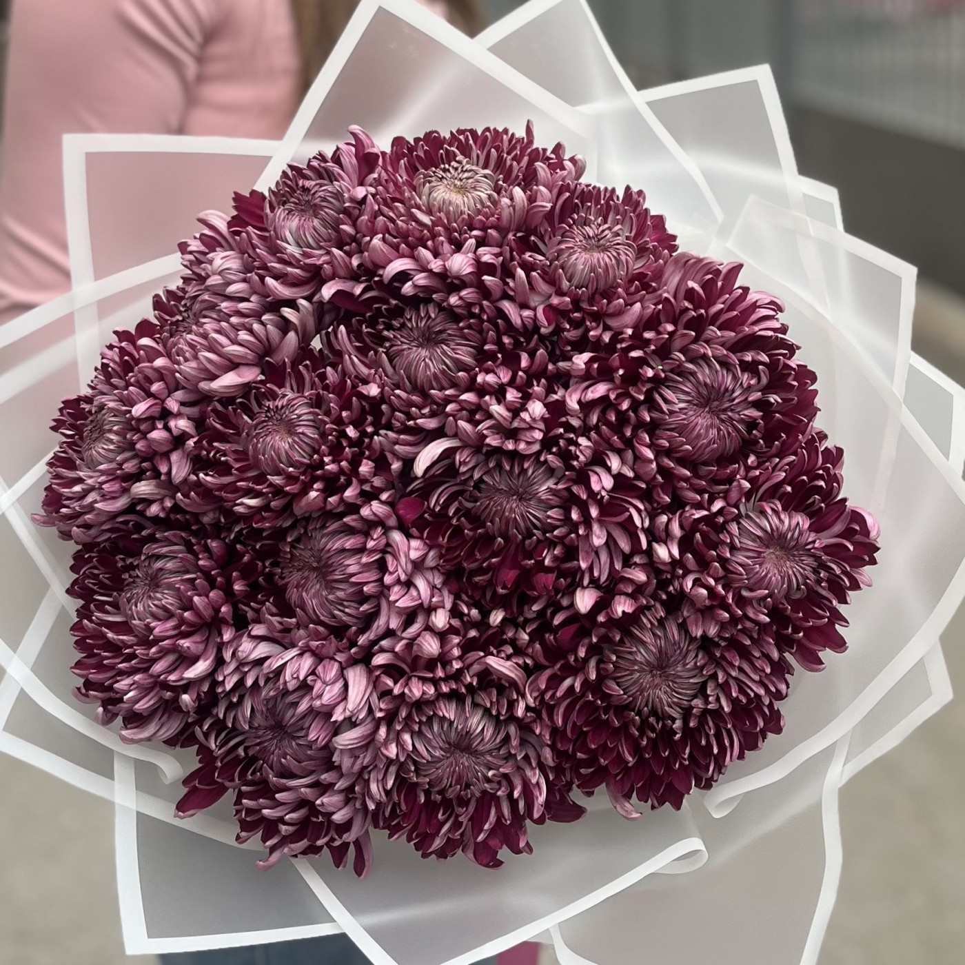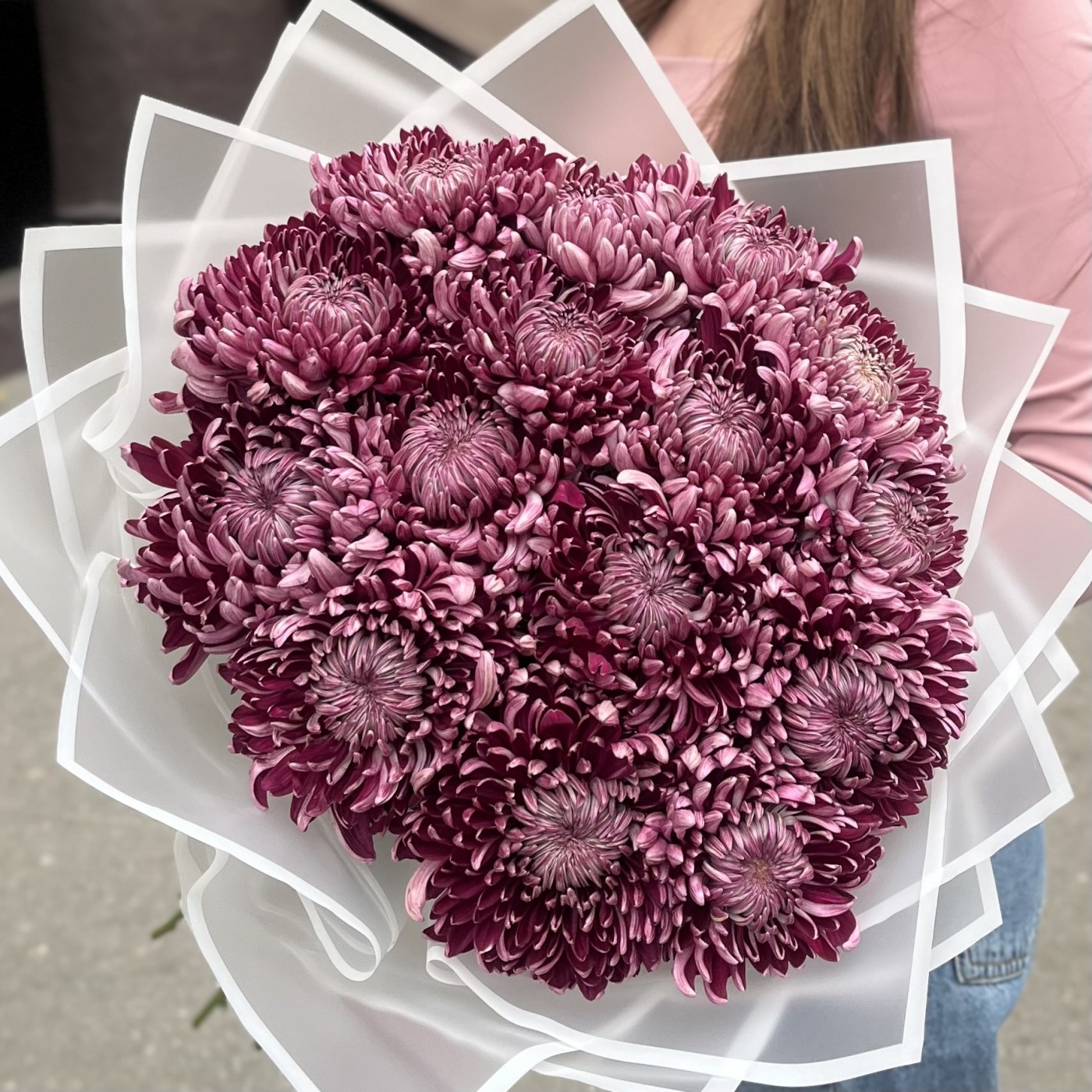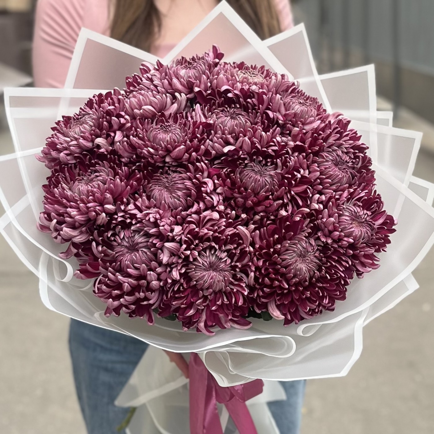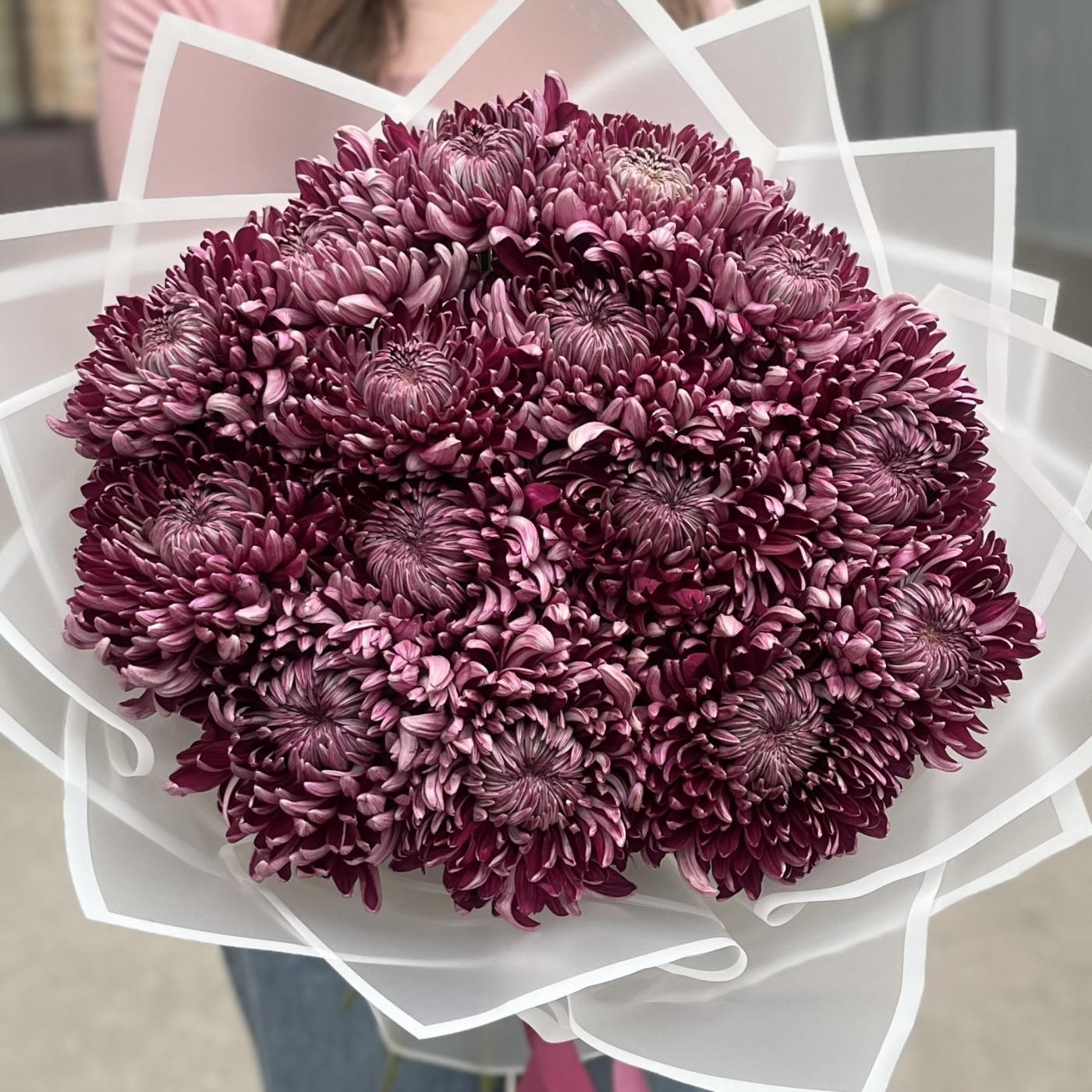 Букет из 15 крупных фиолетовых хризантем не оставит свою получательницу равнодушной.