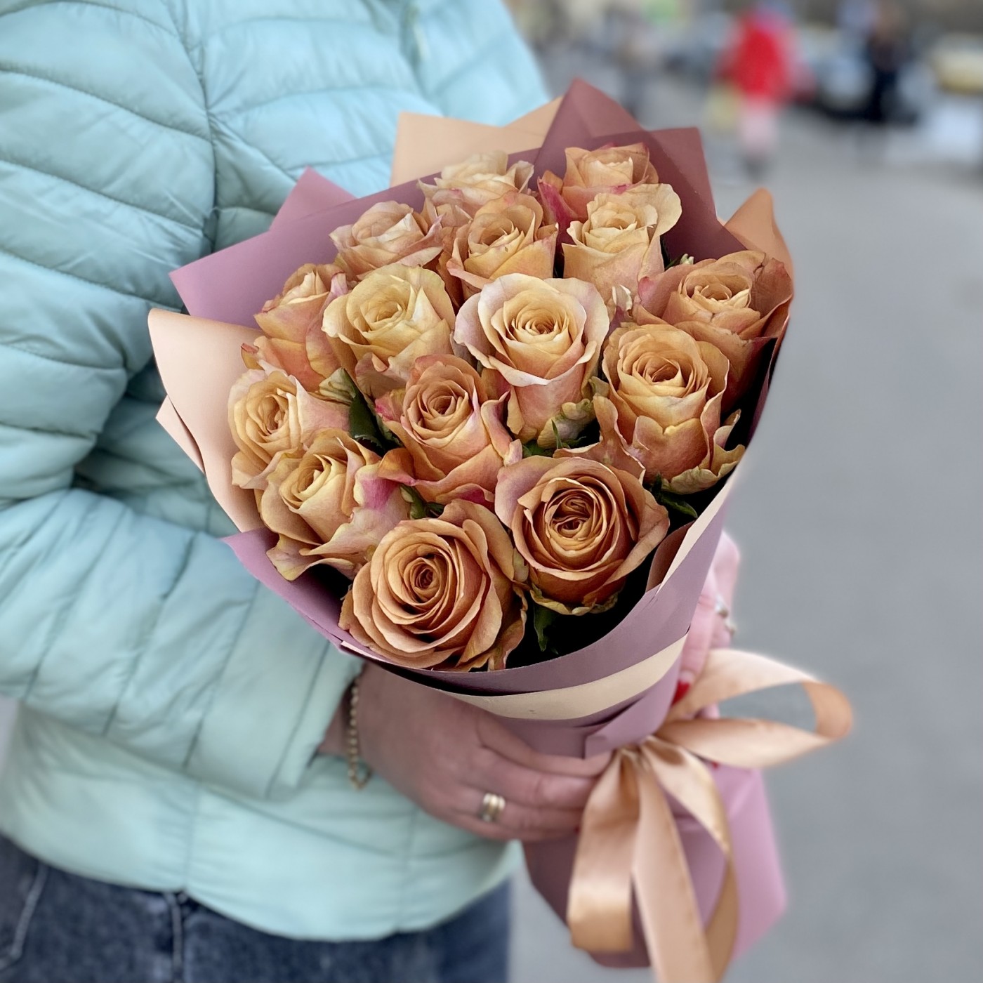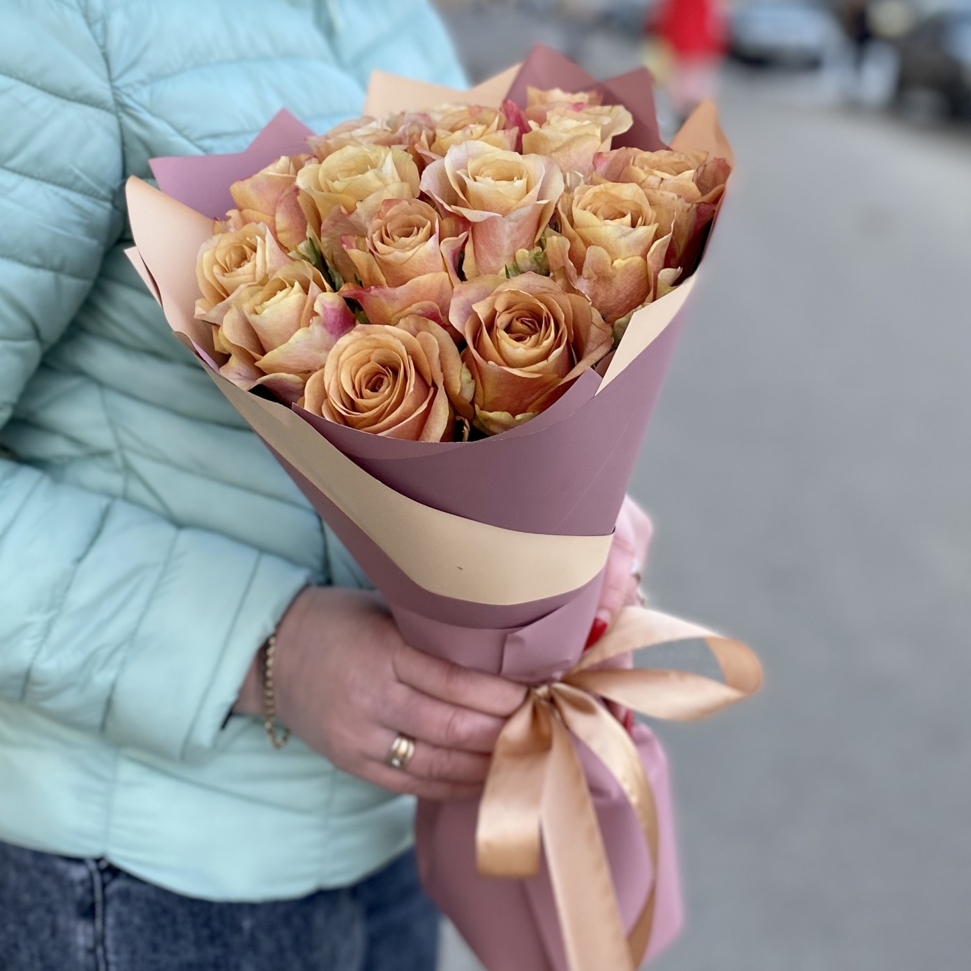 Небольшой и изящный букетик кремовых роз "Симбол" оригинального приглушенного оттенка. Роза смотрится как интересное дополнение к другим цветам в букете, а так же великолепно выглядит в моно композиции.