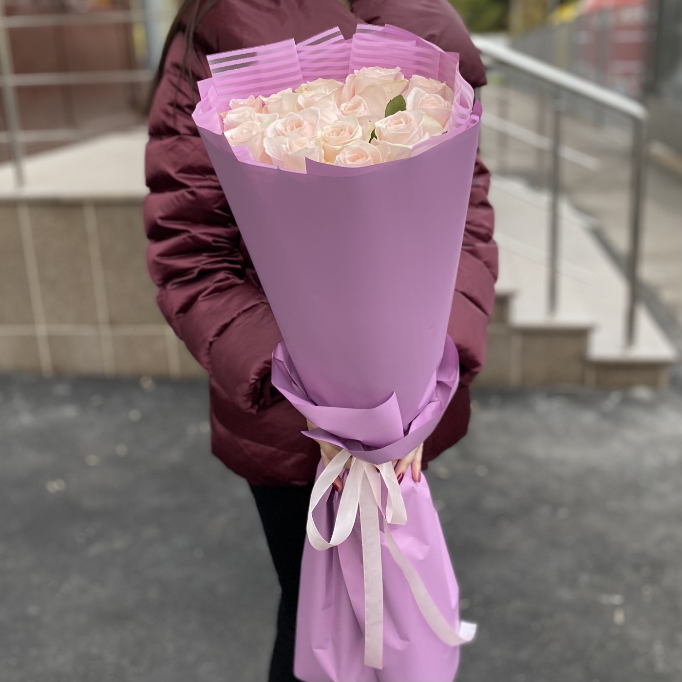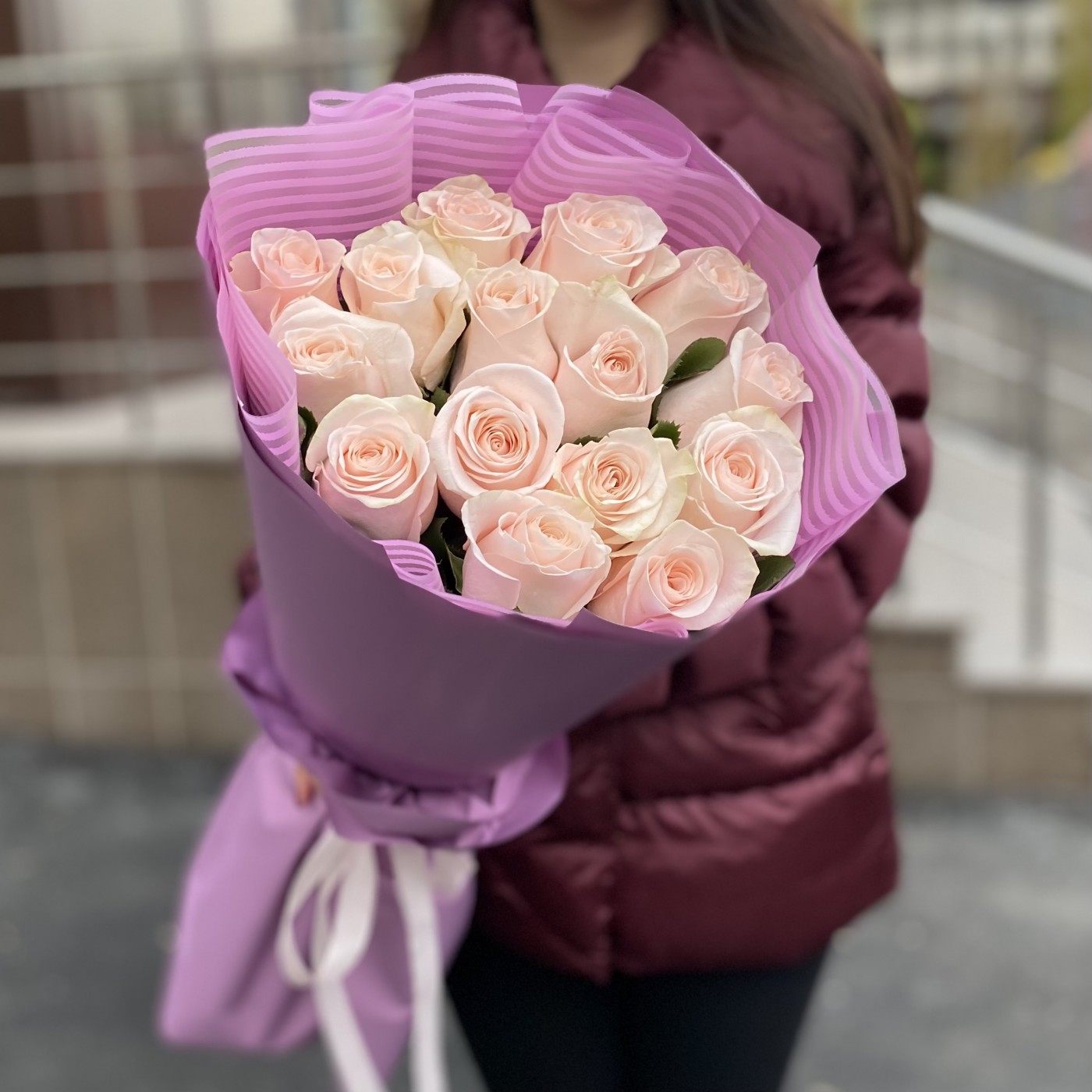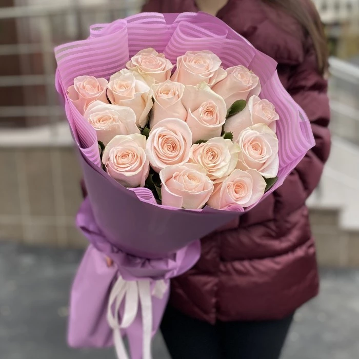Букет из 15 высоких роз сорта Помароса отлично подойдет в качестве приятного сюрприза на первое свидание или как подарок для вашей подруги или коллеги в день рождения.