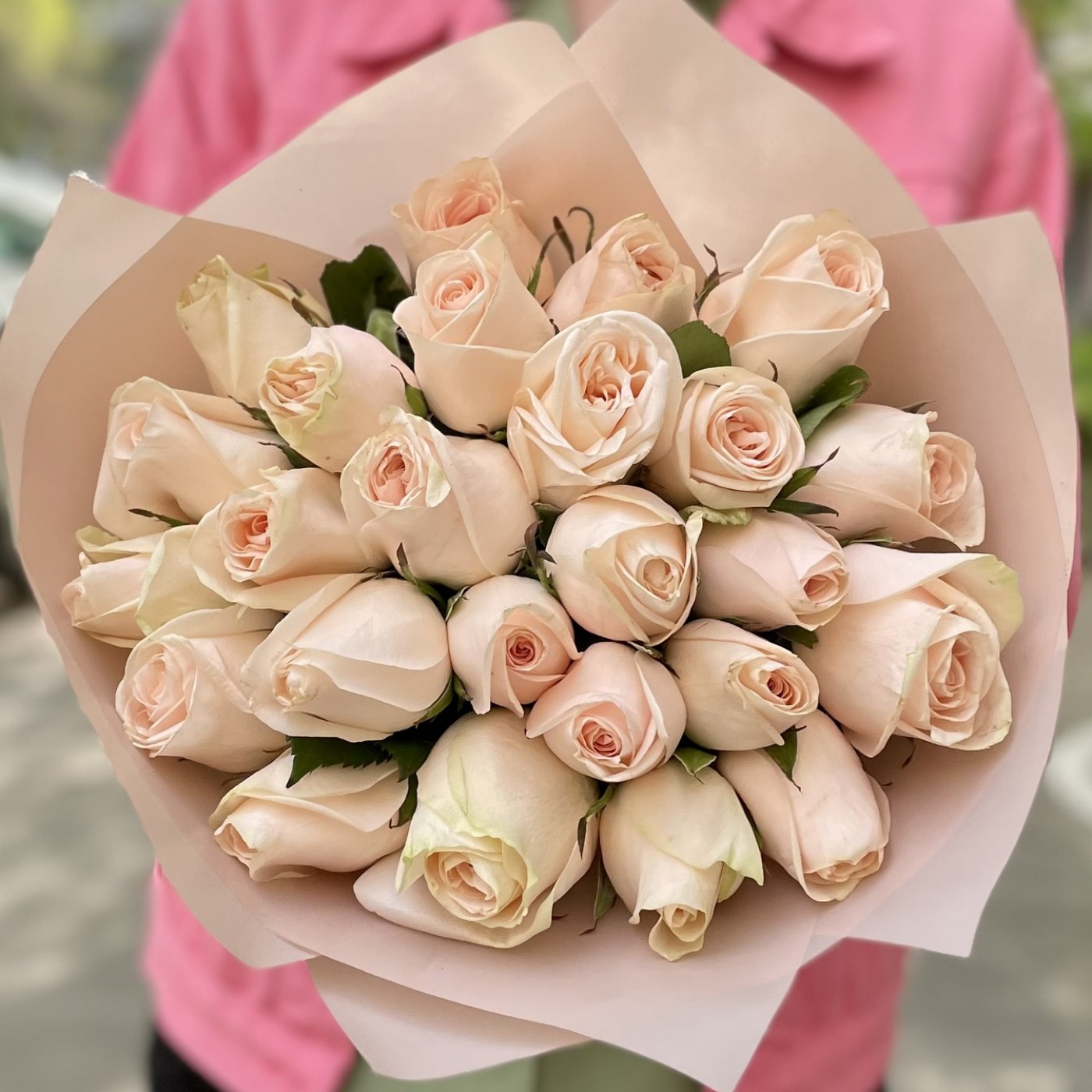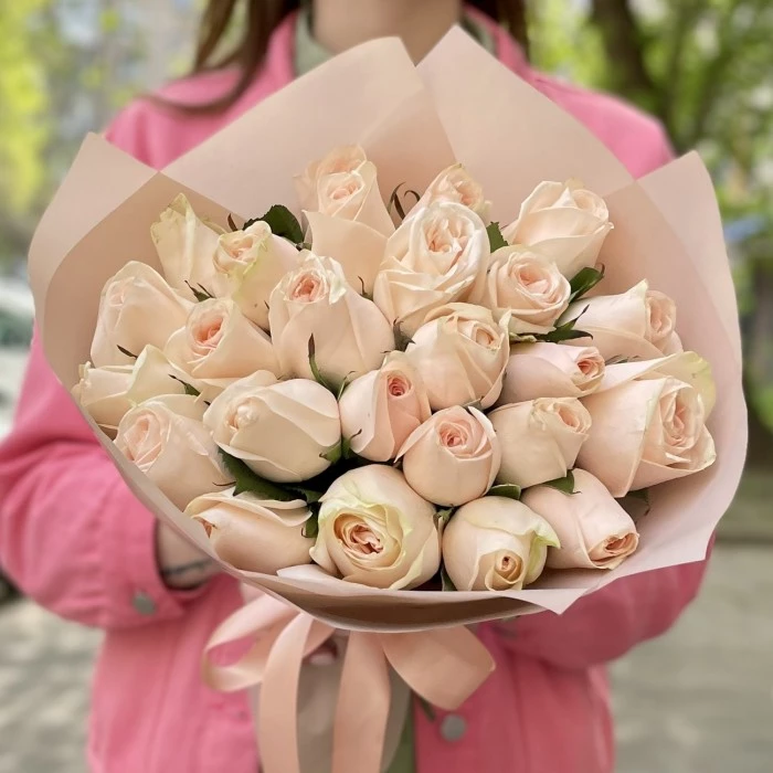 Букет из нежно-розовых роз сорта Веддинг Роуз в упаковке. Такой букет можно преподнести в качестве комплимента или подарить учителю на день знаний или выпускной. Нежные розы понравятся получателя и поднимут настроение.