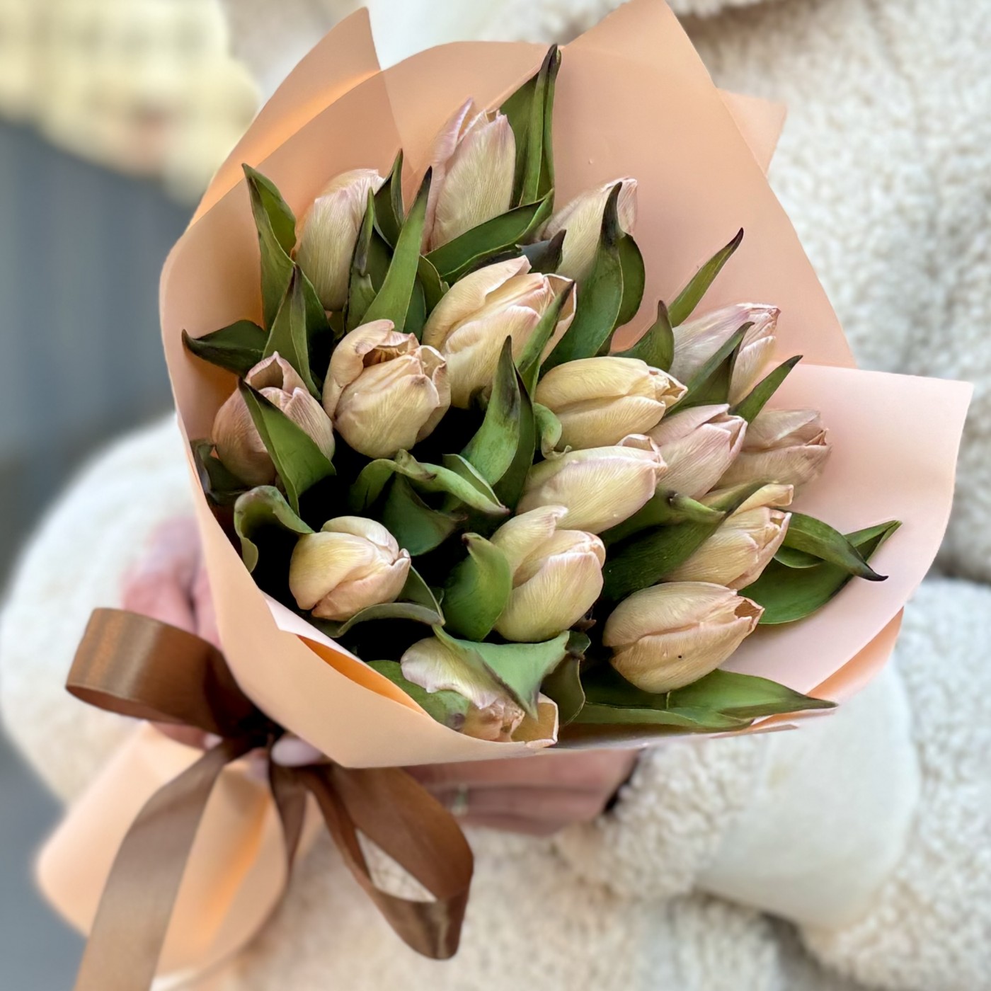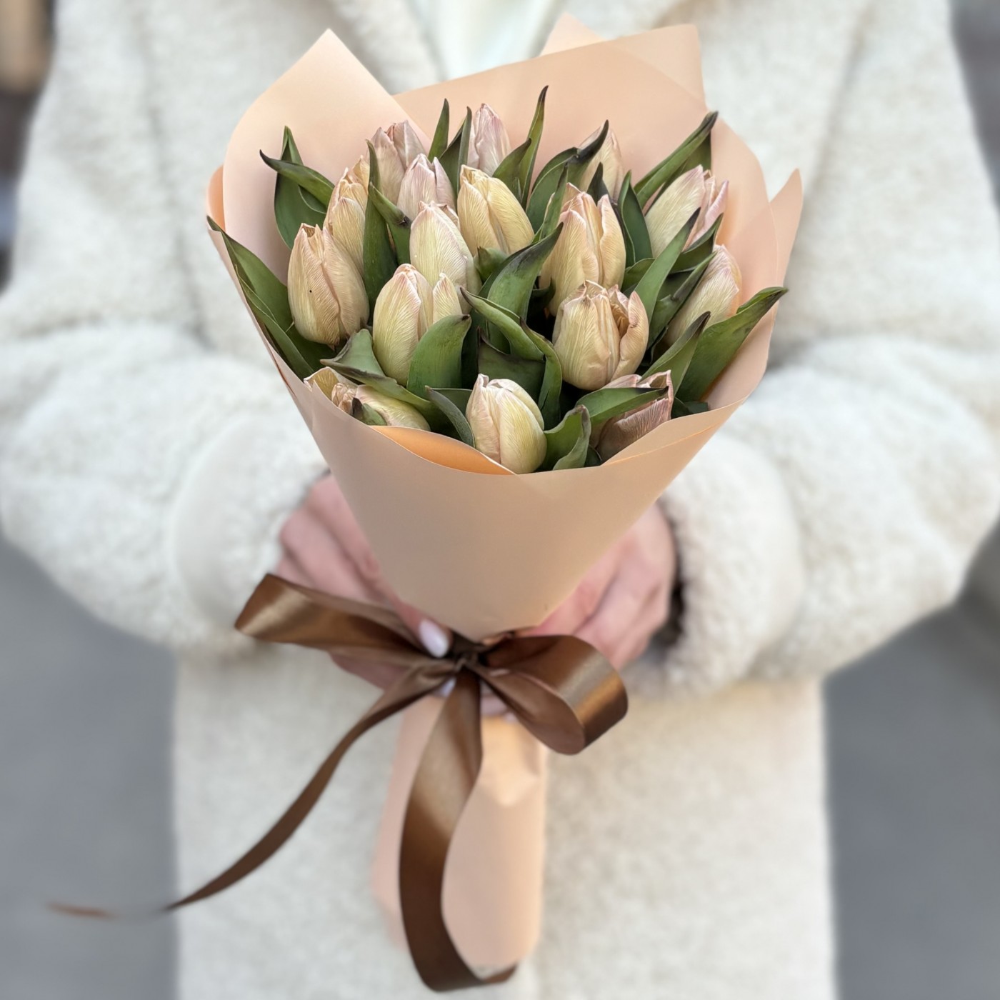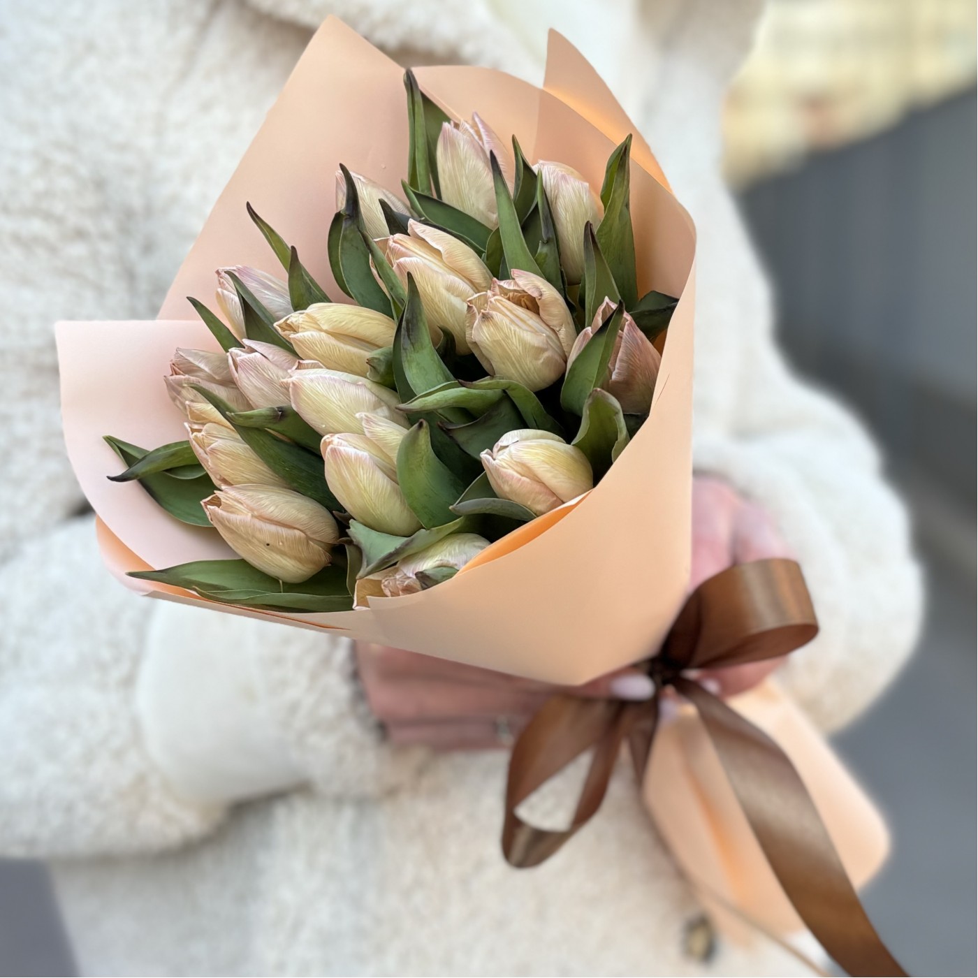 Букет из крашеных тюльпанов кофейного цвета Мокко прекрасно подойдет в качестве подарка на 8 марта. Букет