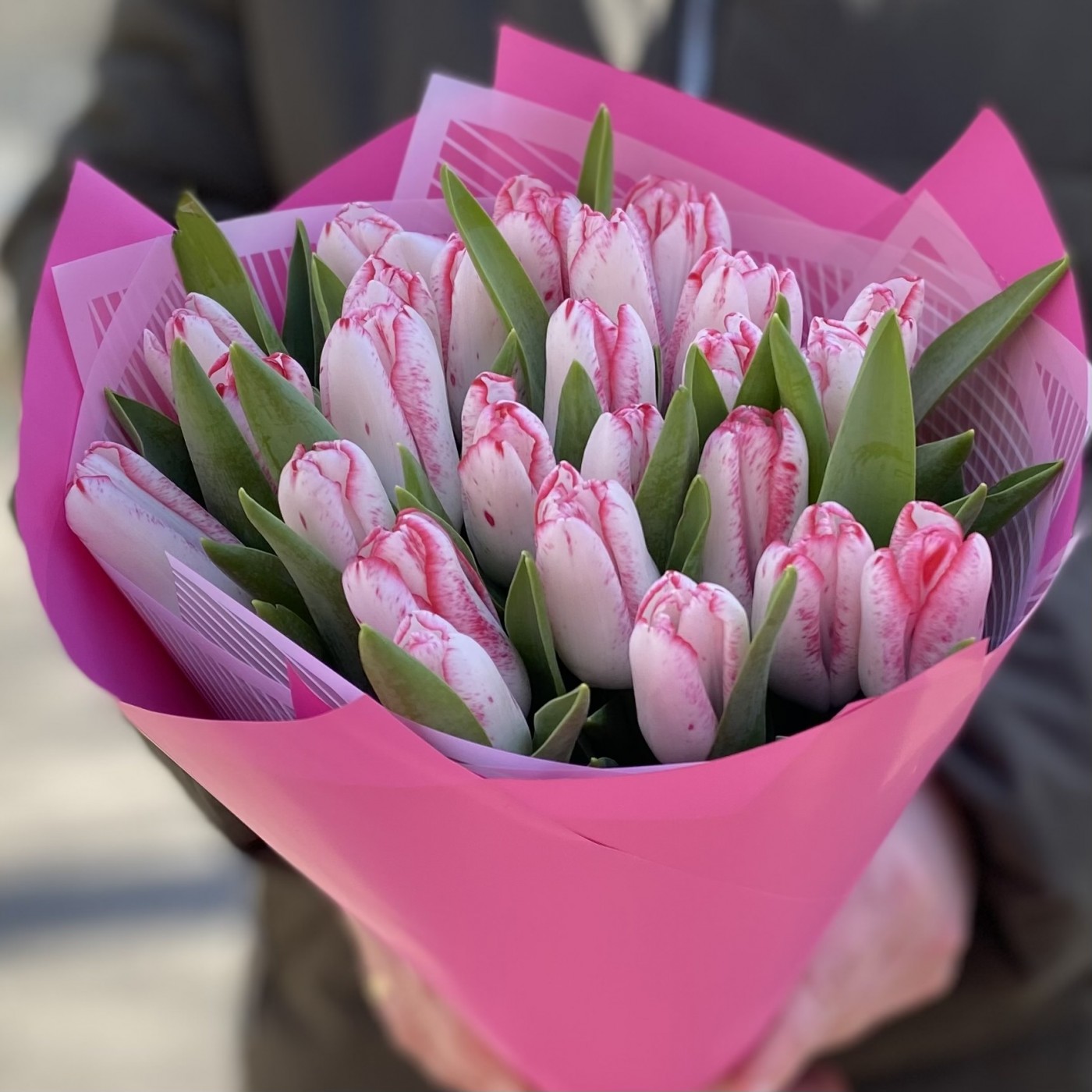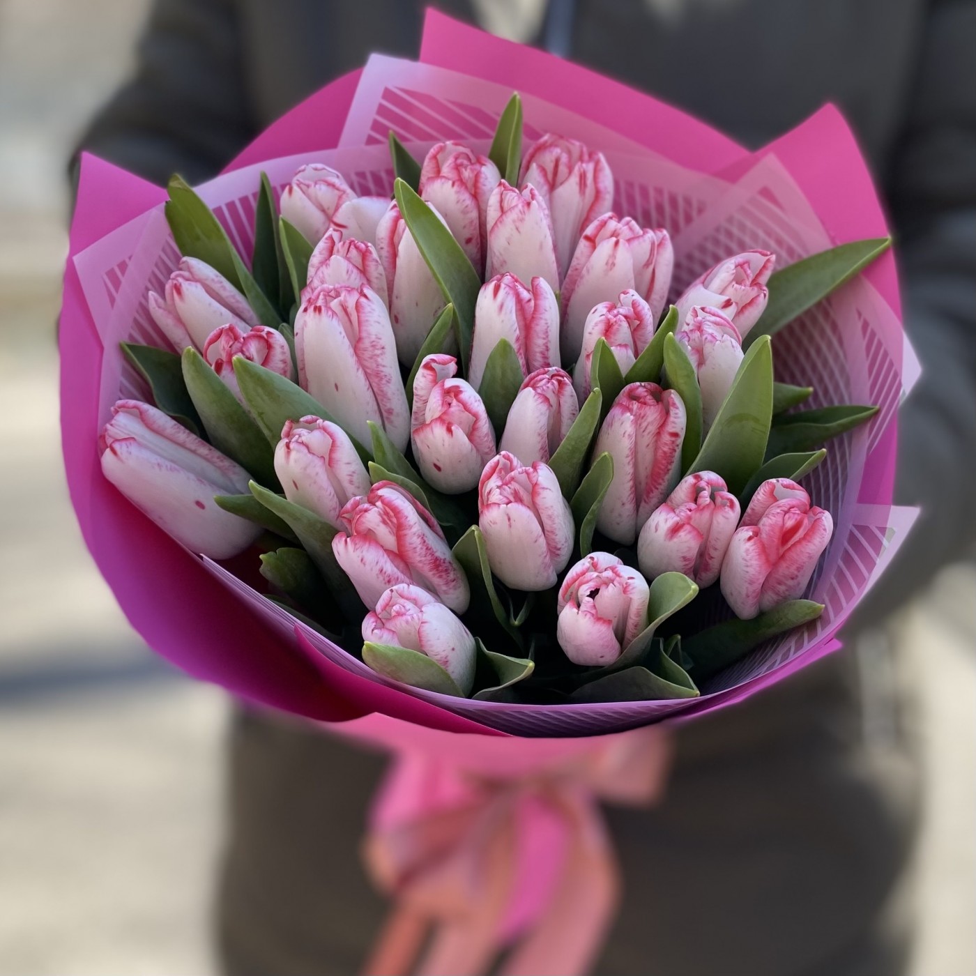 Нежный, весенний букет из 25 бело-розовых тюльпанов. Прекрасный вариант подарка молодой девушке.