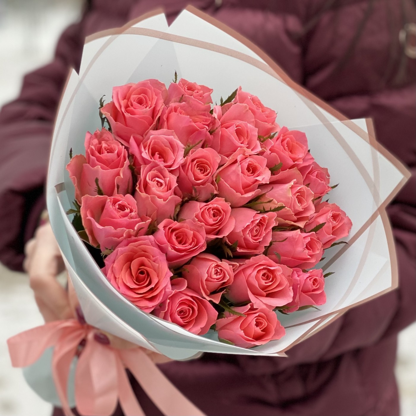 Анна о заказе: 51 малиновая розаСпасибо! Букет великолепный! Цветы свежайшие, упругие, очень красивые, крупные. Добавлено 4 коралловые розы и зелень