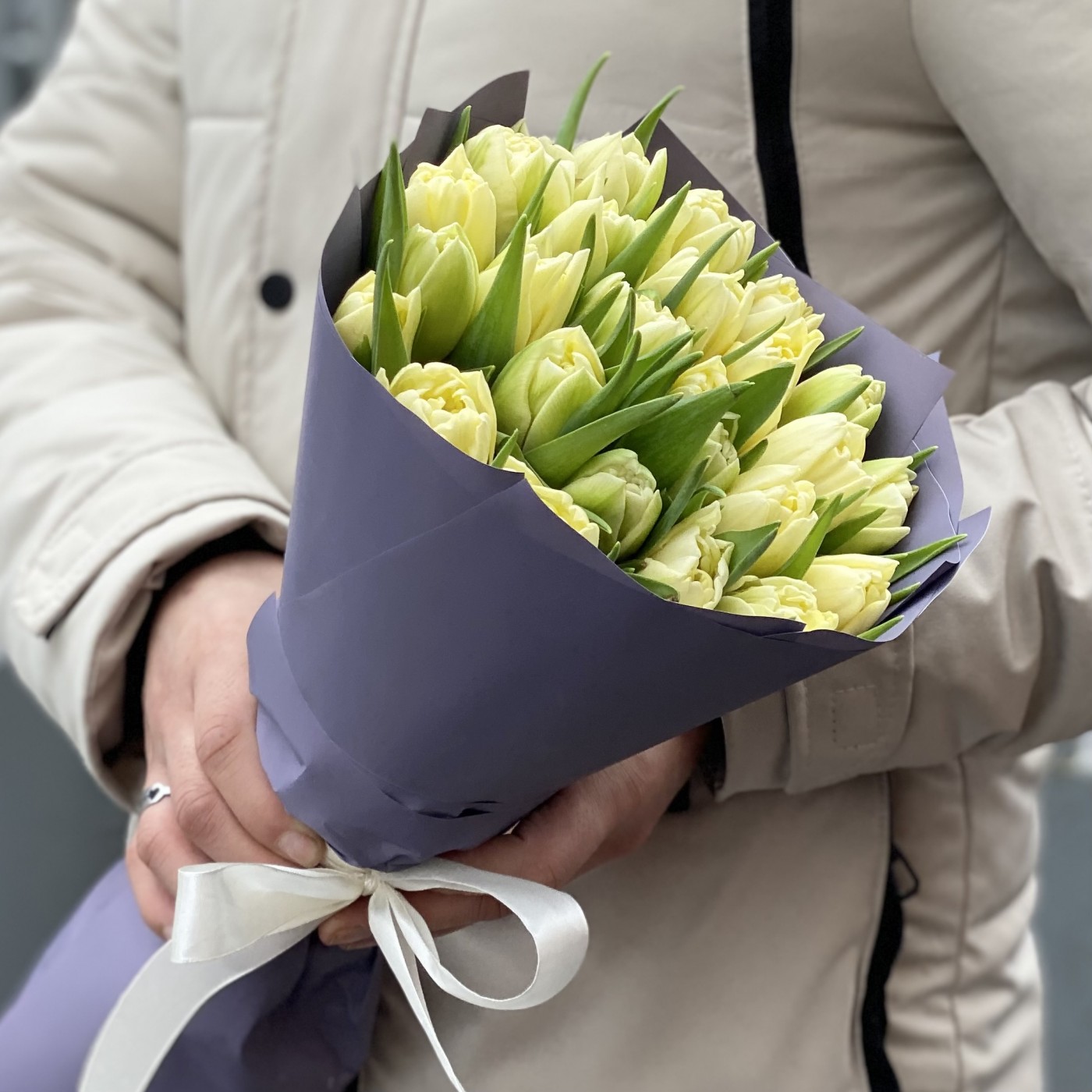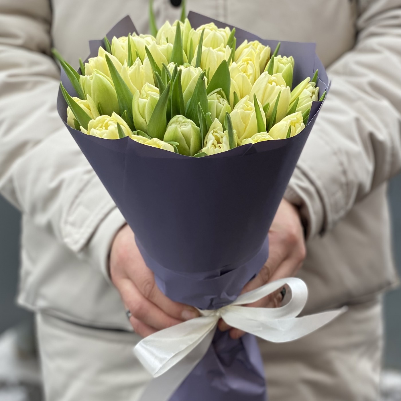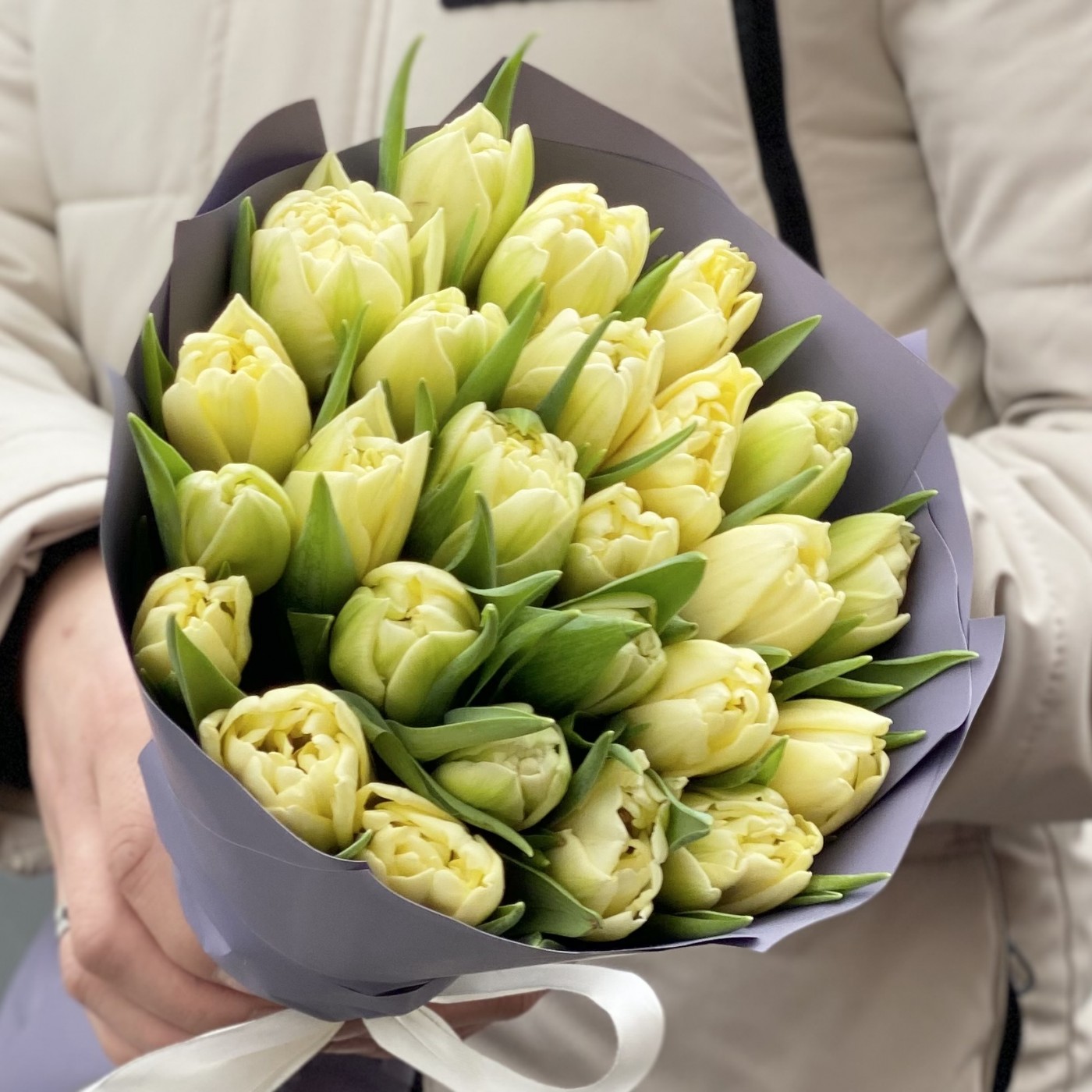Букет из свежайших пионовидных тюльпанов Авангард кремового цвета станет приятным комплиментом девушке или женщине любого возраста. Такая цветочная композиция украсит любой праздник или торжественное событие! Плотные, многослойные бутоны нежнейших желто-кремовых тюльпанов, постепенно раскрываясь, меняют свой силуэт и цветовую насыщенность. Роскошный букет лучше тысячи слов сможет выразить самые искренние и трепетные чувства дарителя. Очаровательные весенние тюльпаны произведут впечатление и надолго запомнится девушке своим оригинальным видом.