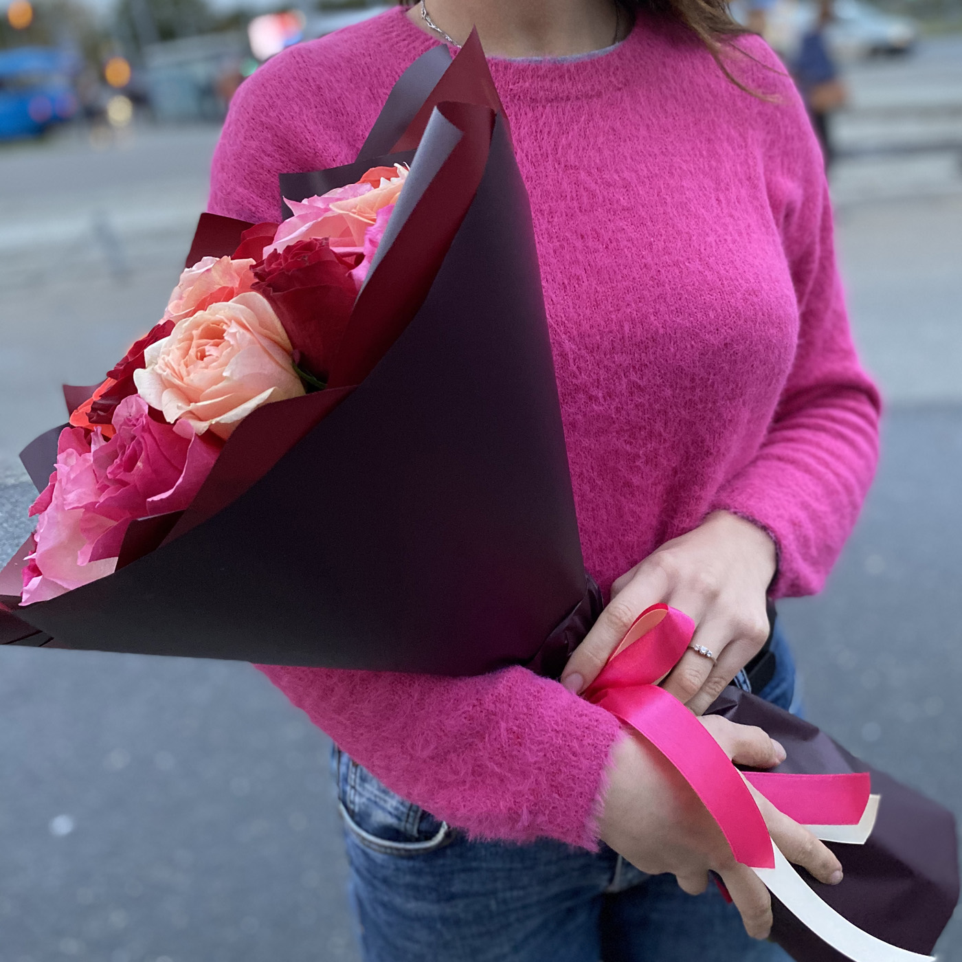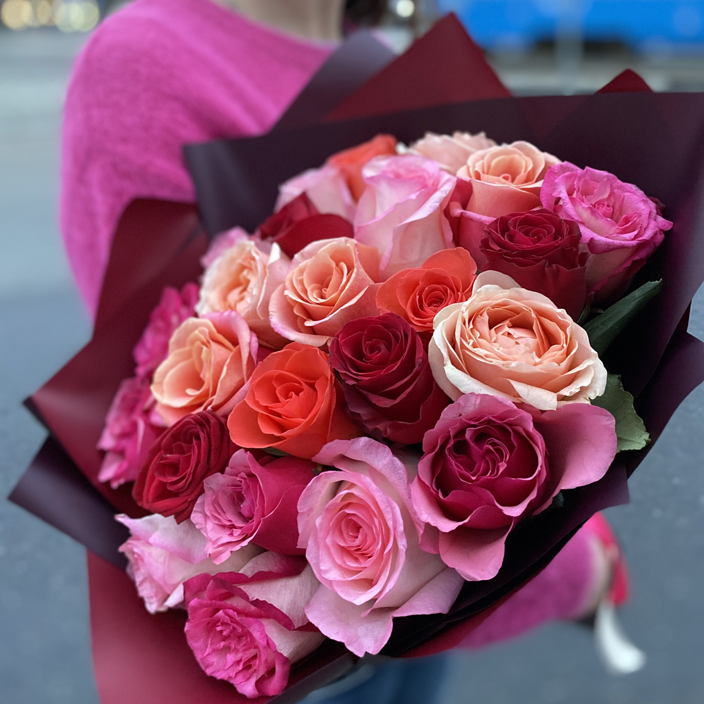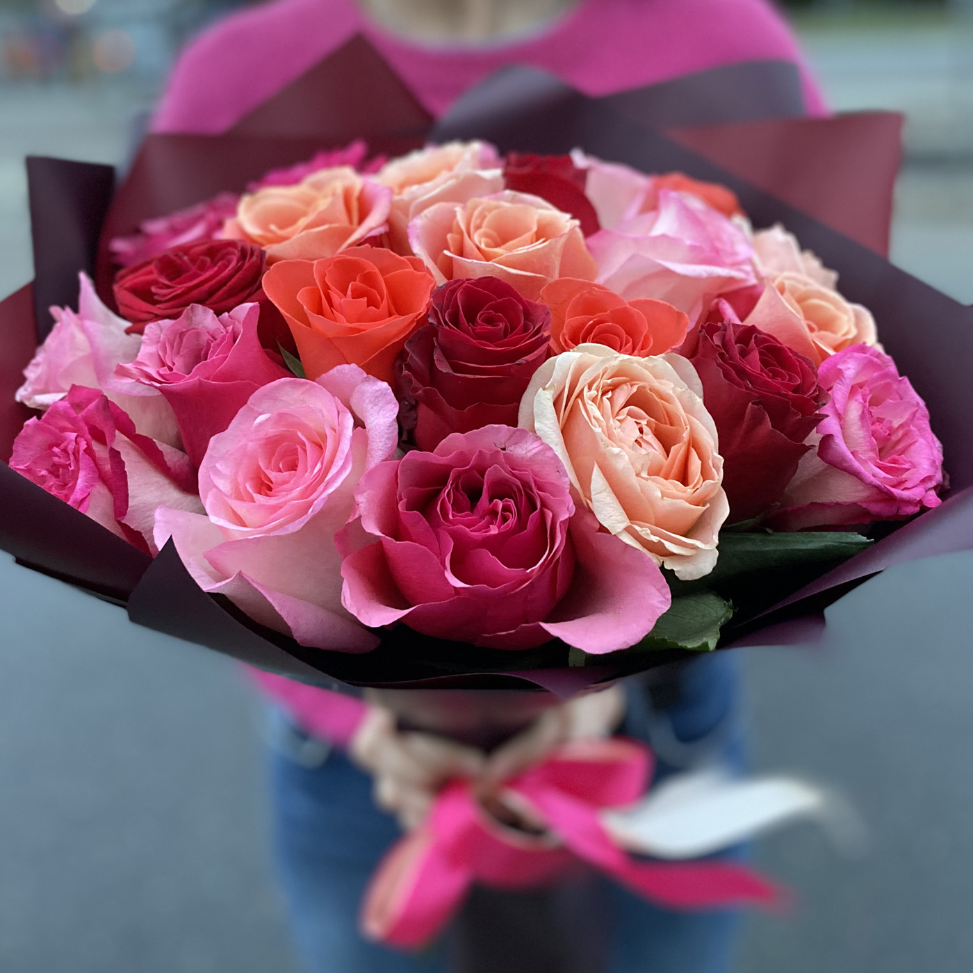 Шикарный букет из длинных роз для веселых, удивительных, милых и юных девушек. В букете собрались самые невероятные оттенки ярких роз, которые идеально гармонируют между собой. Это яркий микс из красных, розовых, оранжевых, малиновых и персиковых оттенков роз с длиной стебля 60 см. В разноцветном букете только свежие цветы, их бутоны слегка раскрыты, поэтому букет выглядит пышным и «пушистым».