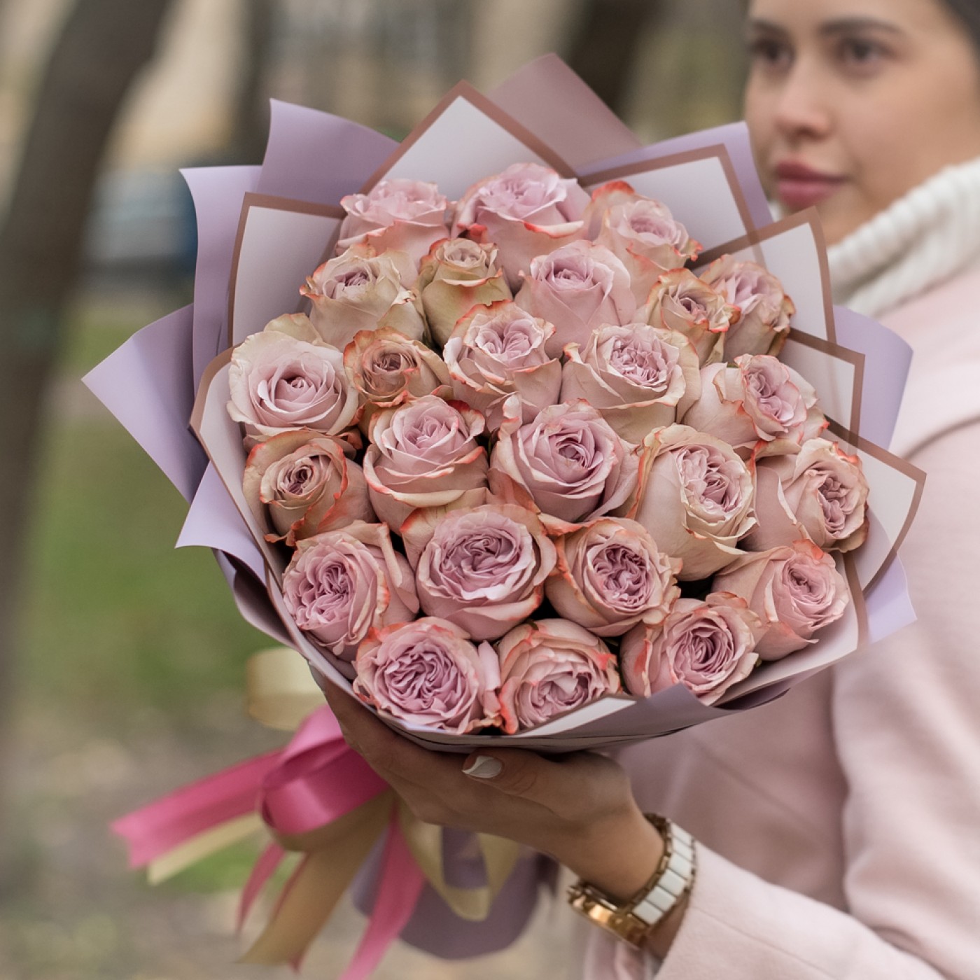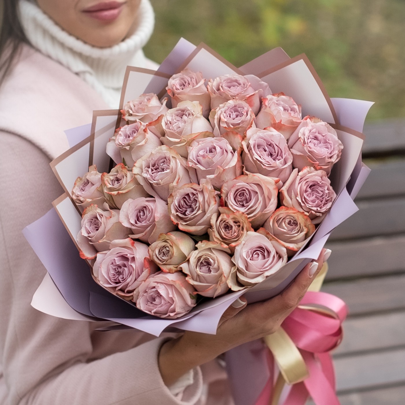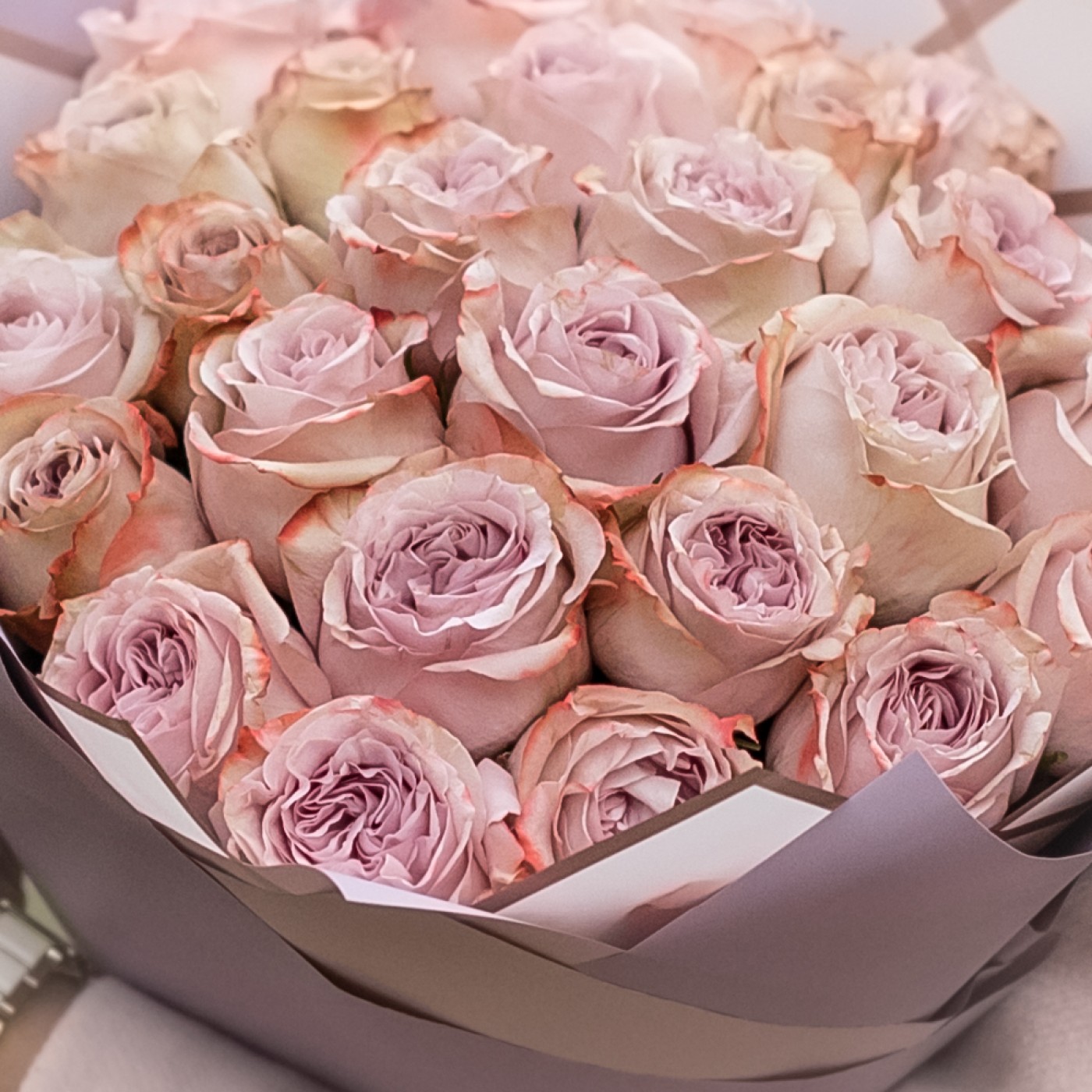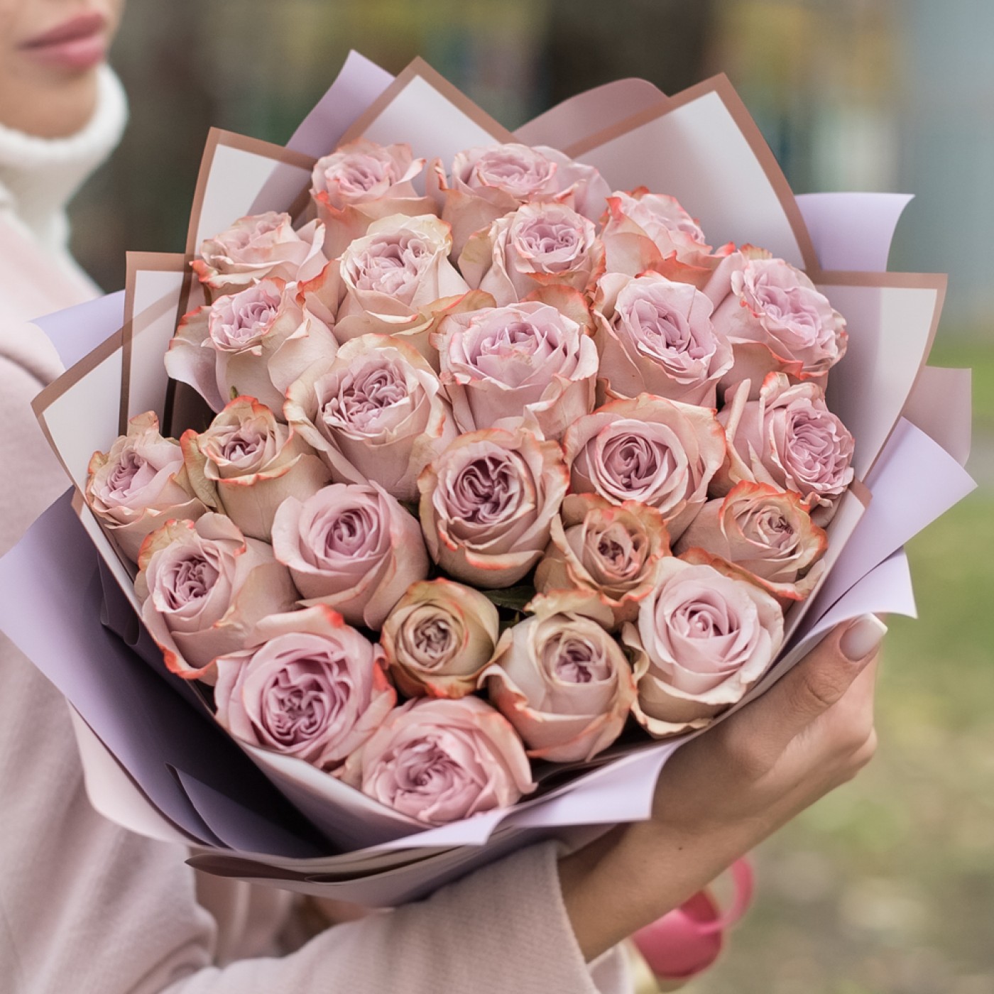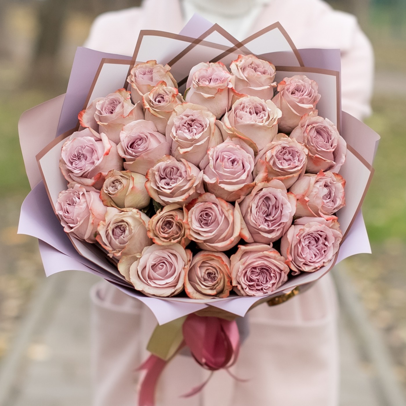 Оригинальные пионовидные розы Лилак Вандер (Lilac Wonder). Роза имеет крупный сиреневый бутон с пламенно-рыжими краями лепестков. Такие цветы станут идеальным подарком на свидании с любимой девушкой, ими можно порадовать свою учительницу или маму. Это универсальный яркий и нежный букет, который подчеркнет ваши добрые чувства к дорогому вам человеку!
