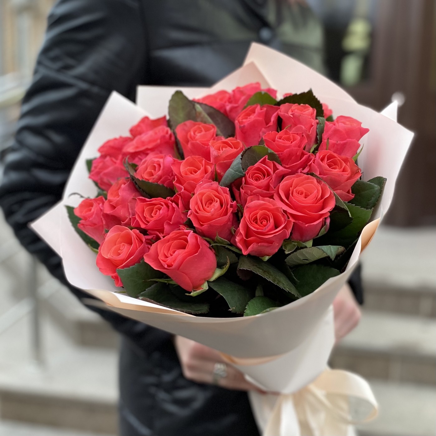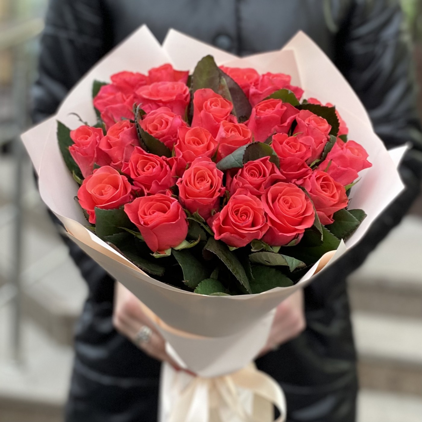 Букет из 25 роз сорта Пинк Такаци – это один из классических вариантов цветочных букетов.