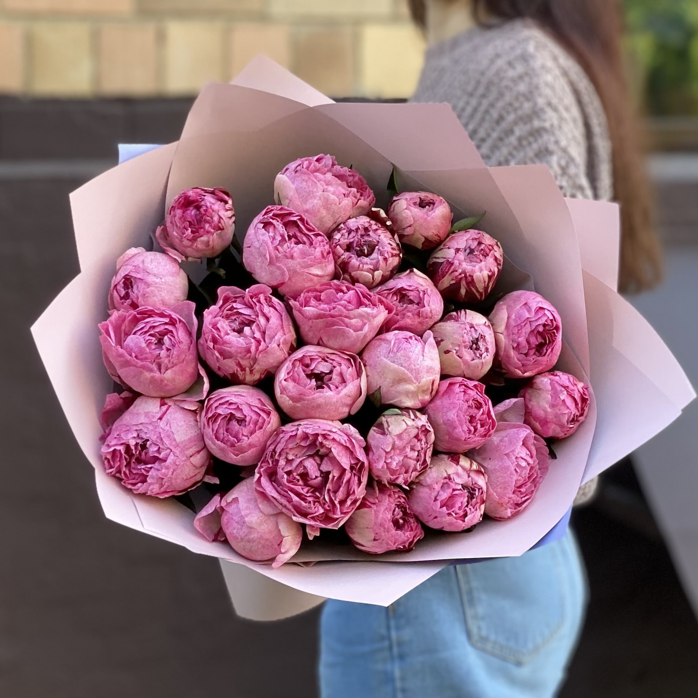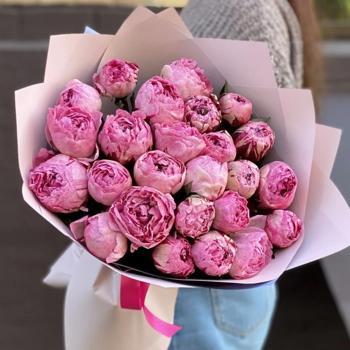 Роскошный букет из 25 розовых пионов сорта Александр-Эльза.