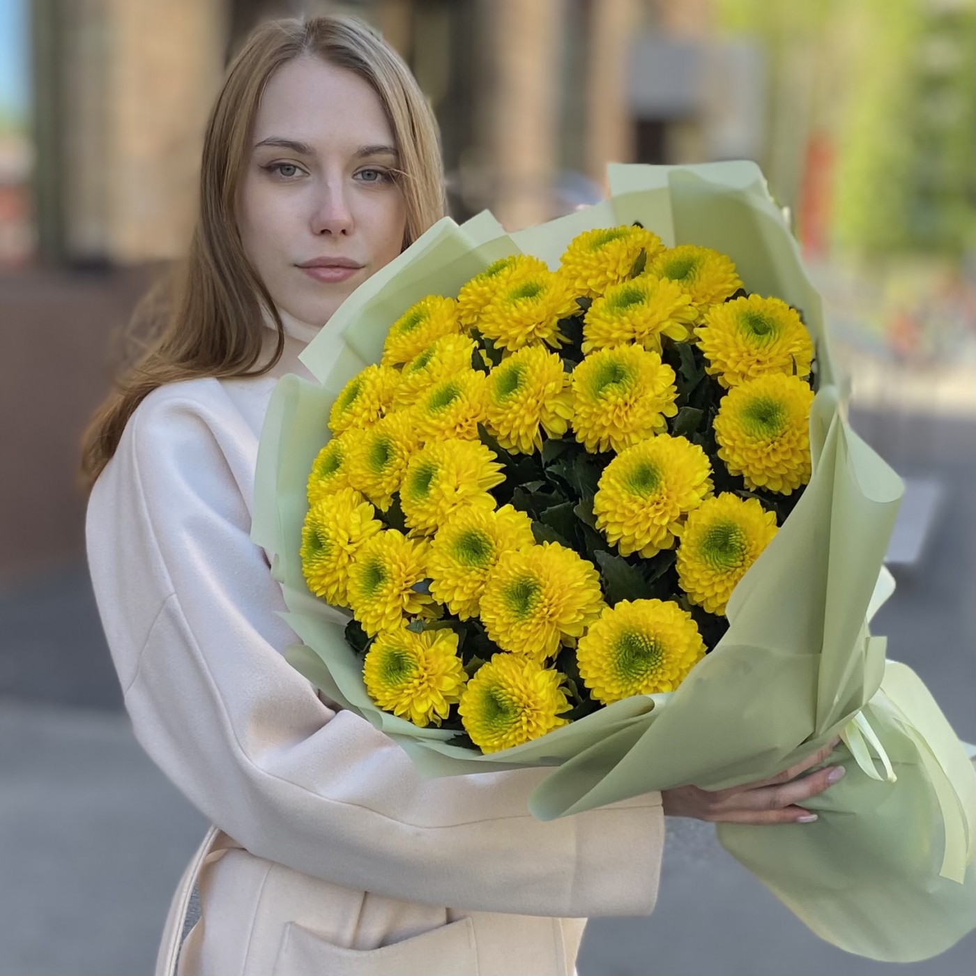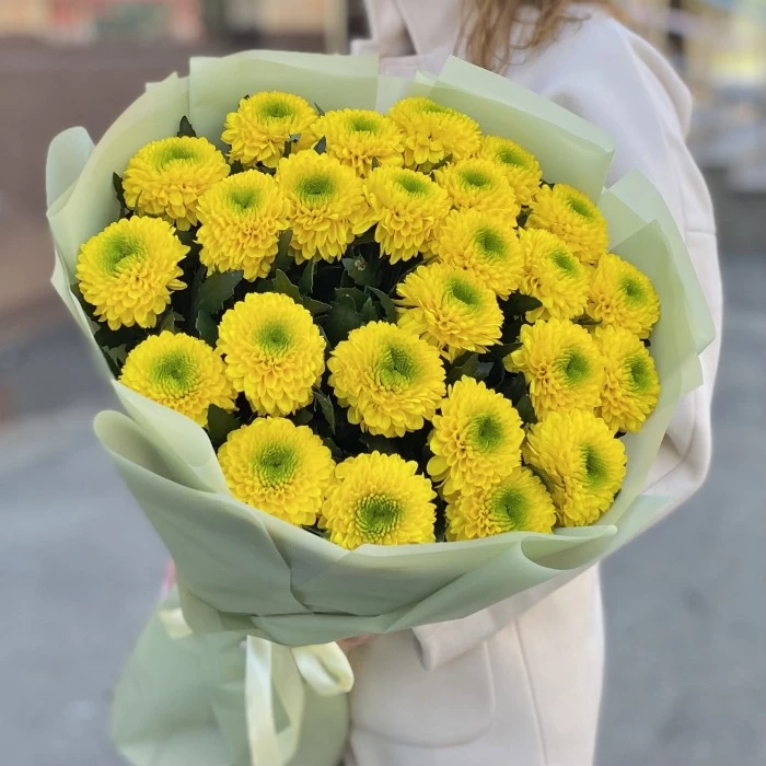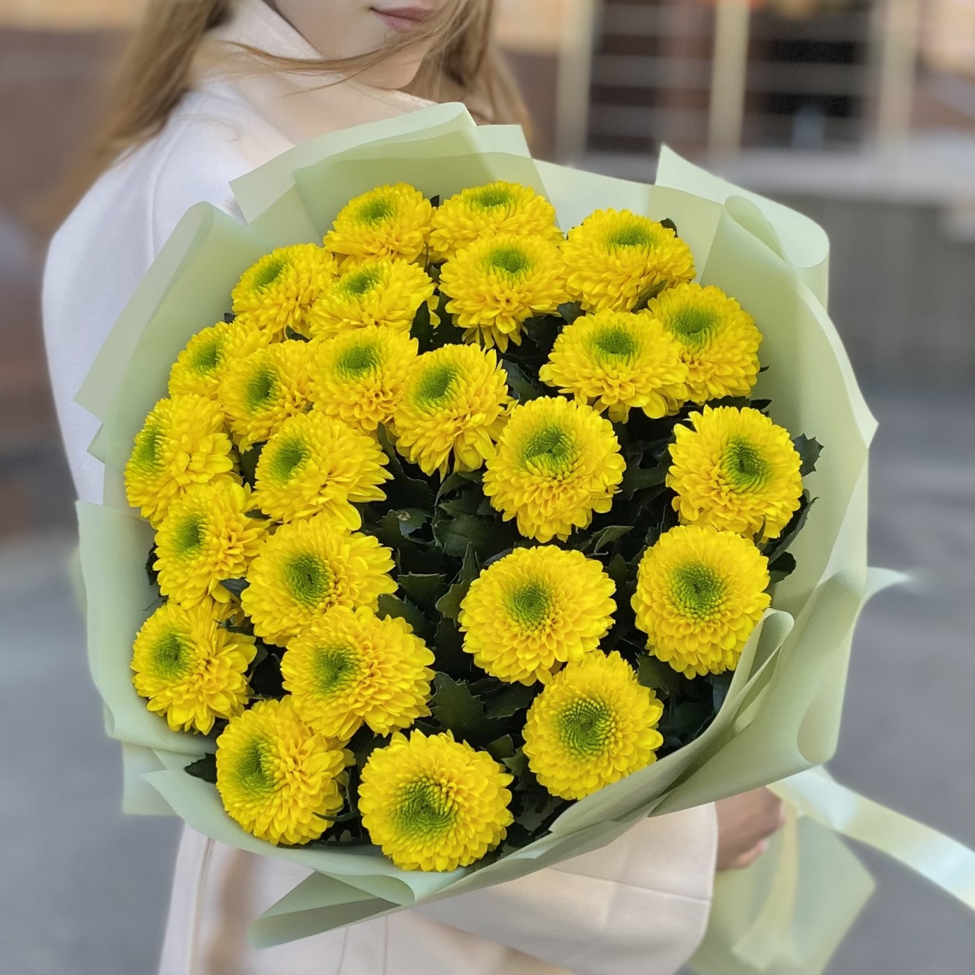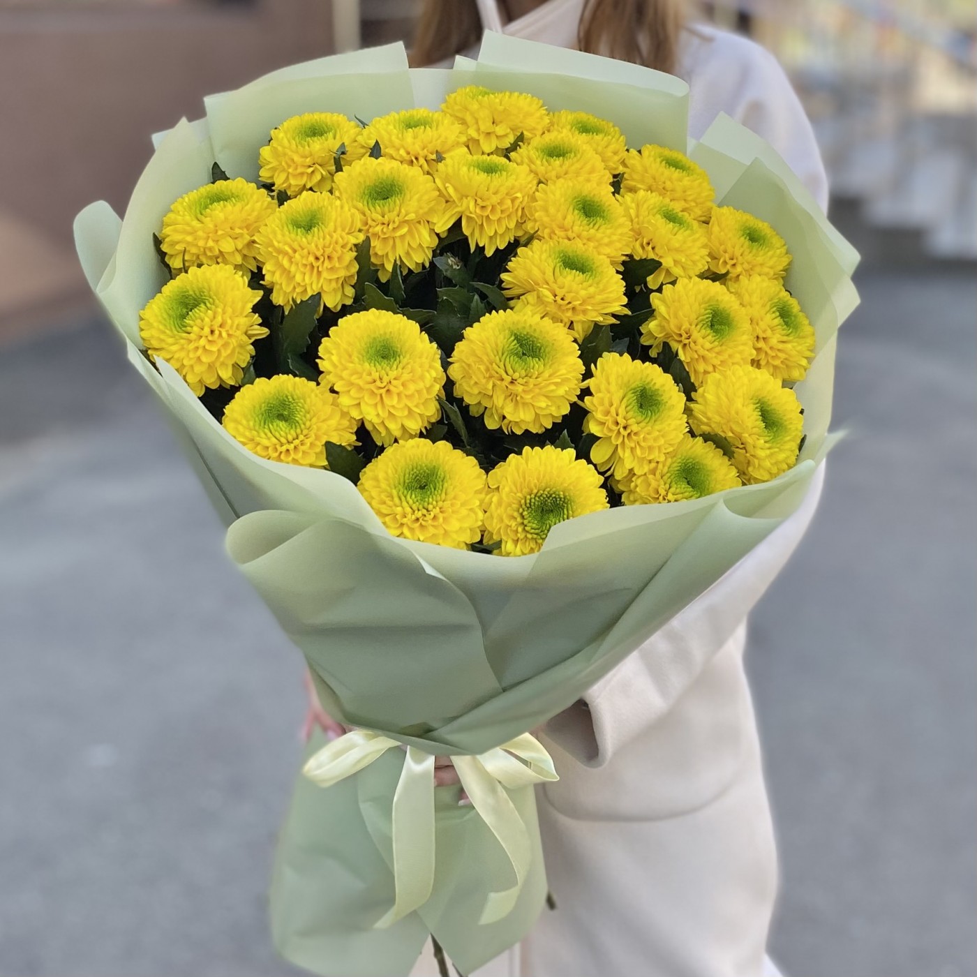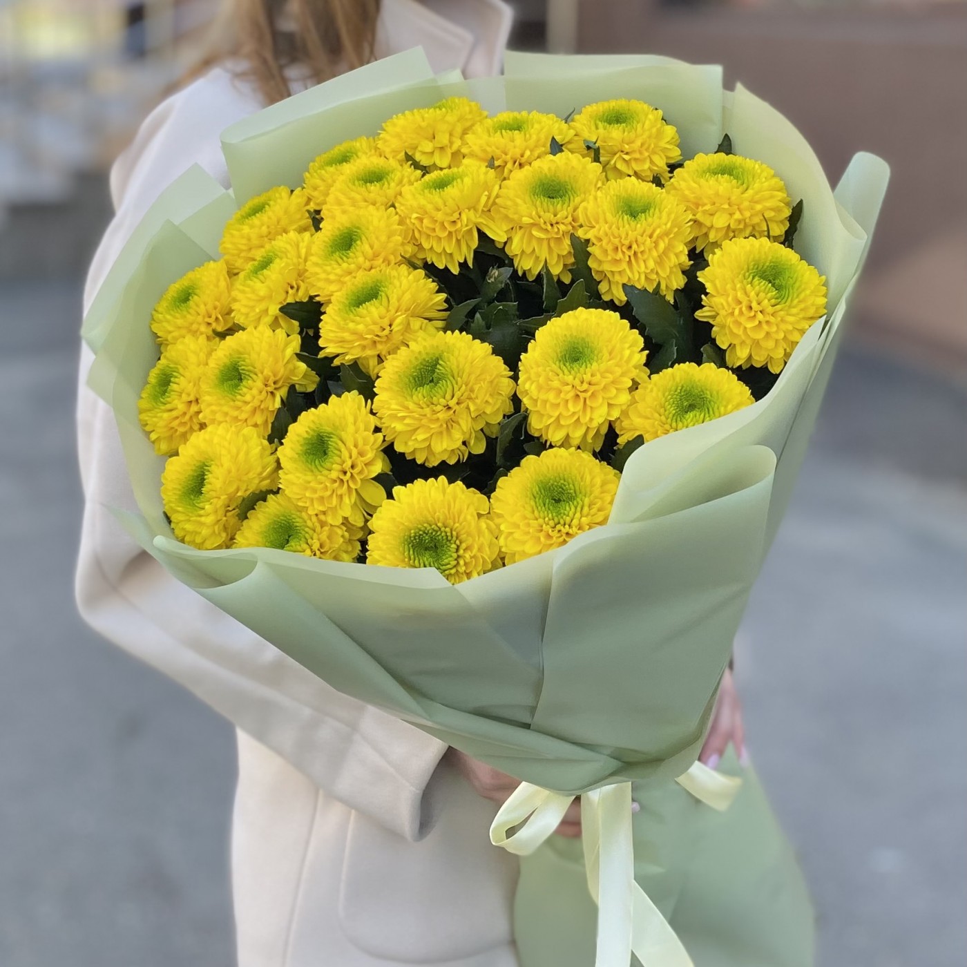 Букет из 25 пышных жёлтых хризантем Помпон отлично подойдет, чтобы поздравить коллегу или подругу с днем рождения.