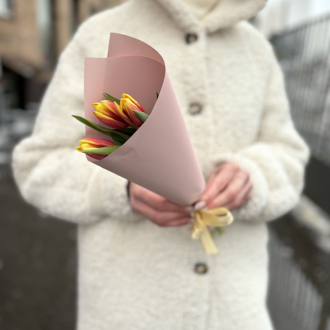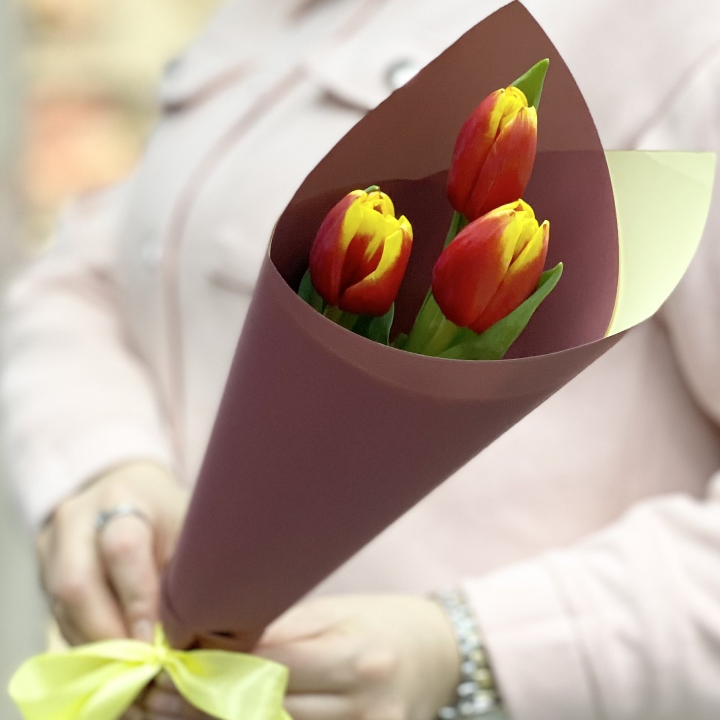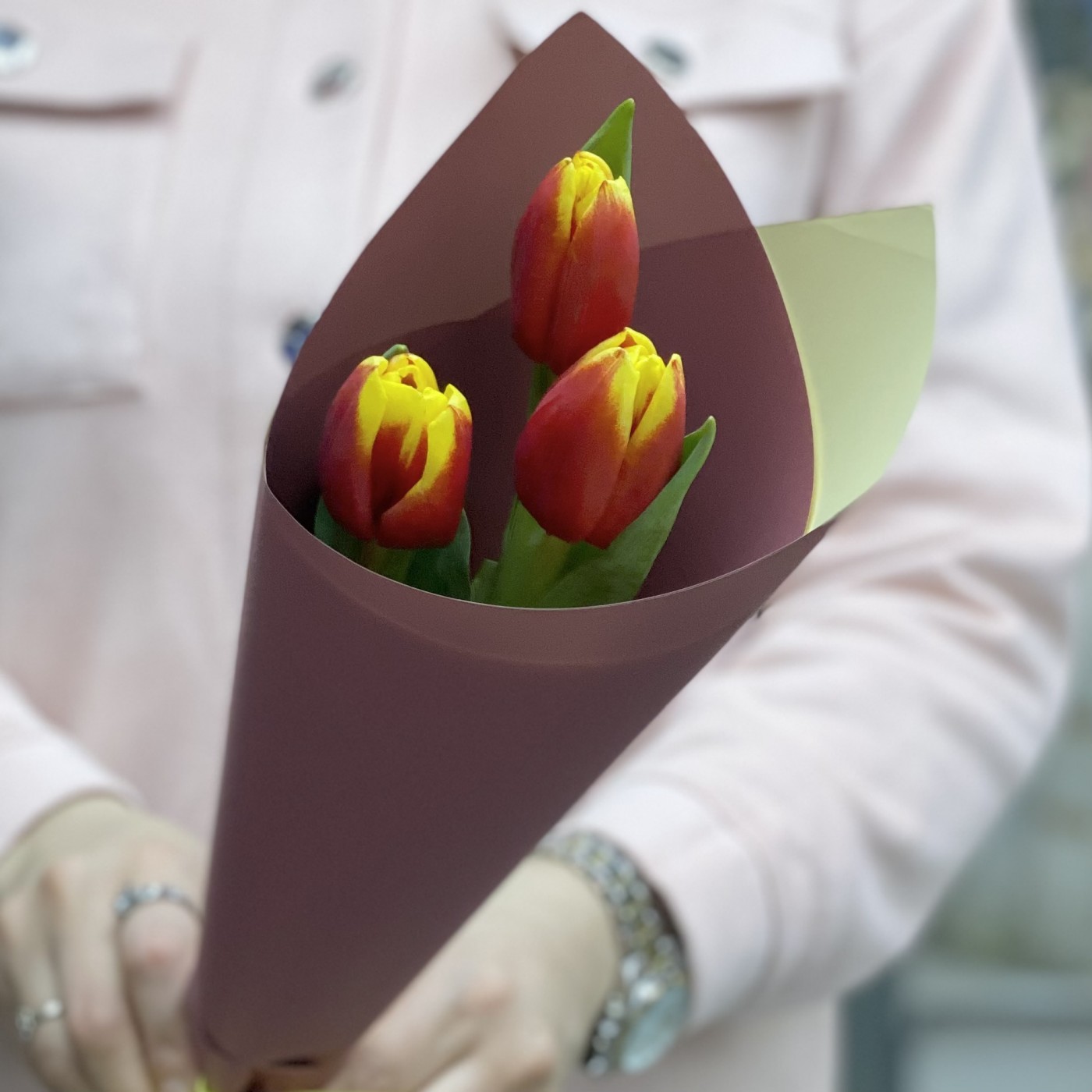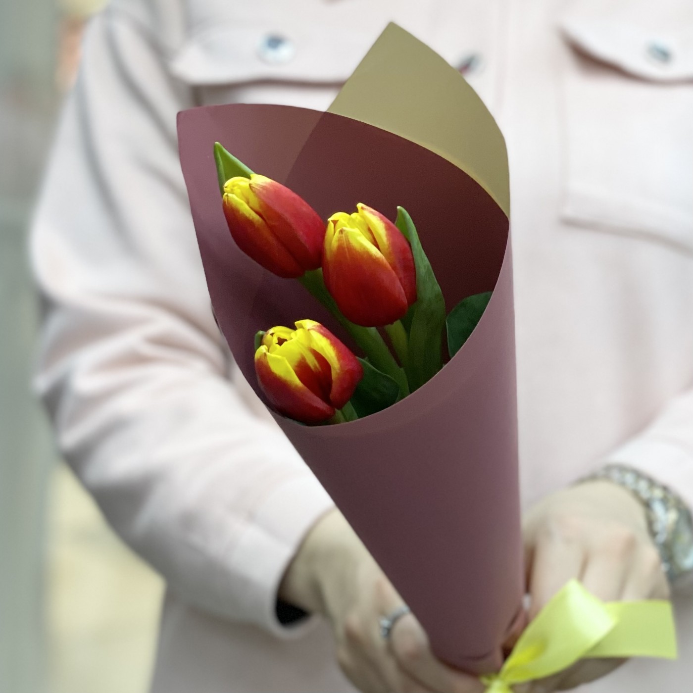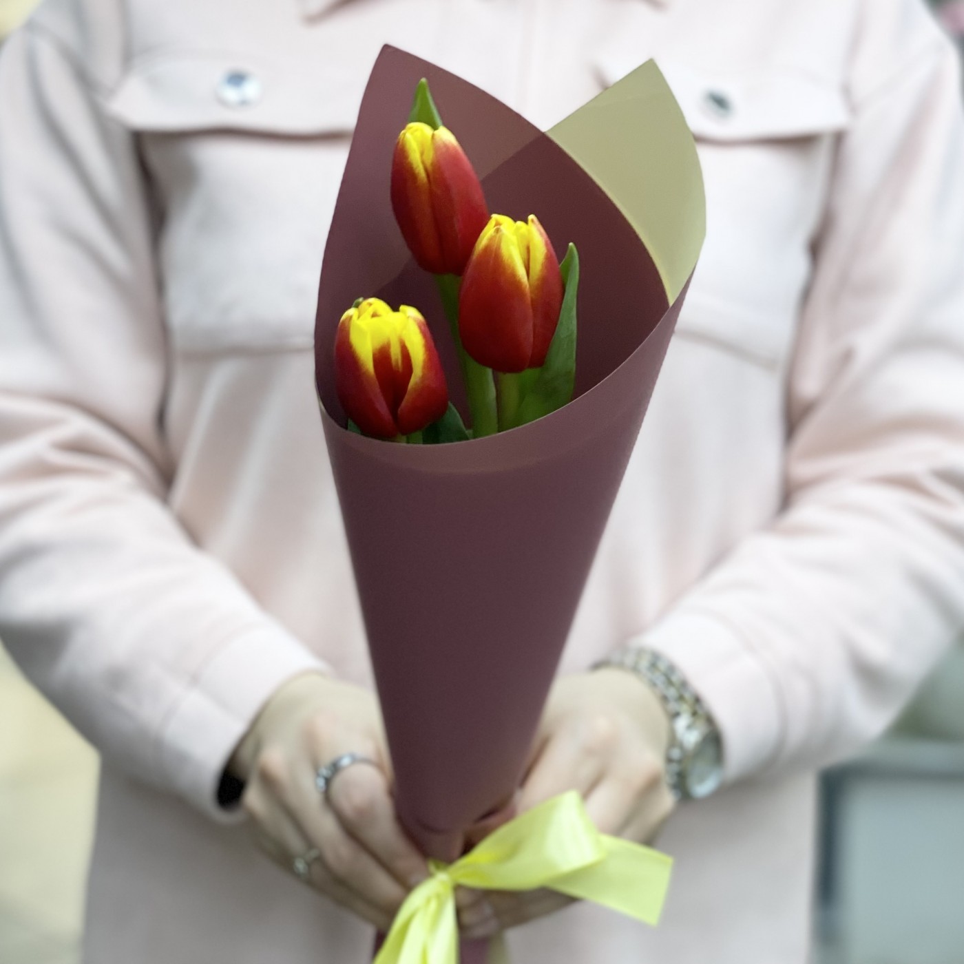Мини-букет из красно-желтых тюльпанов в стильной упаковке. Прекрасный корпоративный вариант подарка на 8 марта.