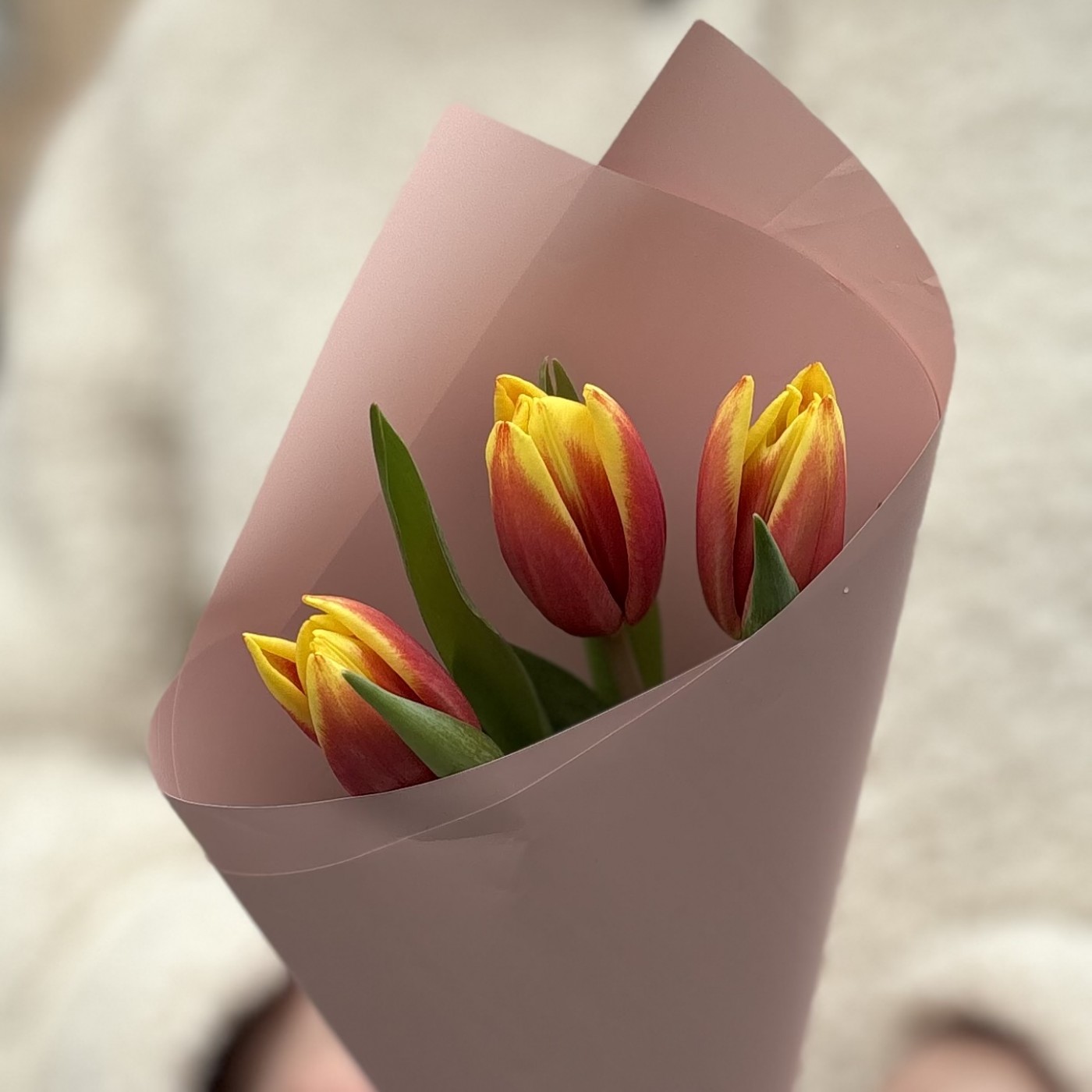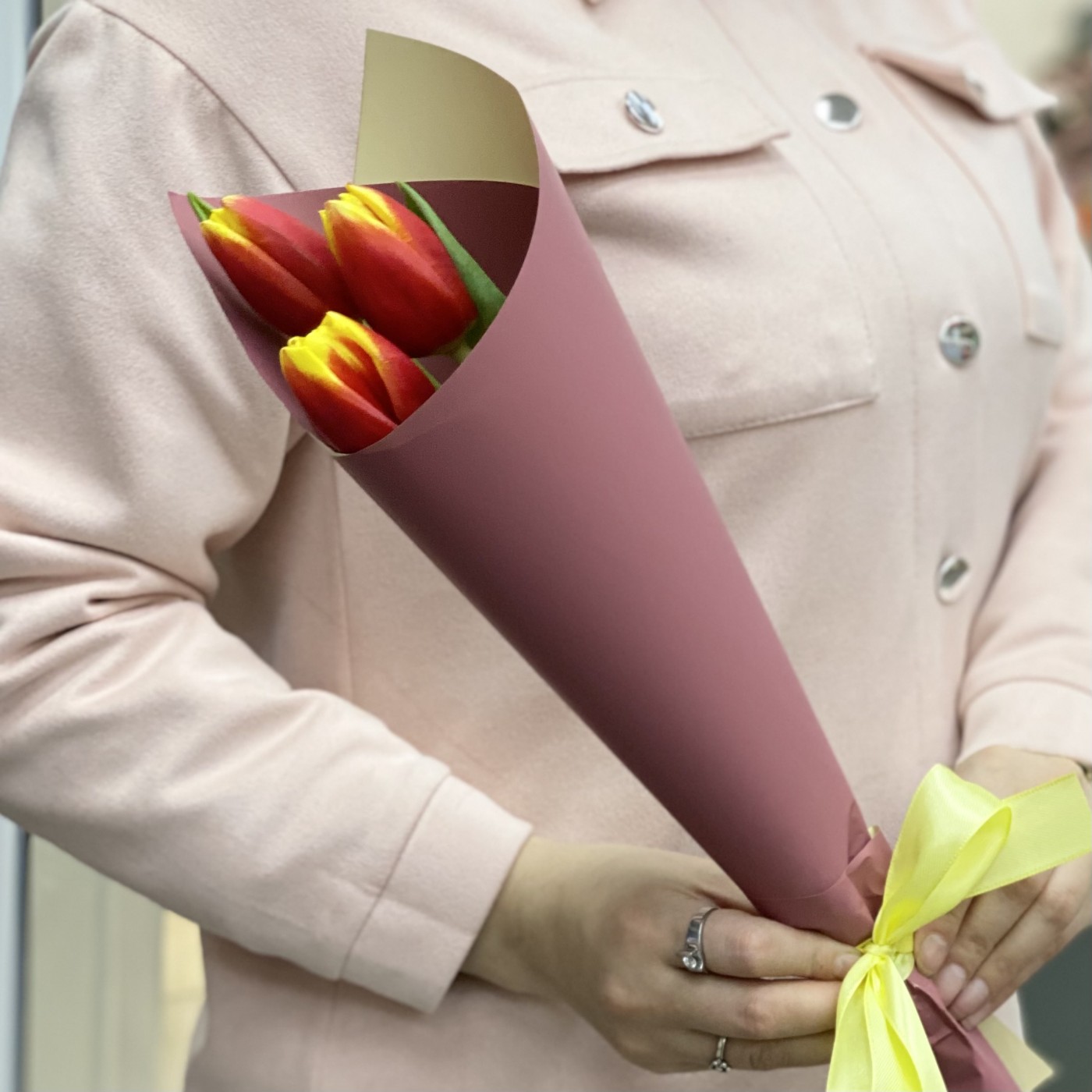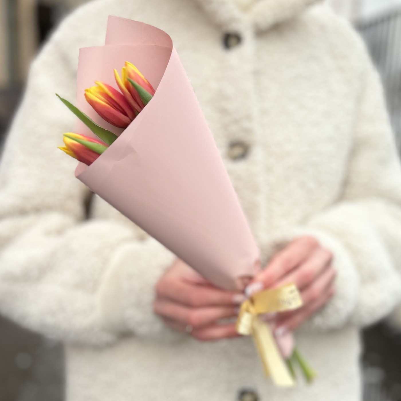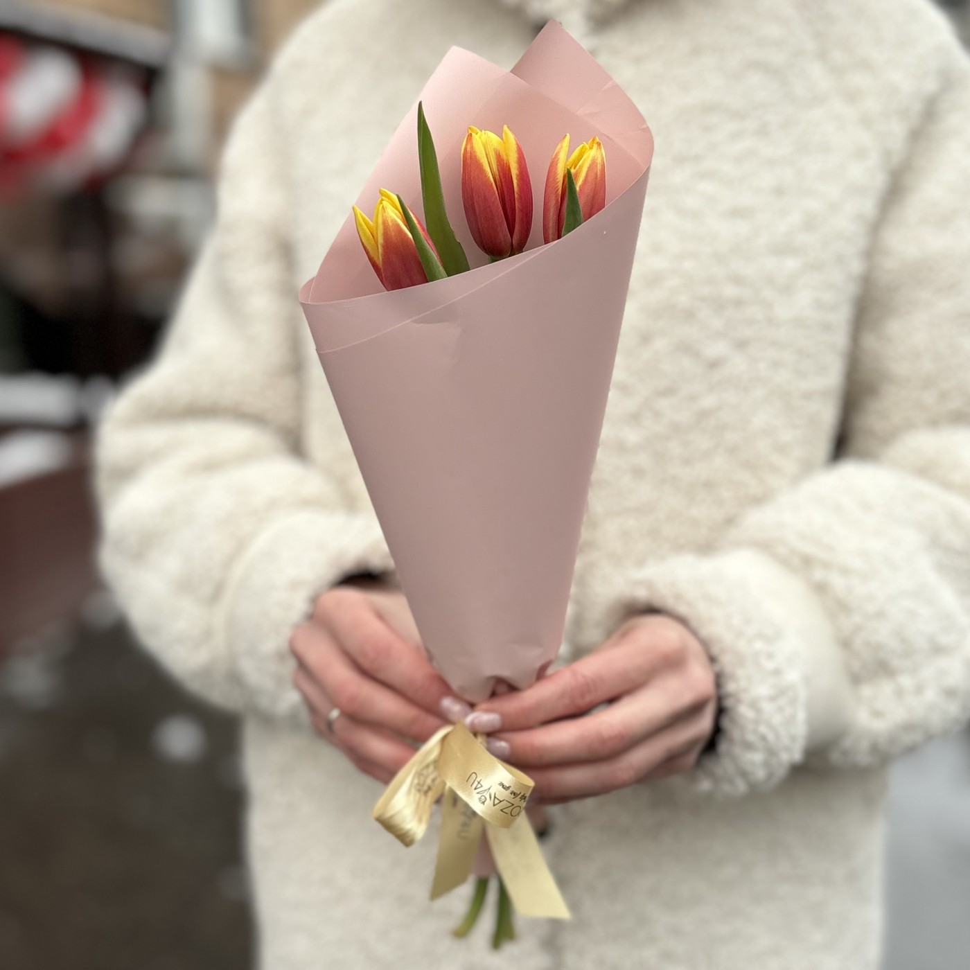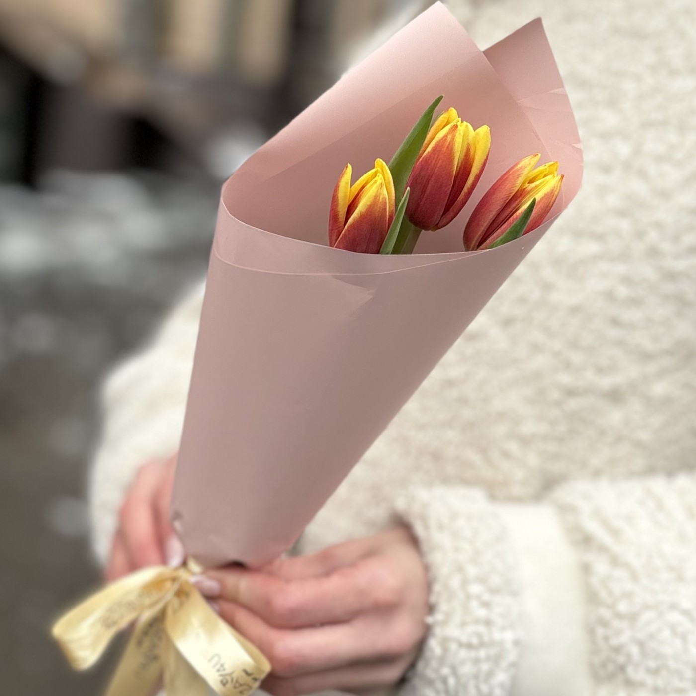 Мини-букет из красно-желтых тюльпанов в стильной упаковке. Прекрасный корпоративный вариант подарка на 8 марта.