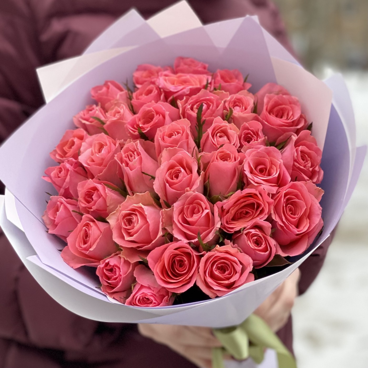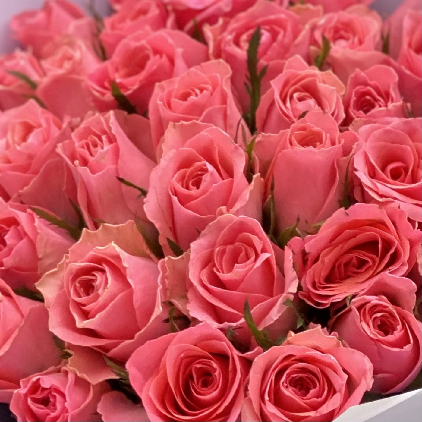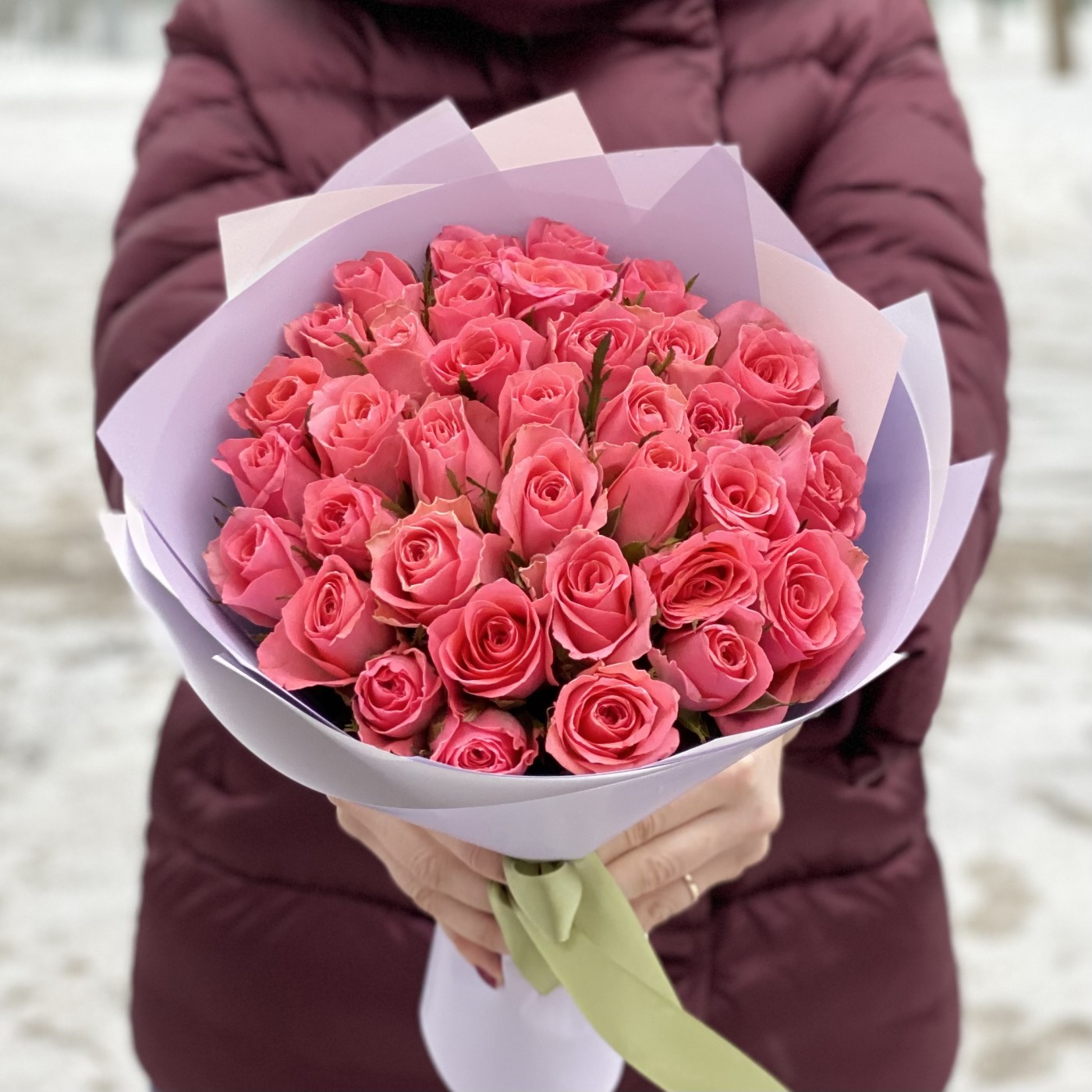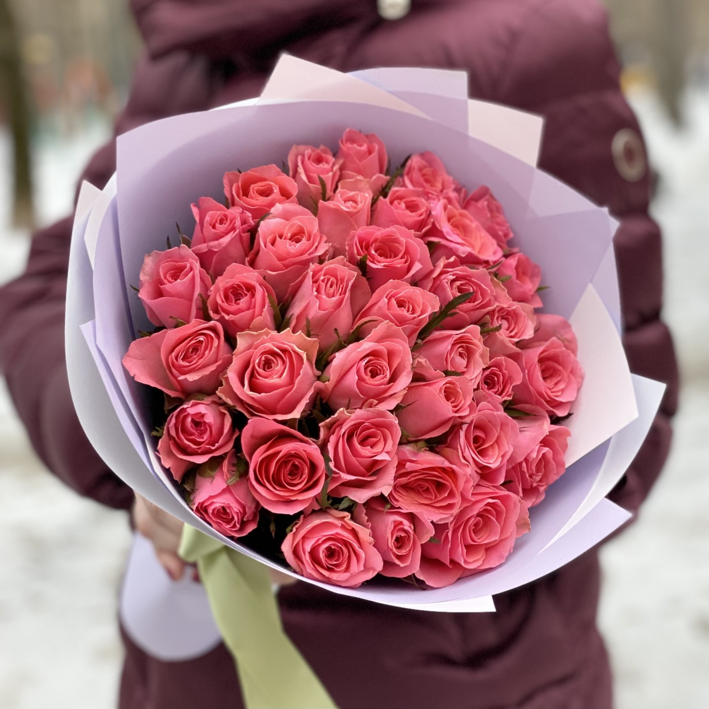 Анна о заказе: 51 малиновая розаСпасибо! Букет великолепный! Цветы свежайшие, упругие, очень красивые, крупные. Добавлено 4 коралловые розы и зелень