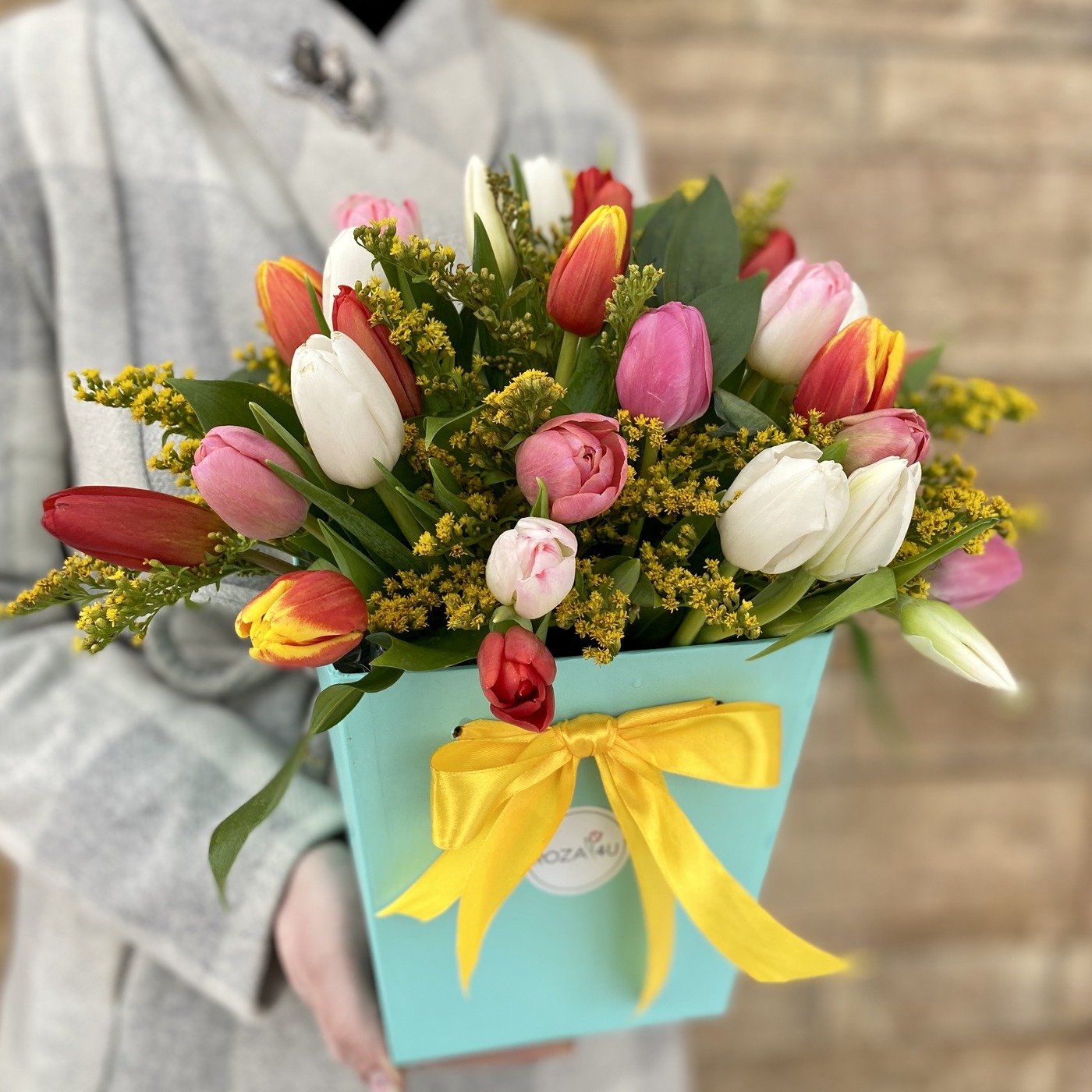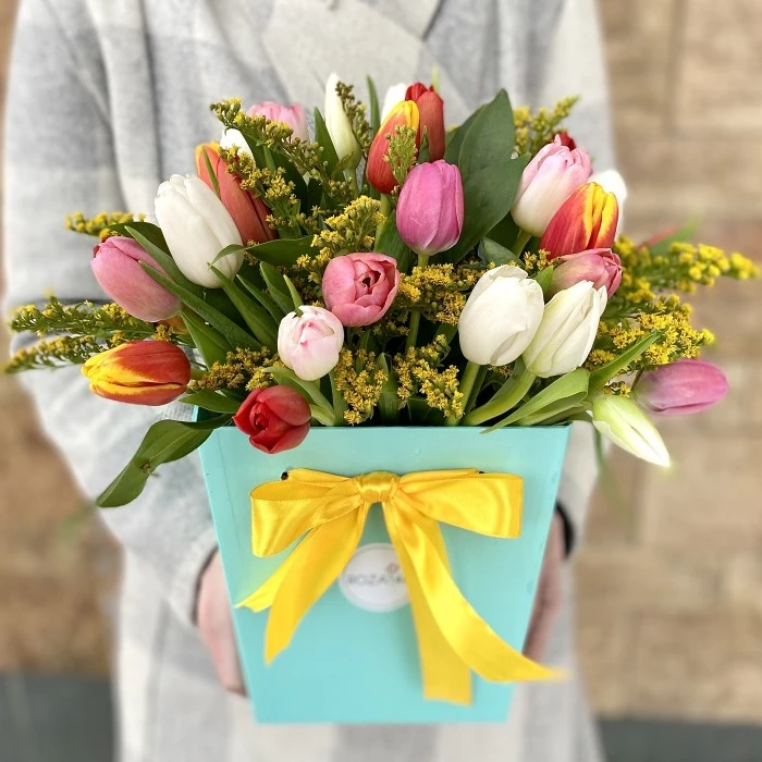 От композиции в нежной мятной коробке веет весной. Тюльпаны в сочетании с мимозой, очень напоминающим мимозу – главные предвестники весны.