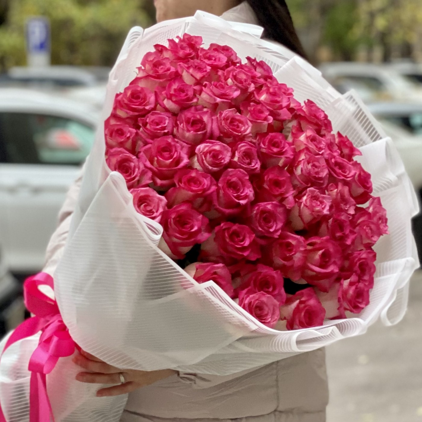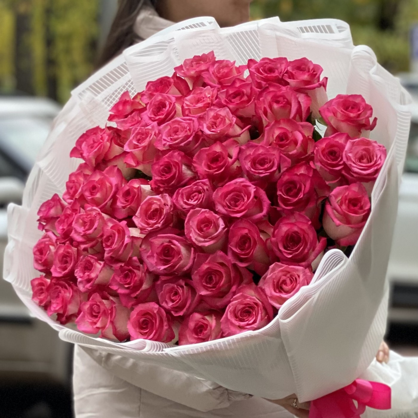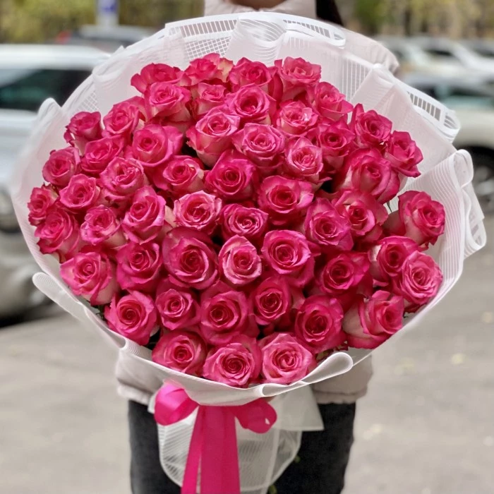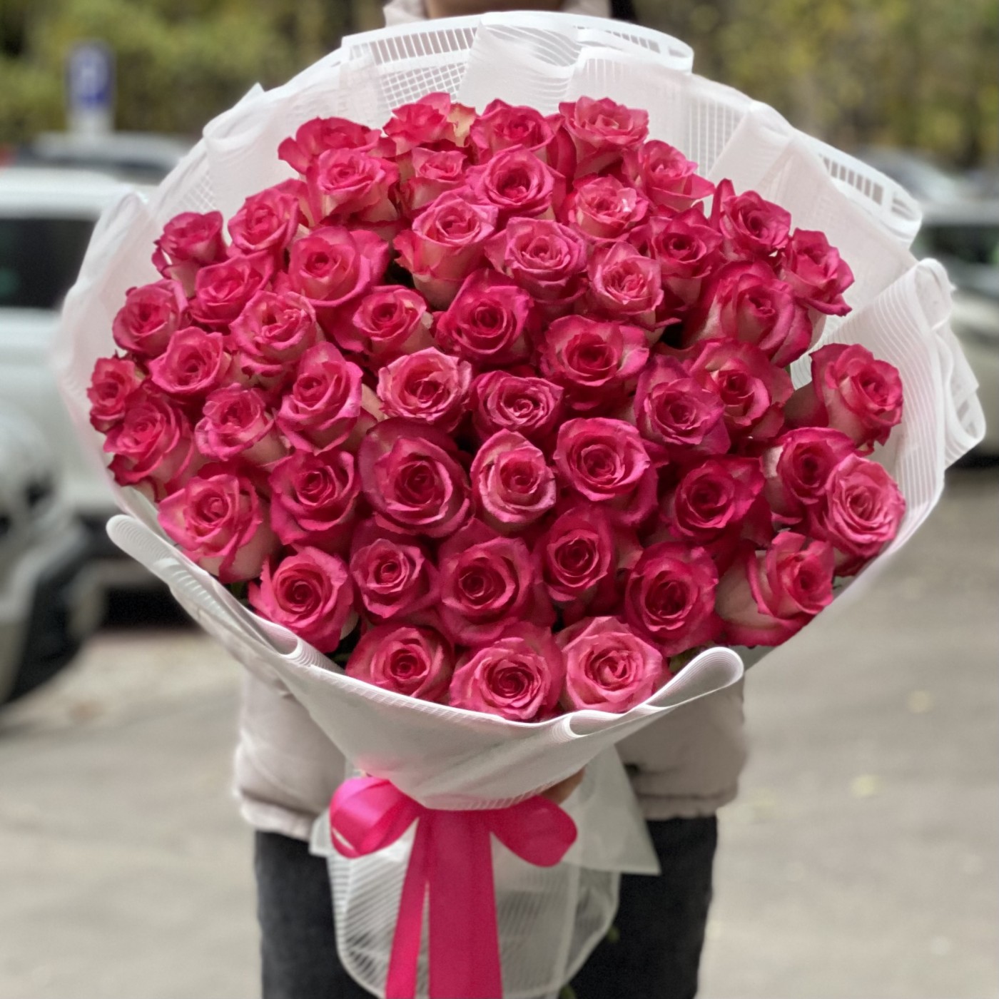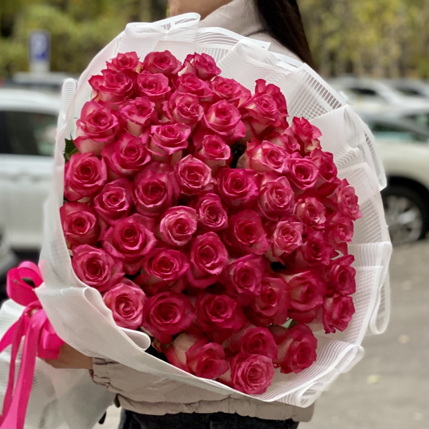 Анна о заказе: 51 малиновая розаСпасибо! Букет великолепный! Цветы свежайшие, упругие, очень красивые, крупные. Добавлено 4 коралловые розы и зелень