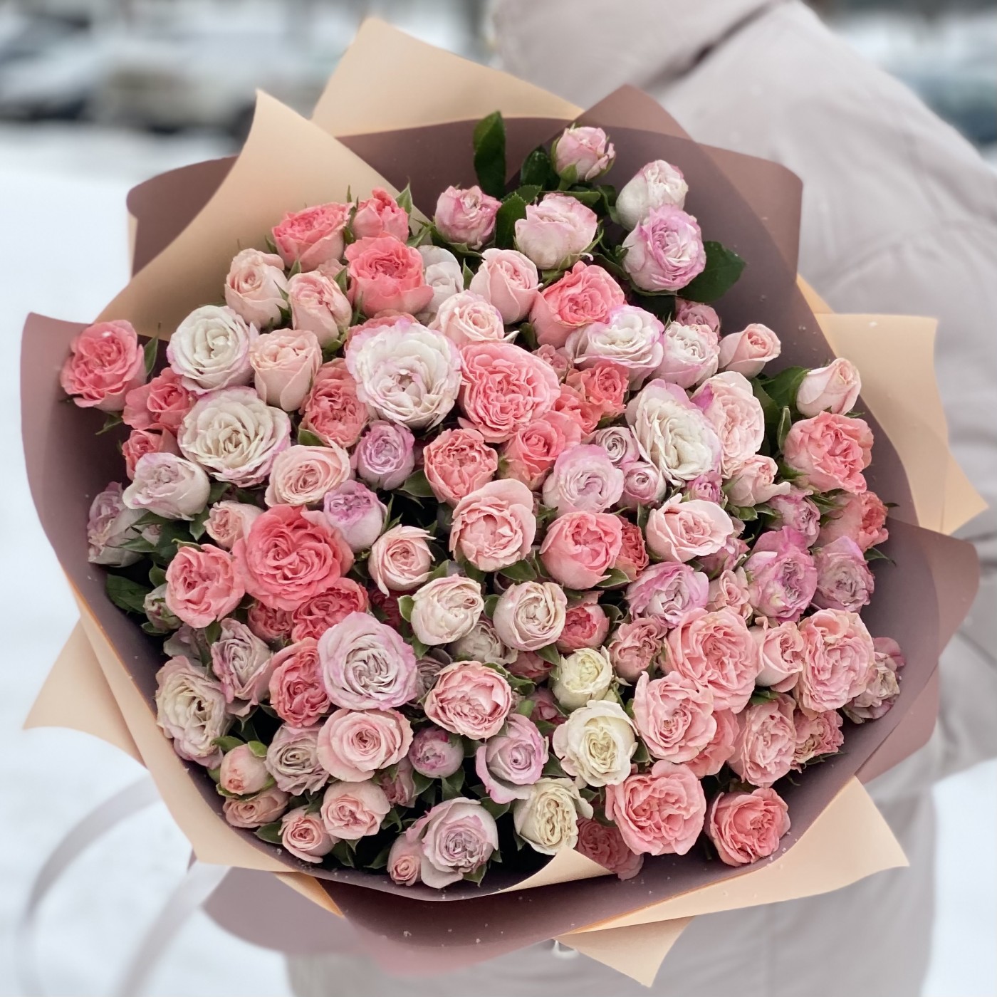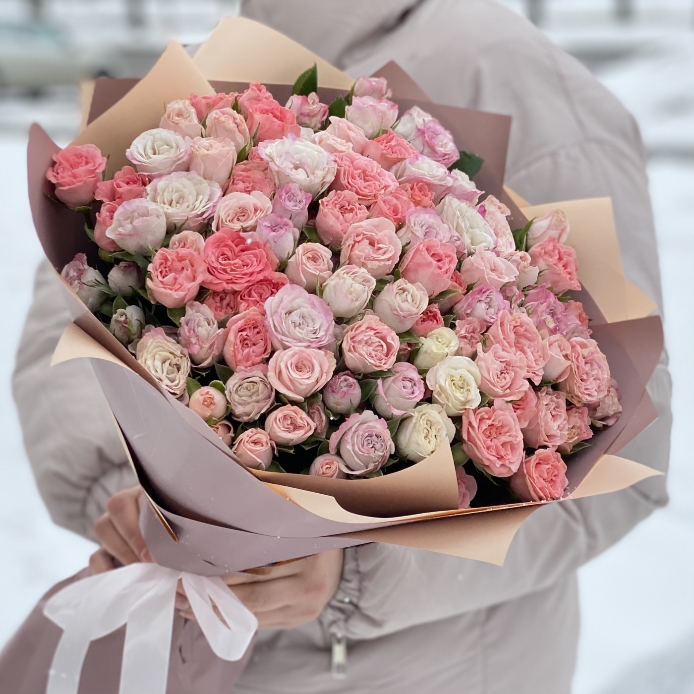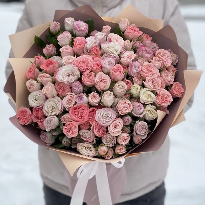 Букет из нежных кустовых роз для подарка на любое мероприятие.
