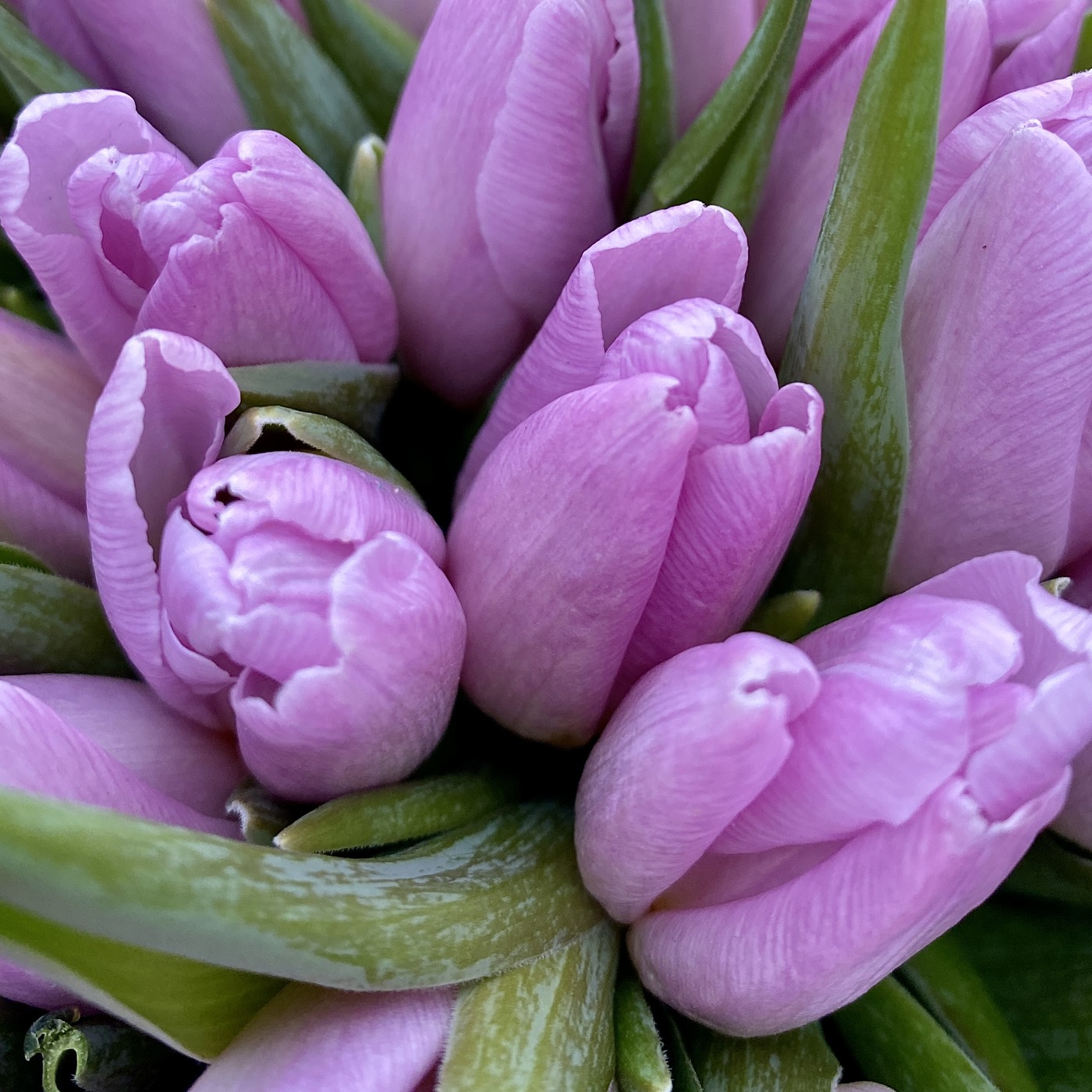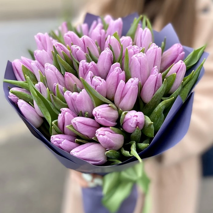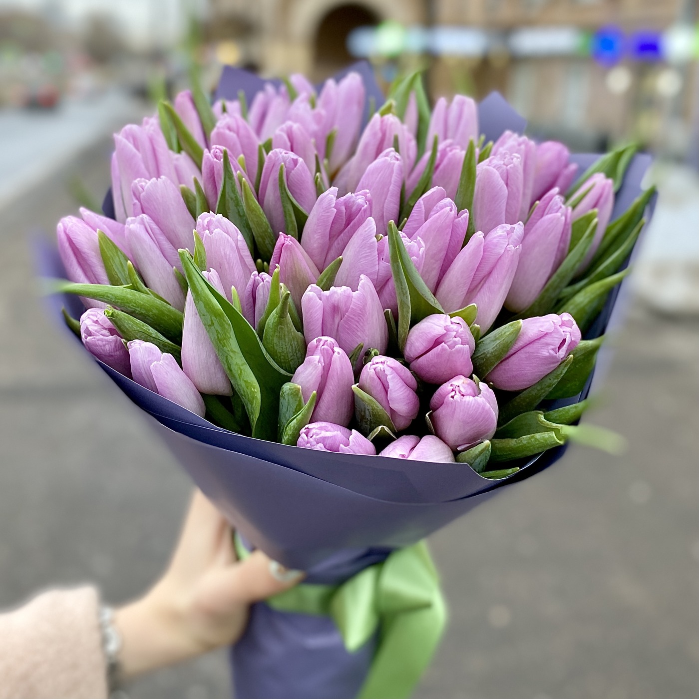 Необыкновенные лиловые тюльпаны для нежных и утонченных дам. Подарите ароматные, весенние цветы и поднимите настроение получателю.