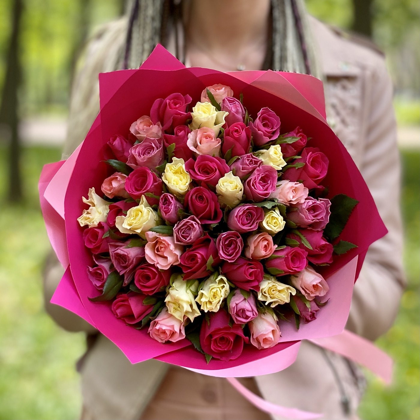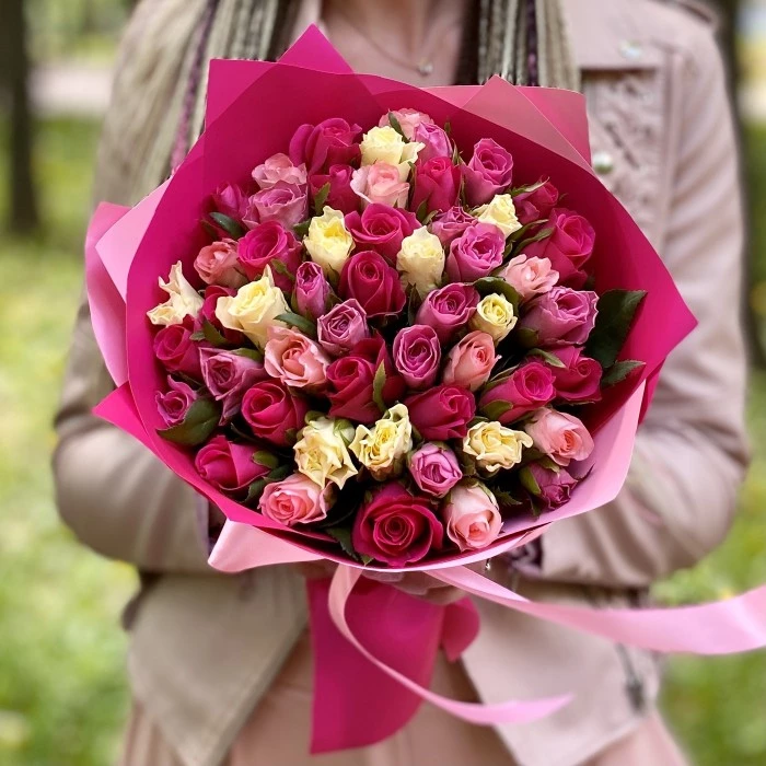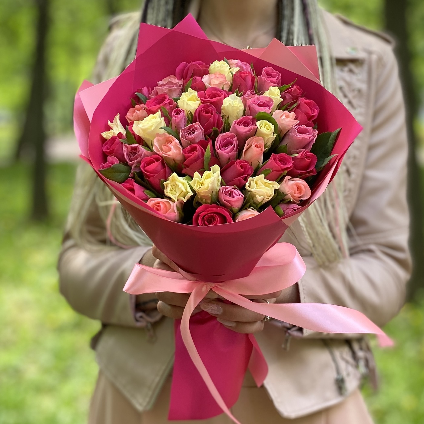 Анна о заказе: 51 малиновая розаСпасибо! Букет великолепный! Цветы свежайшие, упругие, очень красивые, крупные. Добавлено 4 коралловые розы и зелень