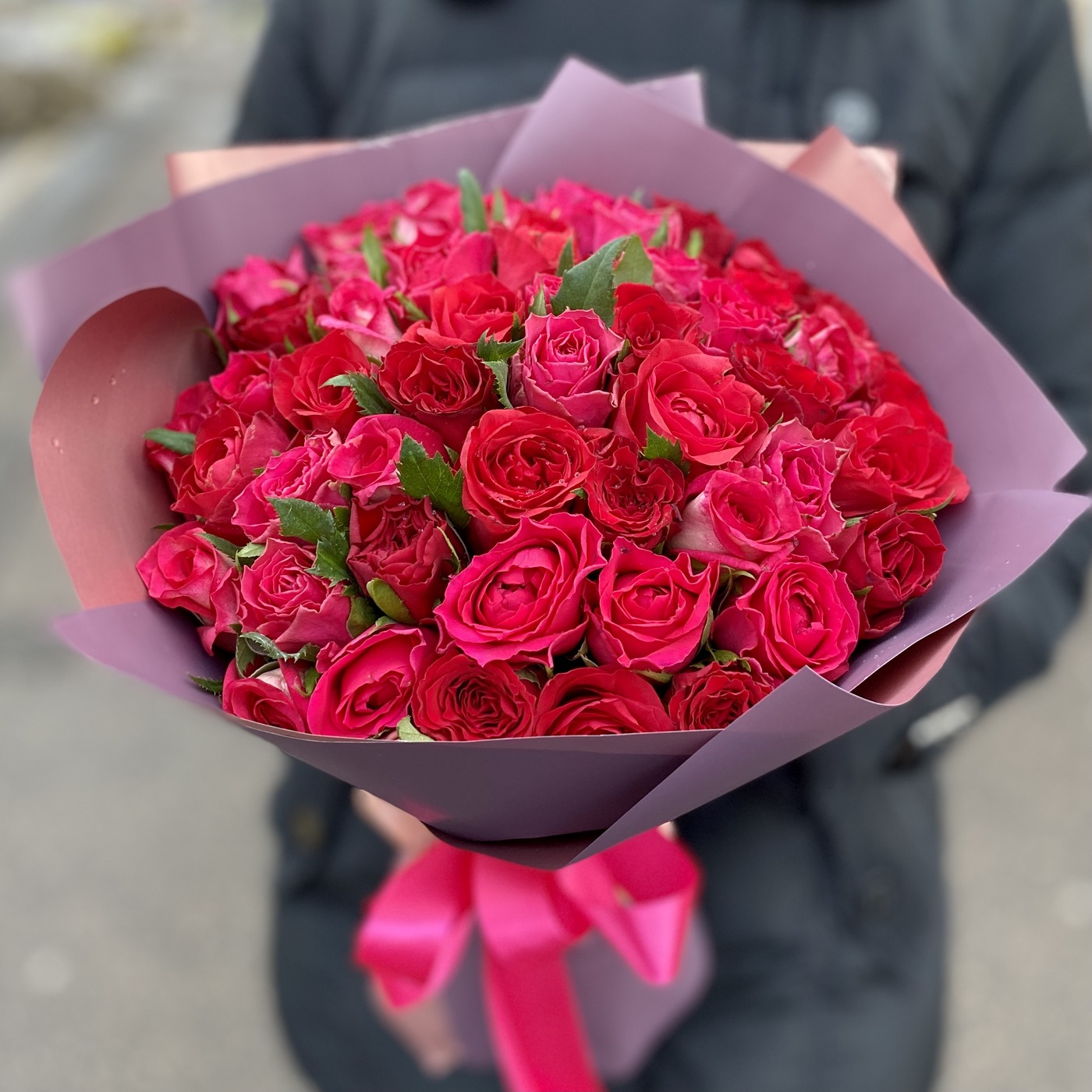 Анна о заказе: 51 малиновая розаСпасибо! Букет великолепный! Цветы свежайшие, упругие, очень красивые, крупные. Добавлено 4 коралловые розы и зелень
