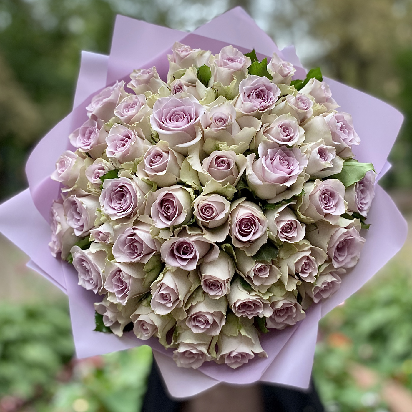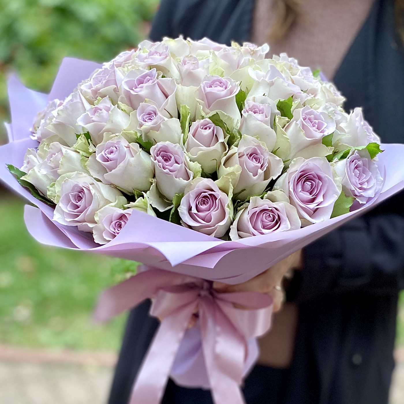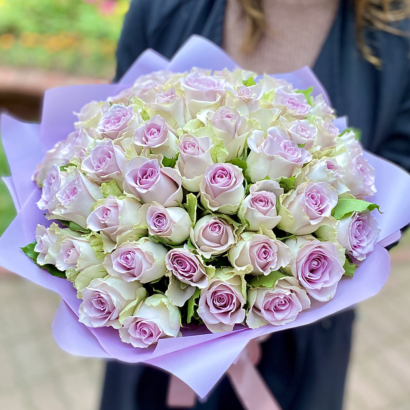 Невероятно нежный и воздушный букет из 51-ти одной розы сорта Morning Dew порадует женщин, обладающих утонченным вкусом и чувством прекрасного. Необычная богатая расцветка, где нежно сиреневый оттеняет белый и бледно-салатовый надолго притянет восторженный взгляд. Бутоны этой розы крупные и крепкие, а лепестки имеют необычные словно «гофрированные» края. Название сорта «утренняя роса» или «утренняя свежесть» полностью подходит этим изысканным цветам. Простая, но стильная упаковка удачно подчеркивает редкую расцветку бутонов.