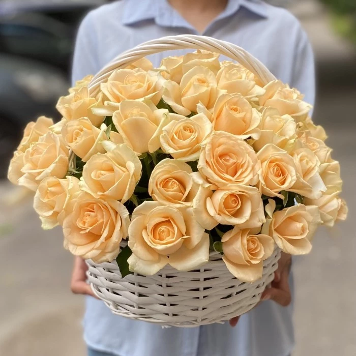 Композиция из 51 персиковой розы сорта Пич аваланш в плетеной корзиночке. Прекрасный подарок на свадьбу или день рождения! Нежнейший персиковый окрас и свежий аромат чудесных роз подарит своей получательнице улыбку и хорошее настроение.