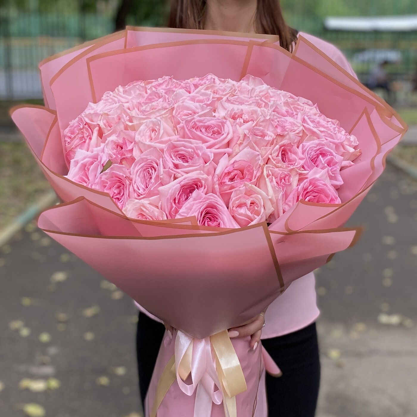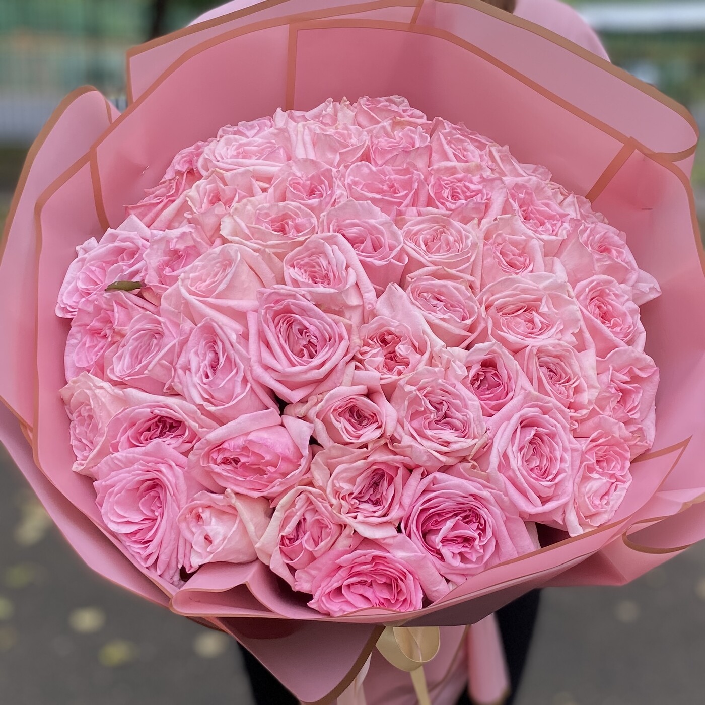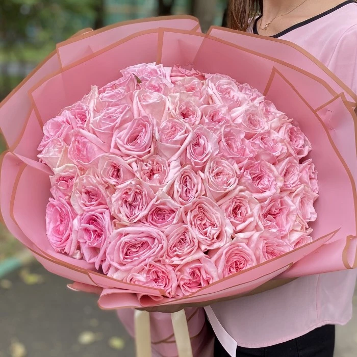 Большой букет из ароматных пионовидных роз Пинк Охара. Это очень ароматный сорт. Роза имеет крупный не плотный бутон. Раскрывается полностью до серцевины, закручивая свои лепестки, что делает эту розу очень пышной и воздушной.