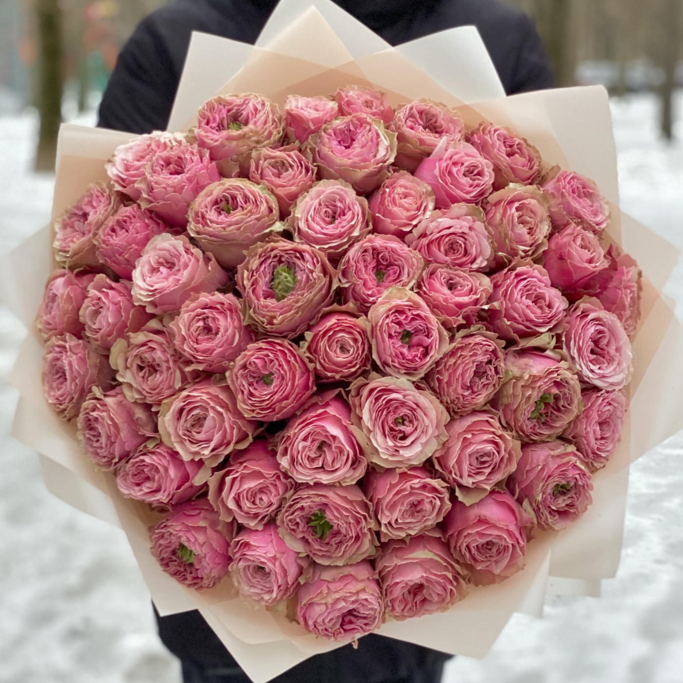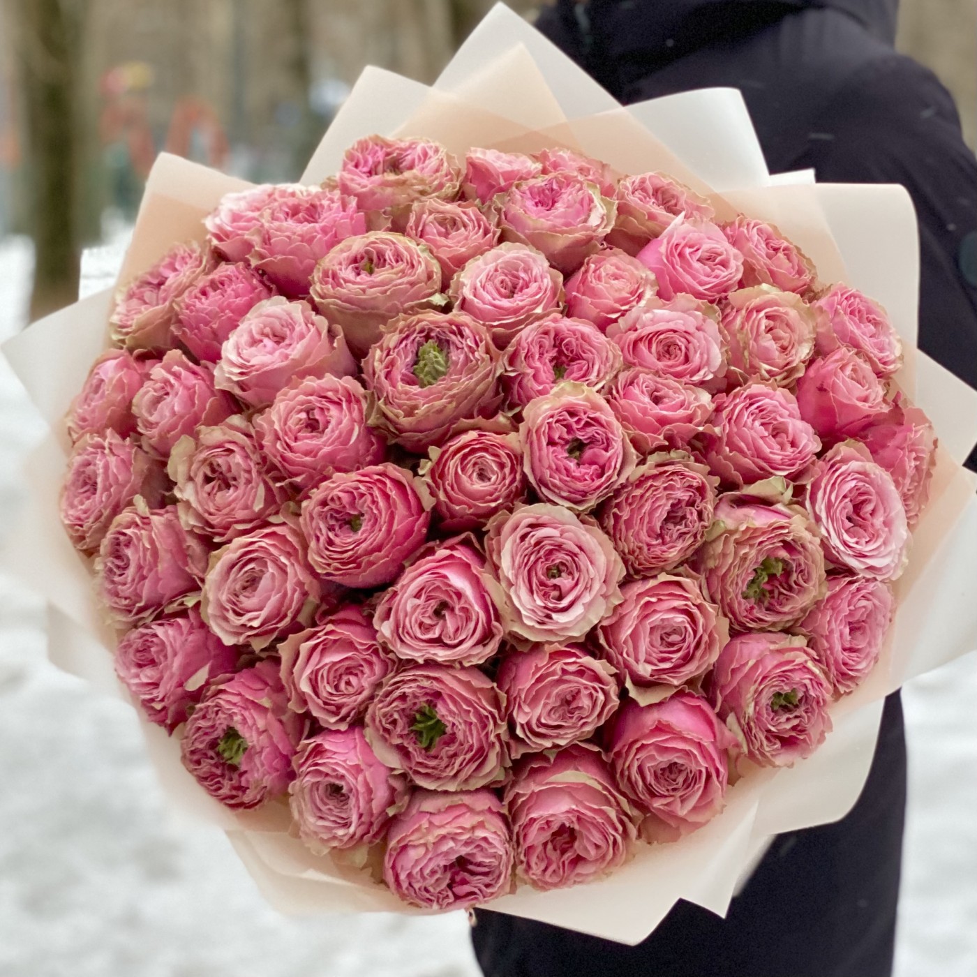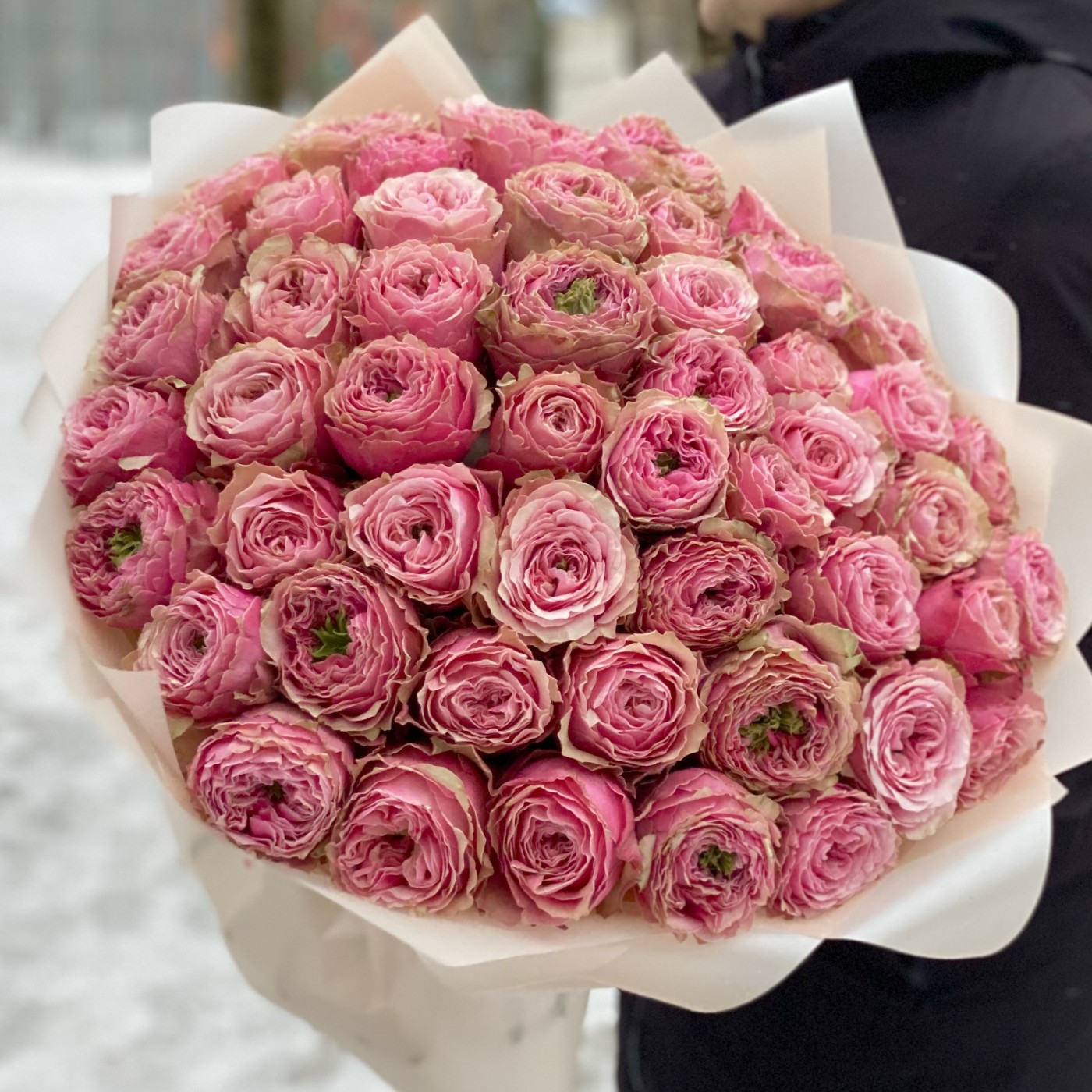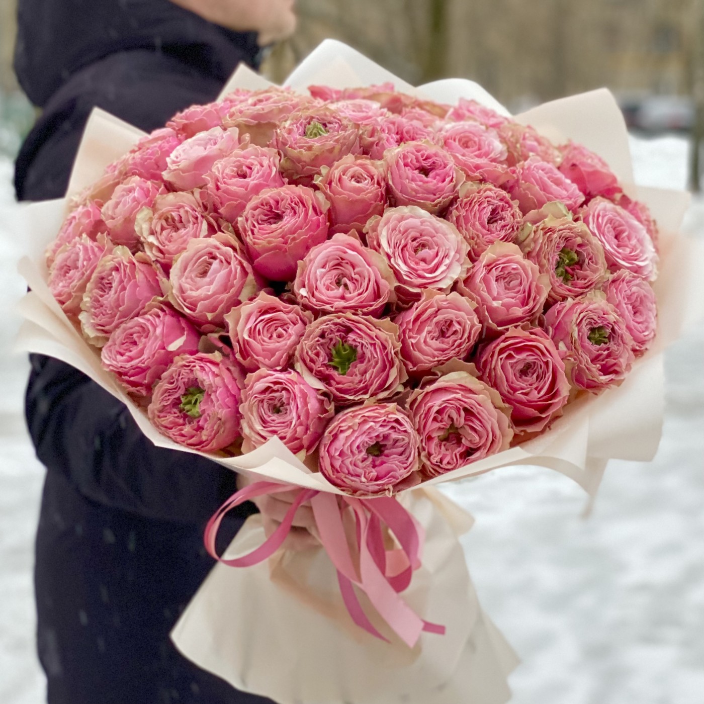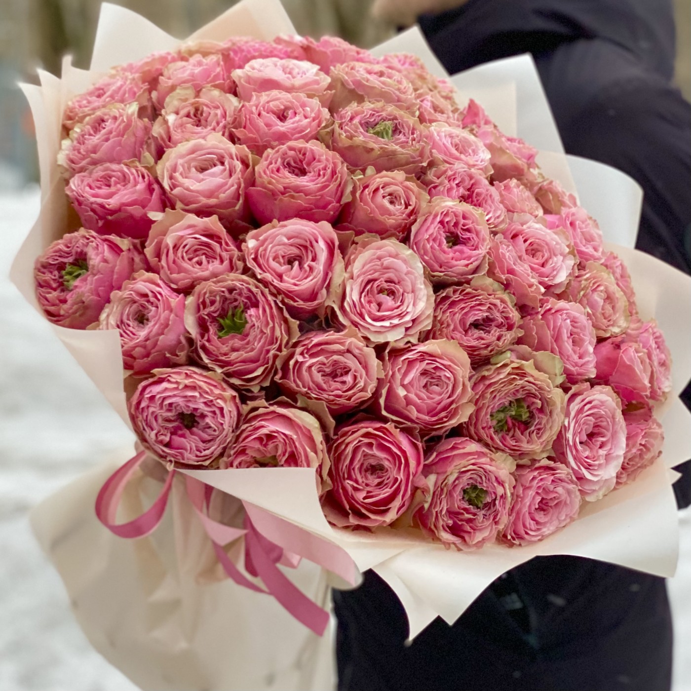 Букет из 51 пионовидной розы, удивительного и потрясающего сорта Белиз. Такой букет, получатель запомнит на долгое время. Красивые бутоны круглой формы розового цвета с необычной зеленой сердцевиной. Этот букет для тех кто хочет удивить и порадовать пионовидными розами, своих родных и близких