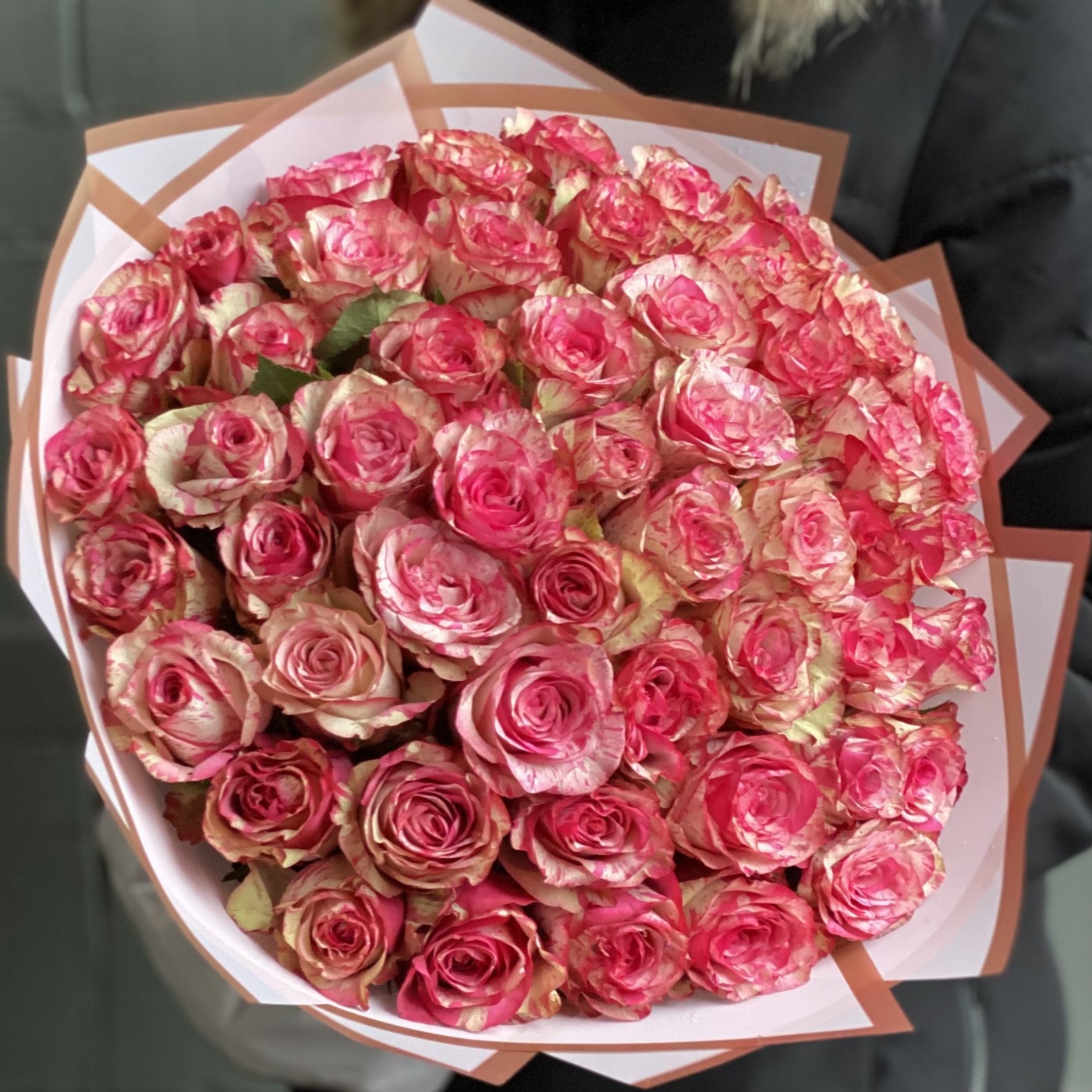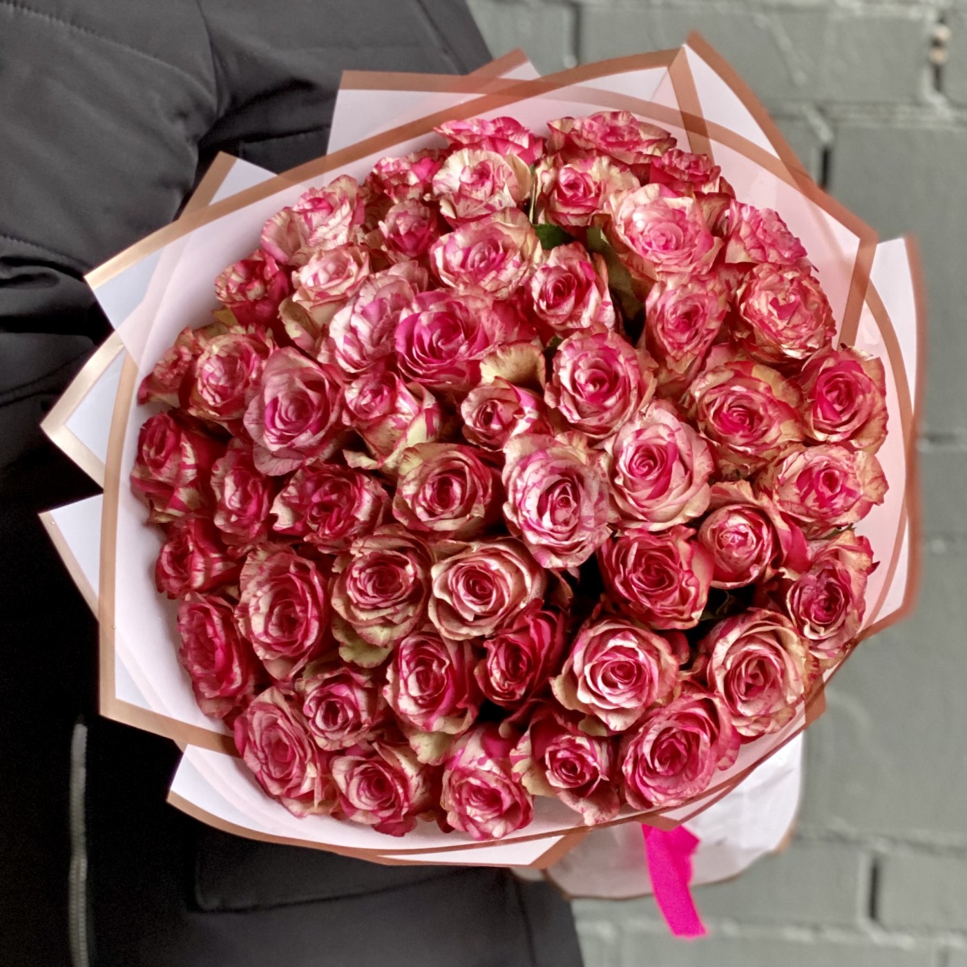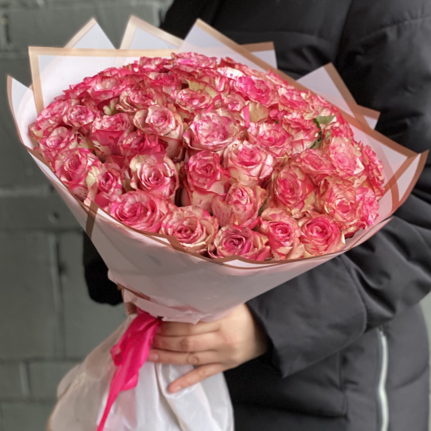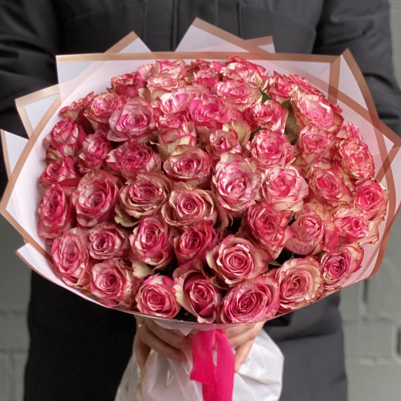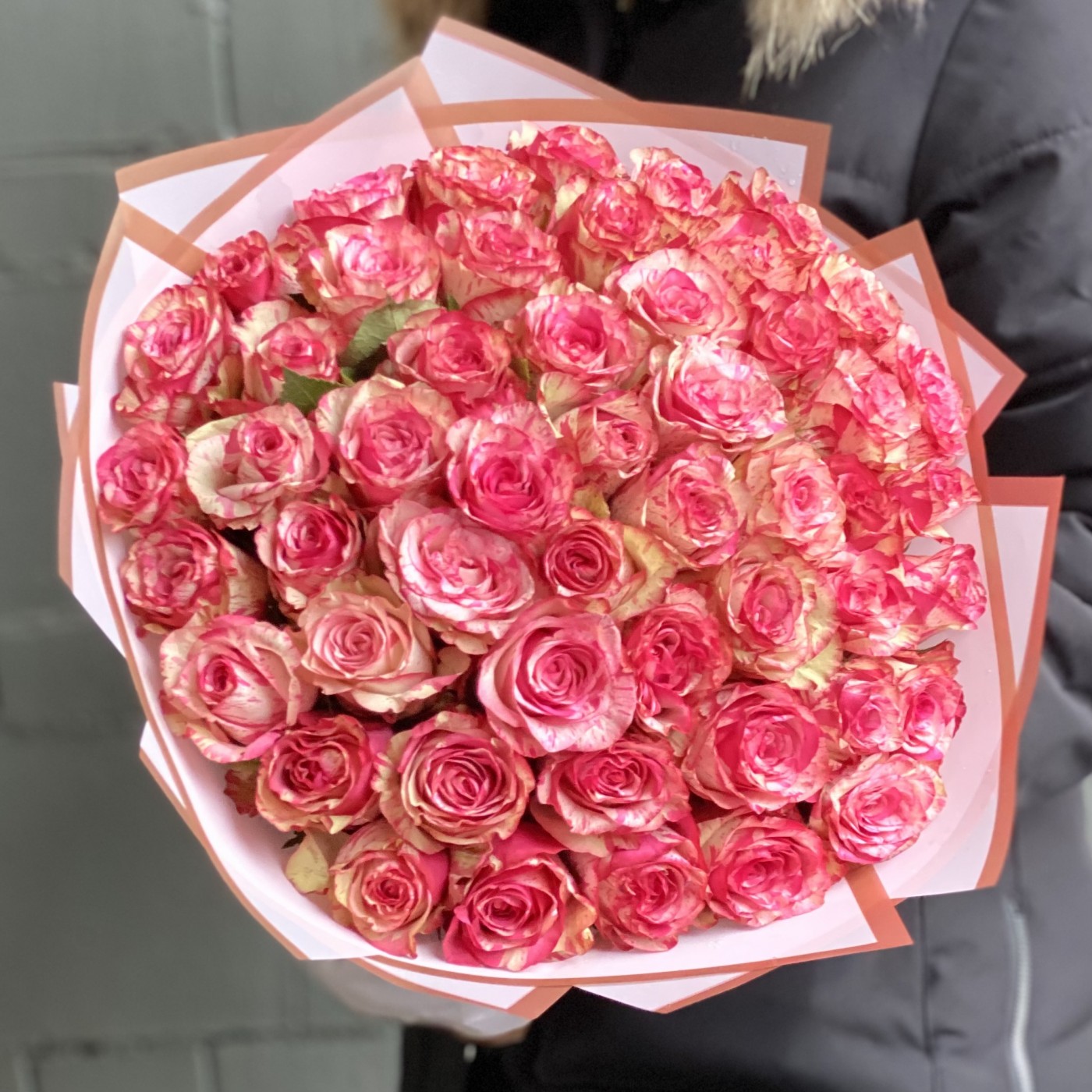 Анна о заказе: 51 малиновая розаСпасибо! Букет великолепный! Цветы свежайшие, упругие, очень красивые, крупные. Добавлено 4 коралловые розы и зелень