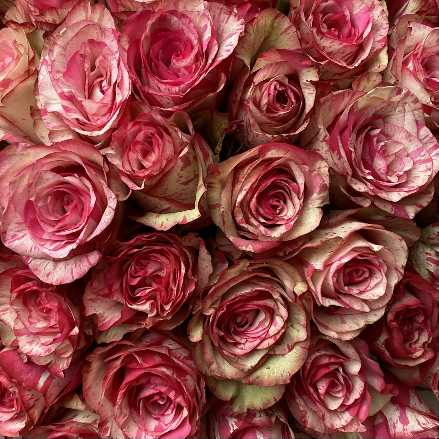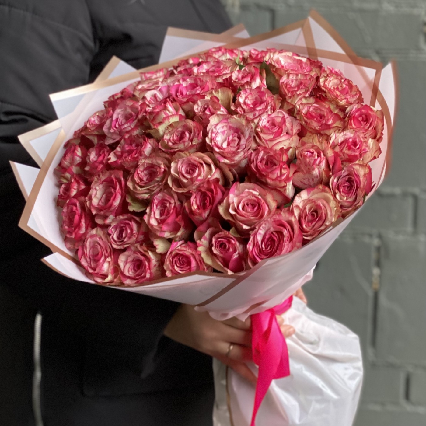 Яркая, эффектная роза с необычной бело-розовой окраской и крупным бутоном.