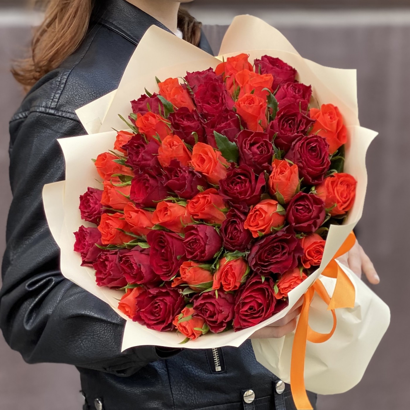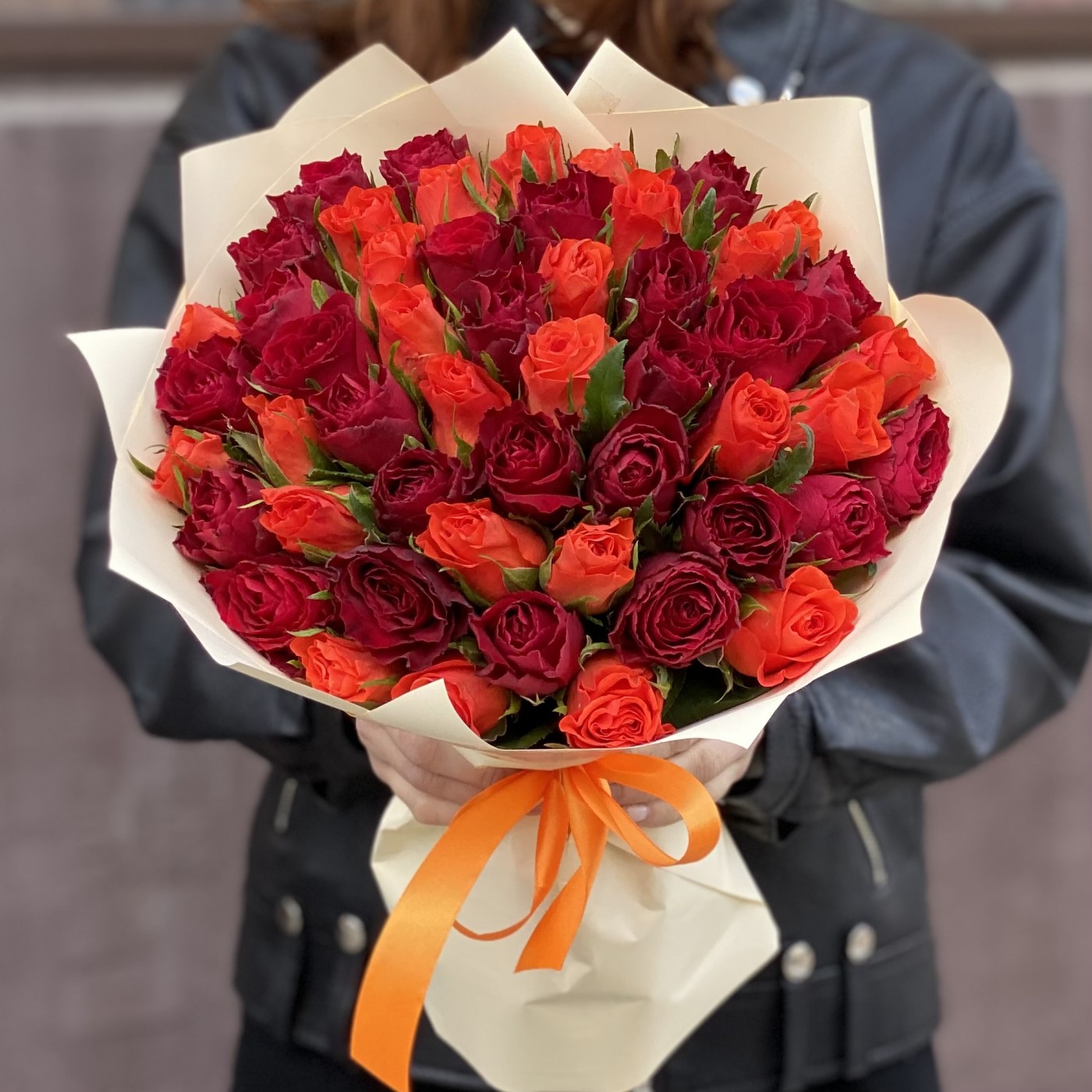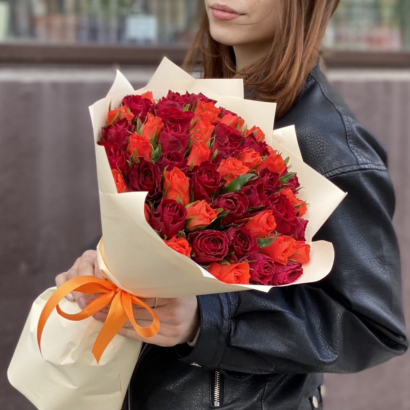 Яркое сочетание оранжевых и красных роз - это Ваша абсолютная уверенность, что Вы не прогадали с выбором букета. Свежие ароматные розы выглядят очень презентабельно, подходят для подарка дамам любого возраста и статуса. Это будет прекрасный подарок для любимой, для мамы и для других членов семьи. Букет из оранжевых и красных роз отлично впишется в офисную атмосферу и станет приятным сюрпризом для коллеги или руководителя.