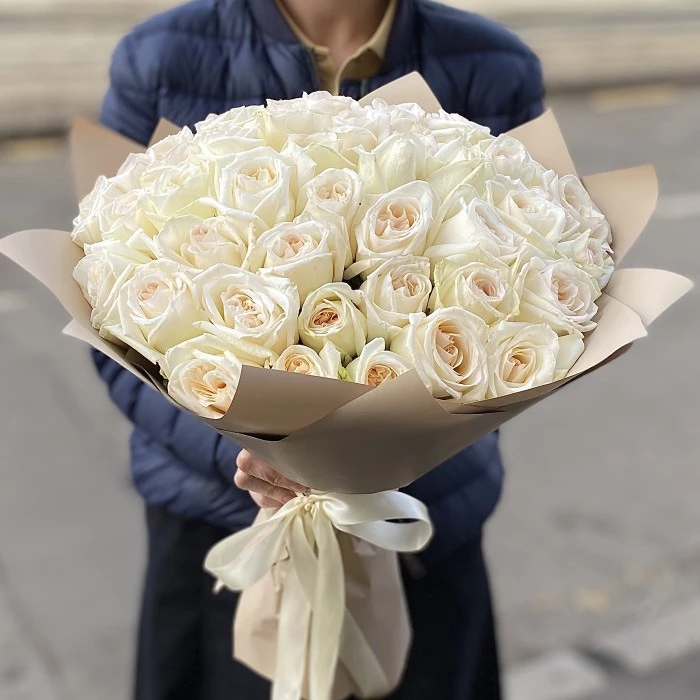 Елена о заказе: 51 белая роза в корзинеСпасибо за своевременную доставку, хорошие гвоздики как с грядки. 100. Курьеру отдельное спасибо