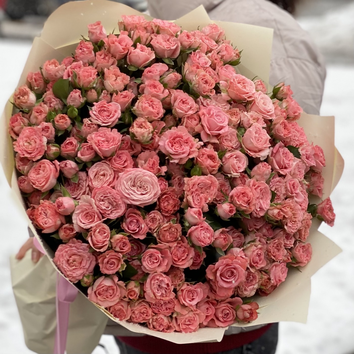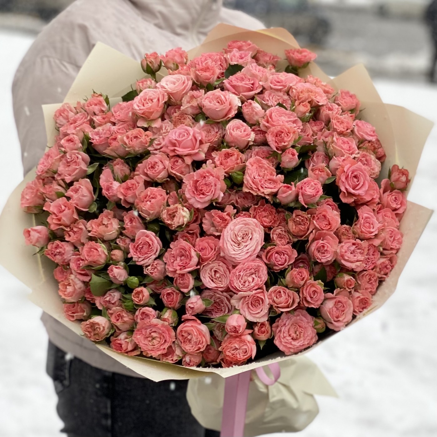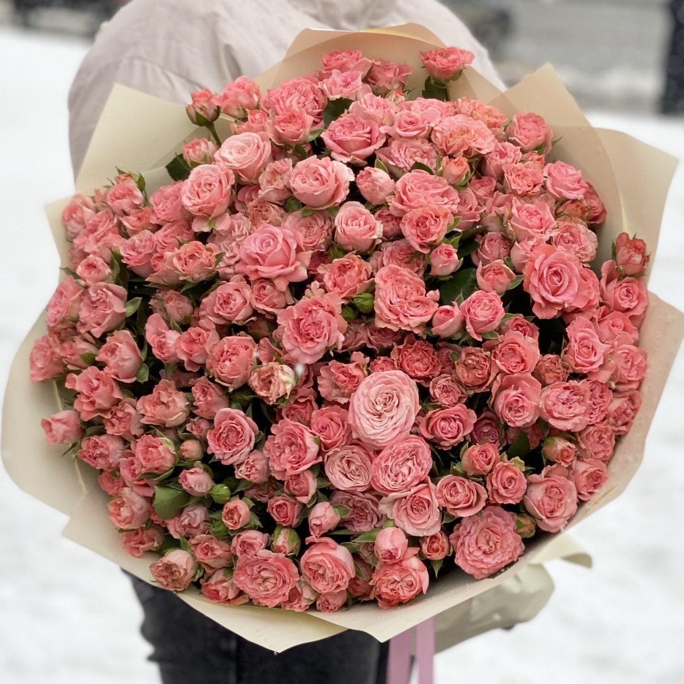 Элегантный букет из популярнейшего сорта розовых кустовых роз линейки Бомбастик. Насыщенный розово-персиковый оттенок, махровые лепестки и необычная форма бутона покорят сердце даже самого требовательного получателя.