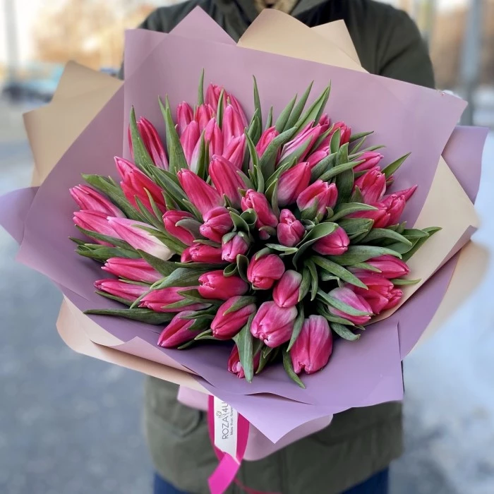 Букет из розового 51 тюльпана Болроял. Прекрасный вариант чтобы впечатлить свою вторую половинку. Подарите большой букет тюльпанов на день рождения или юбилей.