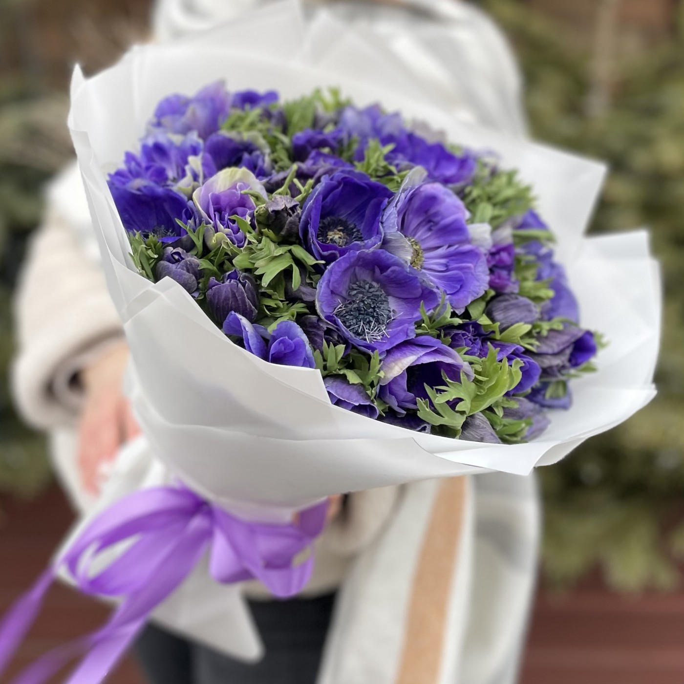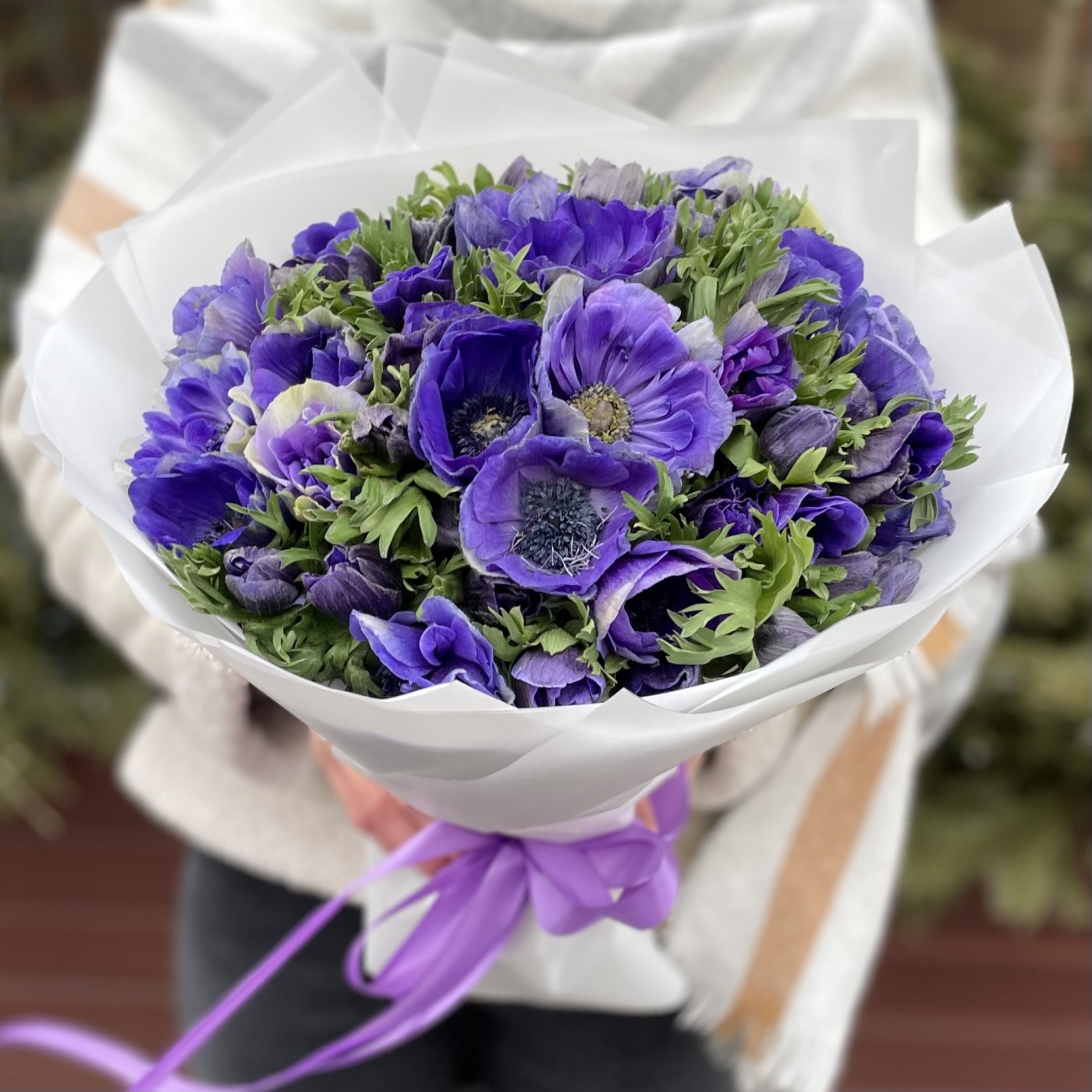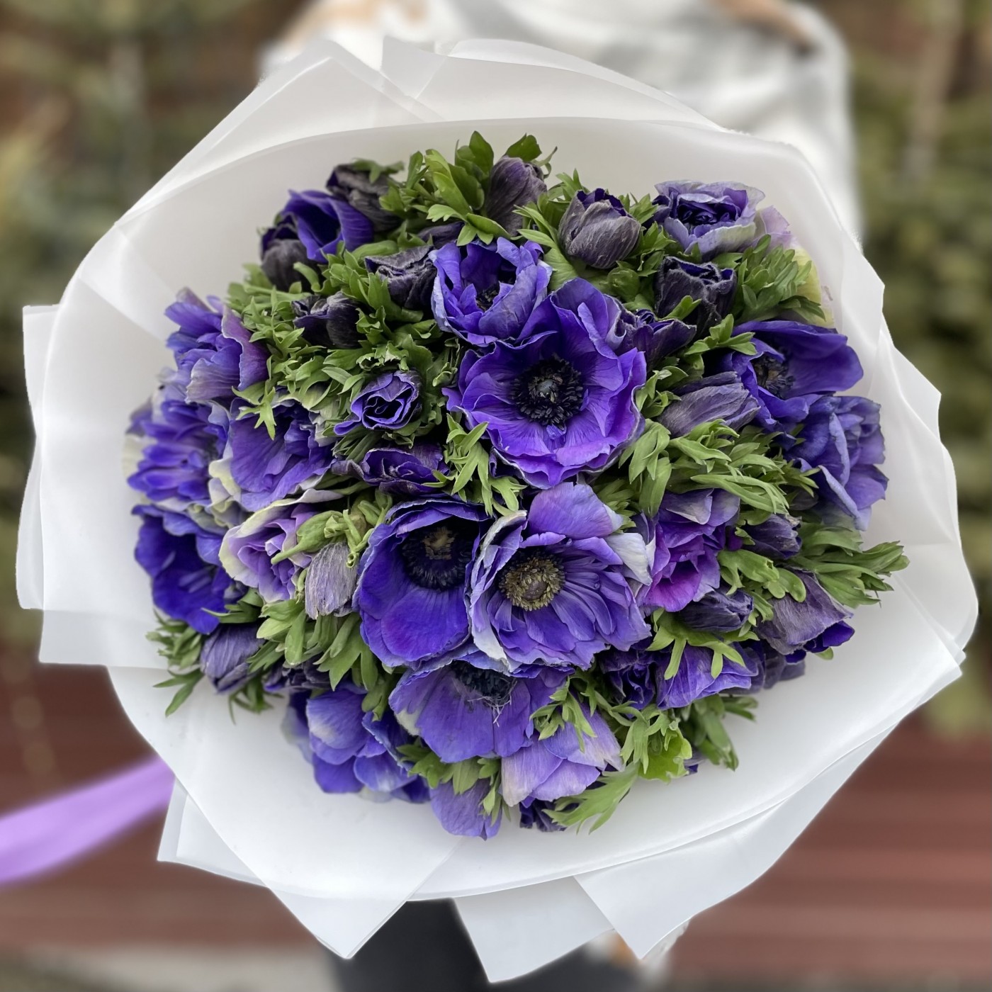 Букет из синих Анемонов. Прекрасный подарок на день рождения. Этот цветок очень нежный и воздушный. Его бутон напоминает разноцветные маки. Удиви получателя необычными цветами.