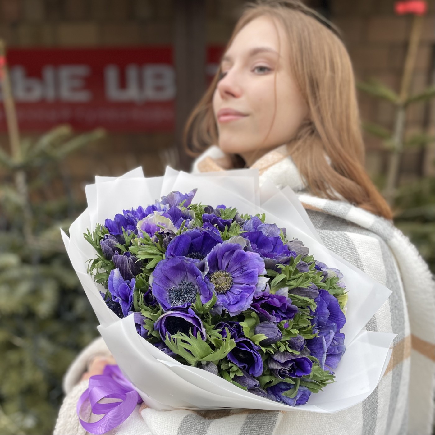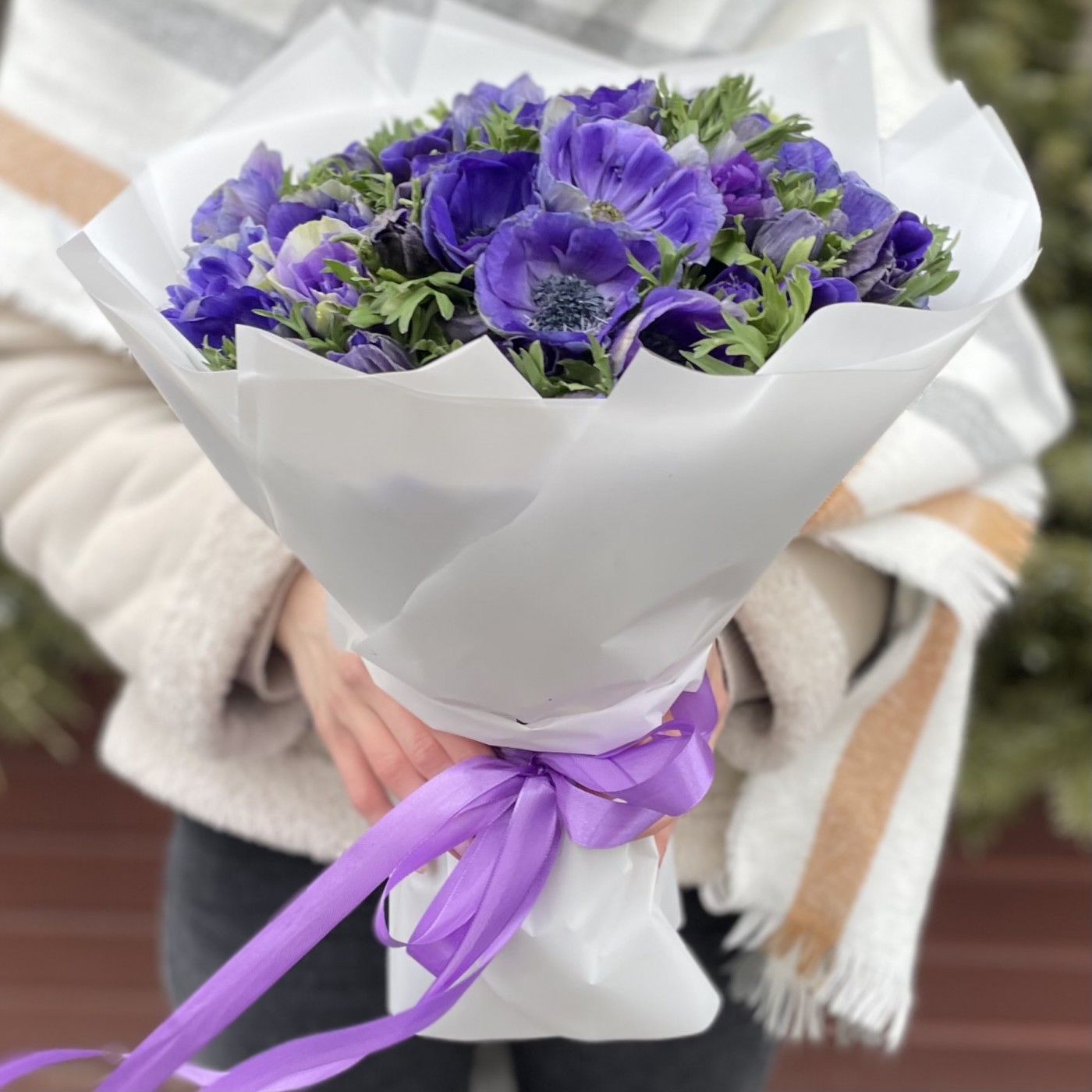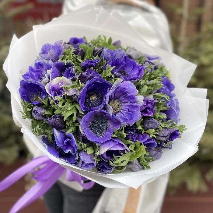 Букет из синих Анемонов. Прекрасный подарок на день рождения. Этот цветок очень нежный и воздушный. Его бутон напоминает разноцветные маки. Удиви получателя необычными цветами.
