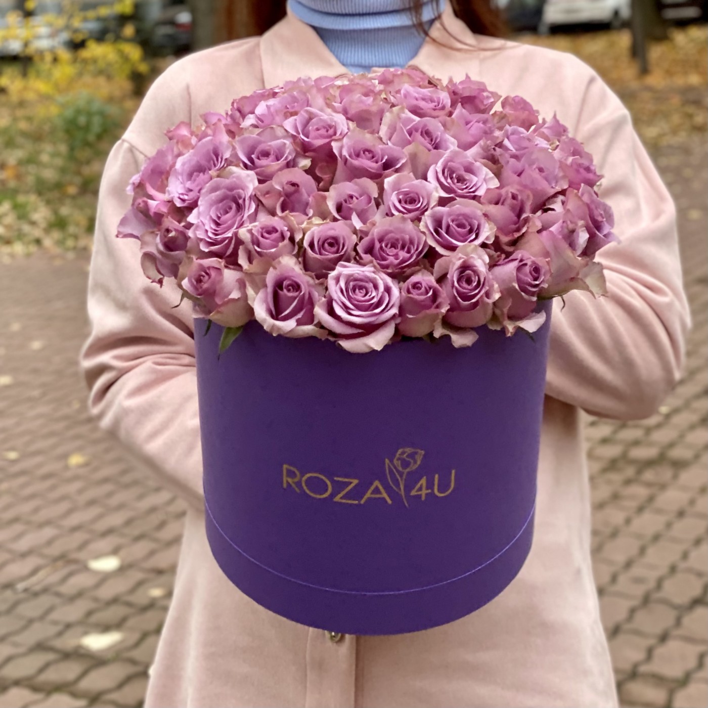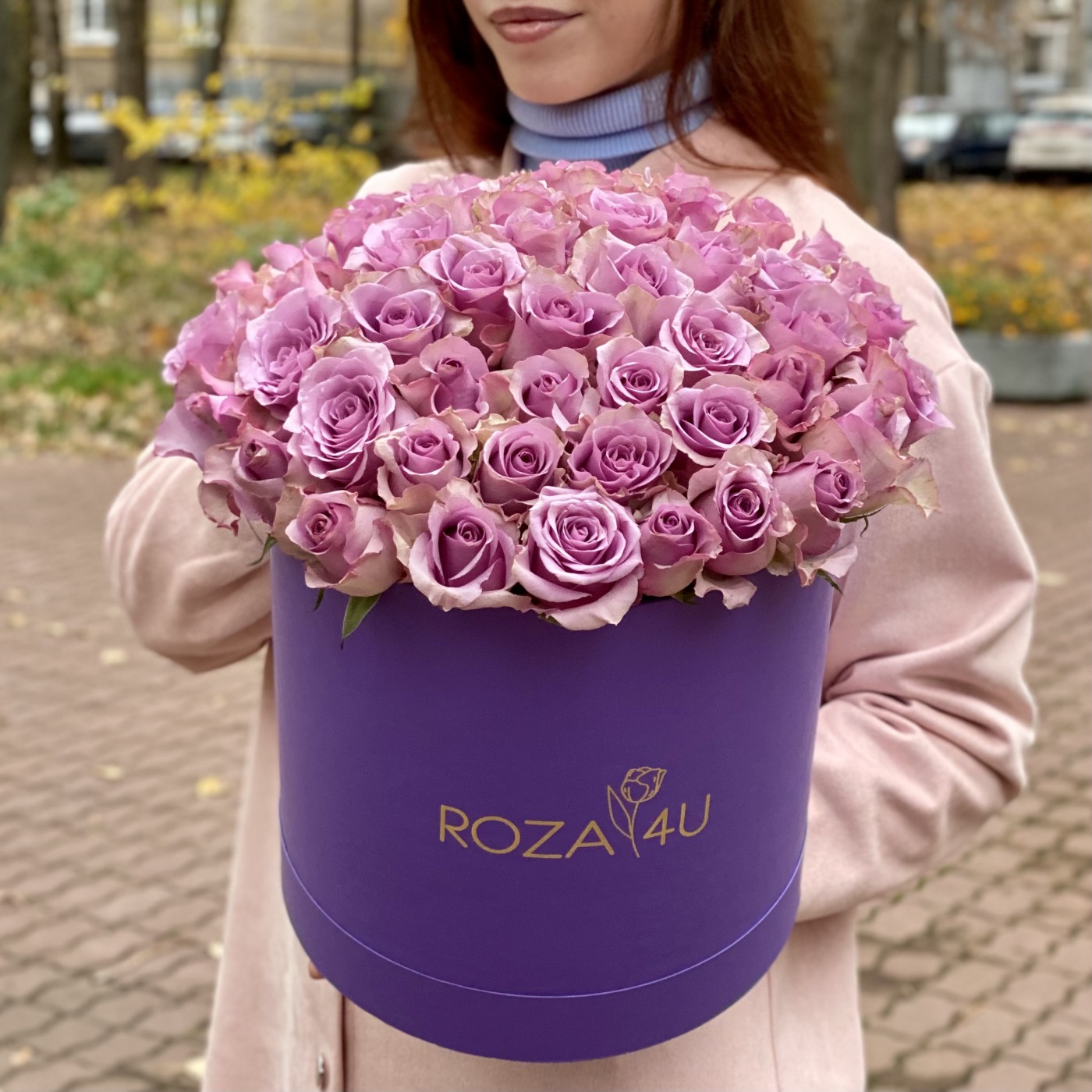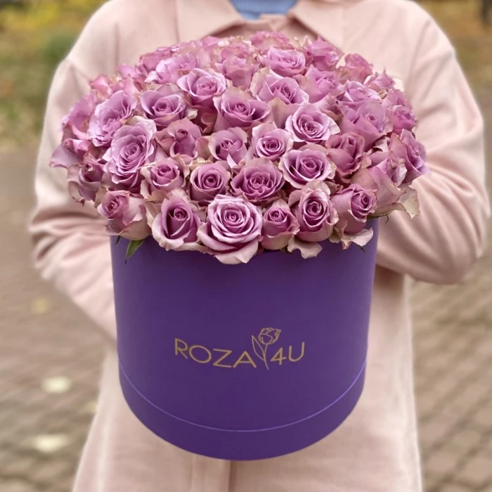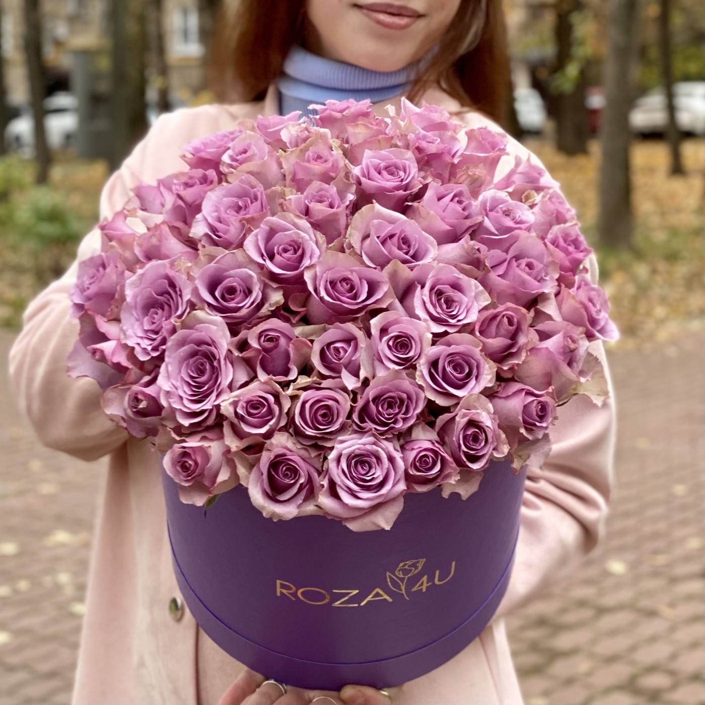 51 нежно-сиреневая роза сорта Найтингейл в шляпной коробке.