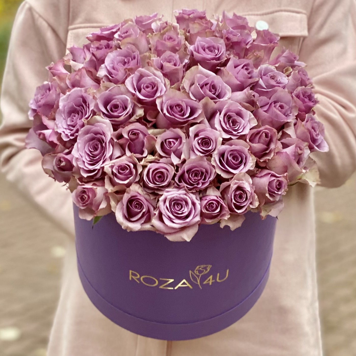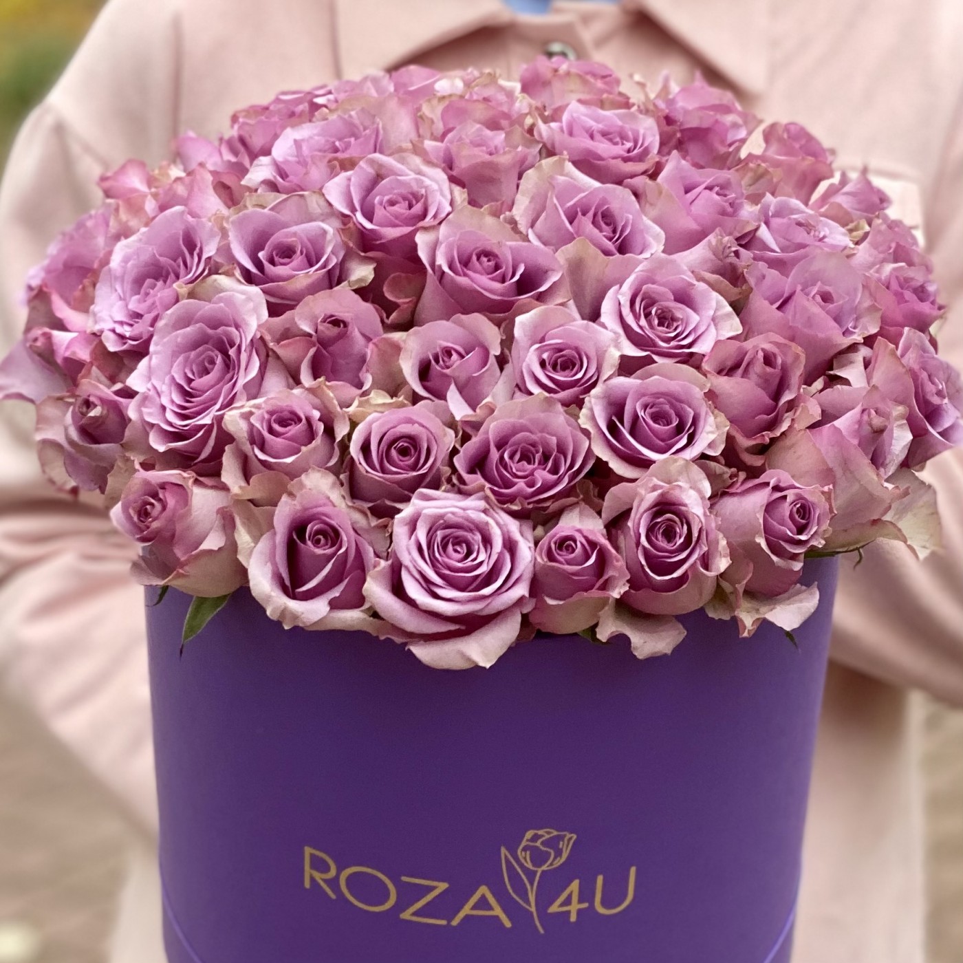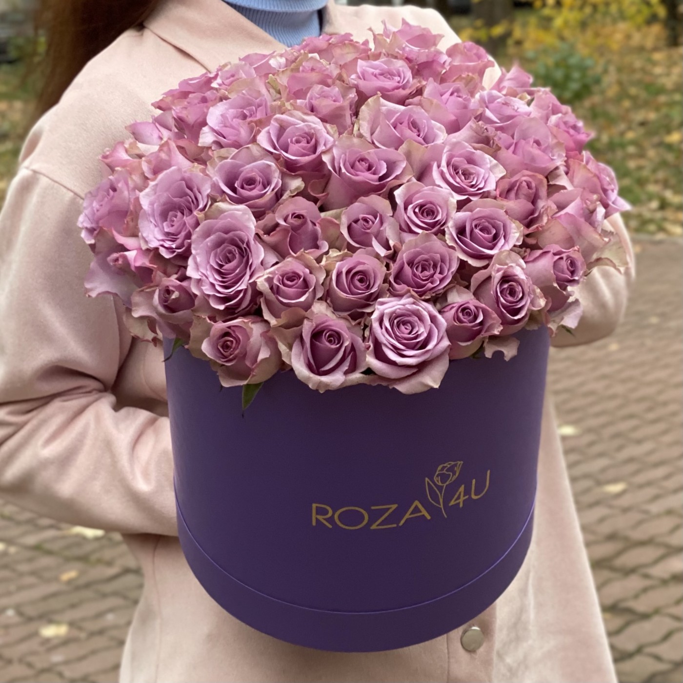 51 нежно-сиреневая роза сорта Найтингейл в шляпной коробке.