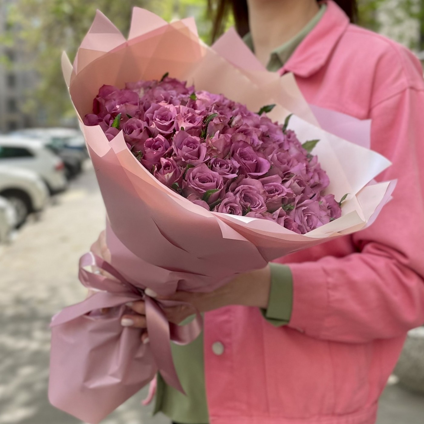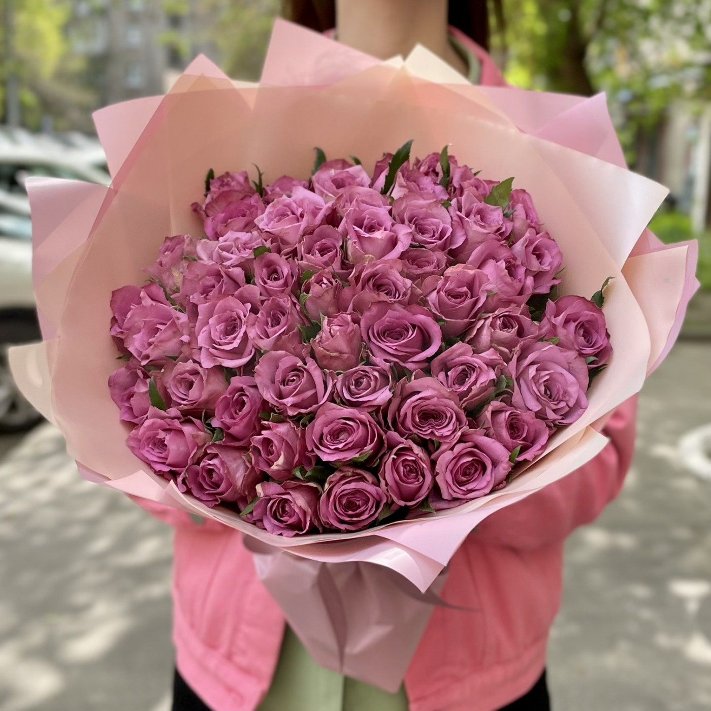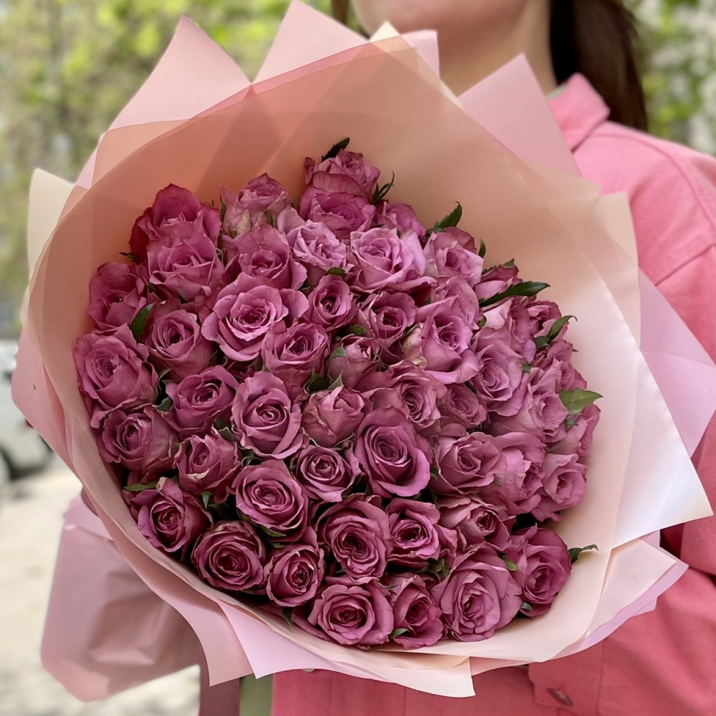 Анна о заказе: 51 малиновая розаСпасибо! Букет великолепный! Цветы свежайшие, упругие, очень красивые, крупные. Добавлено 4 коралловые розы и зелень