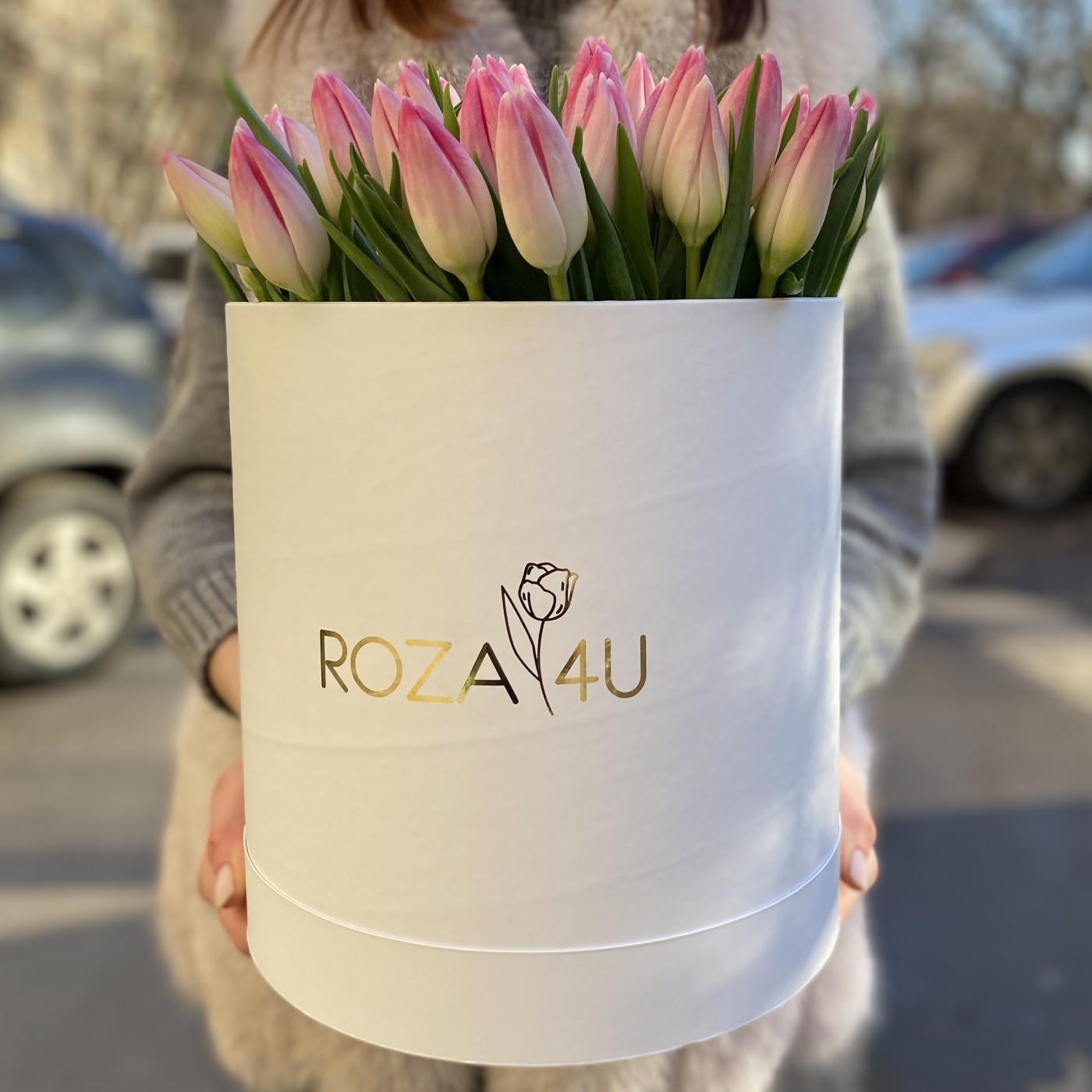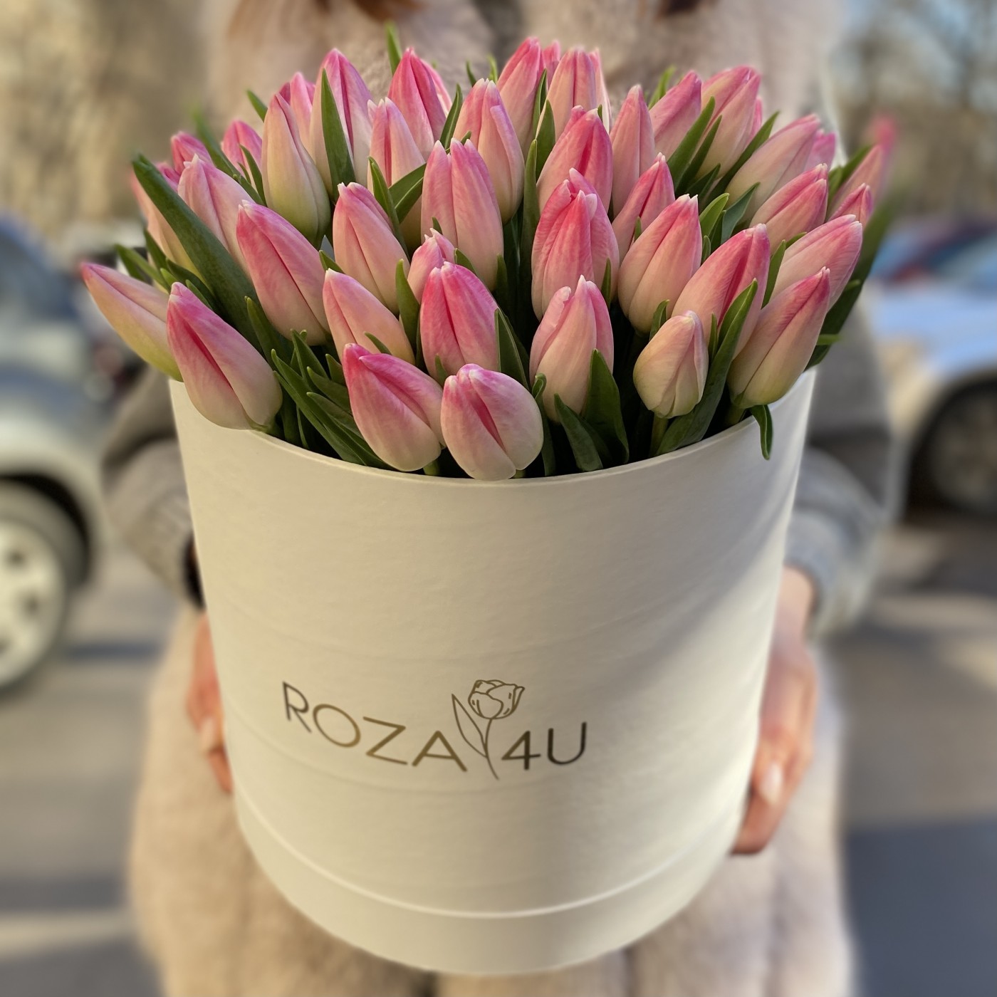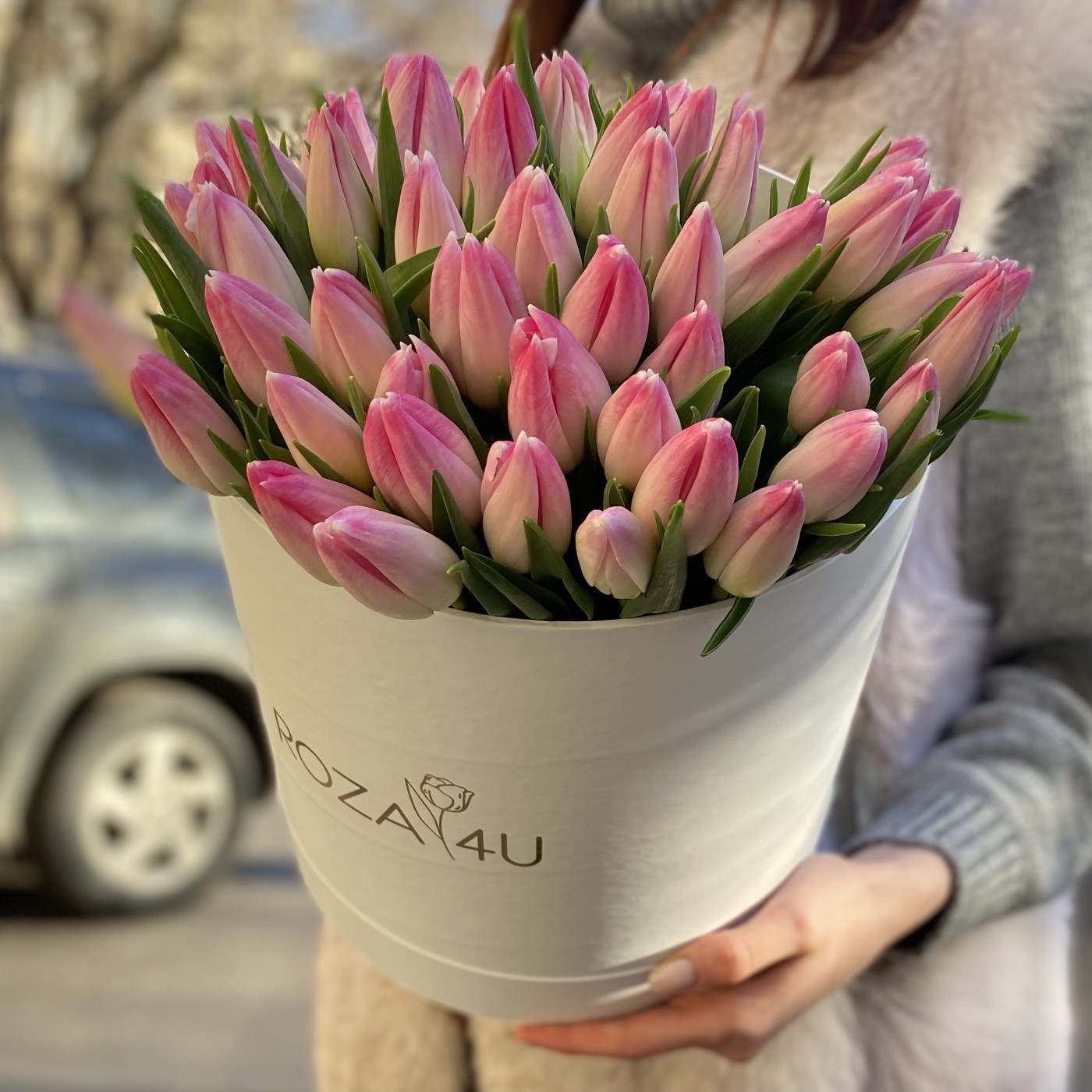 51 нежно-розовый тюльпан в коробке. Преподнесите такую композицию в качестве презента своим любимым людям. Прекрасный подарок к 8 марта.