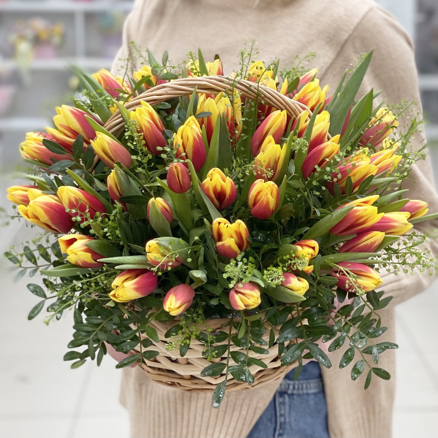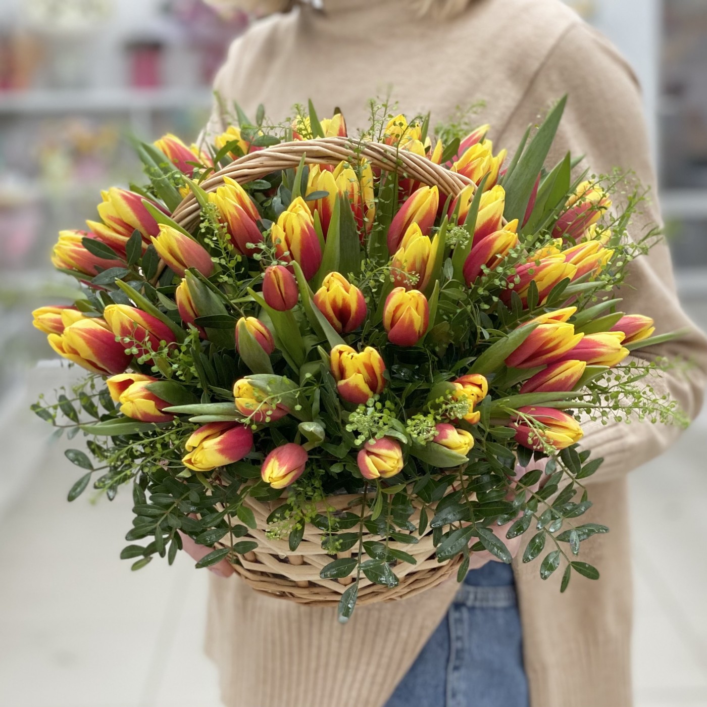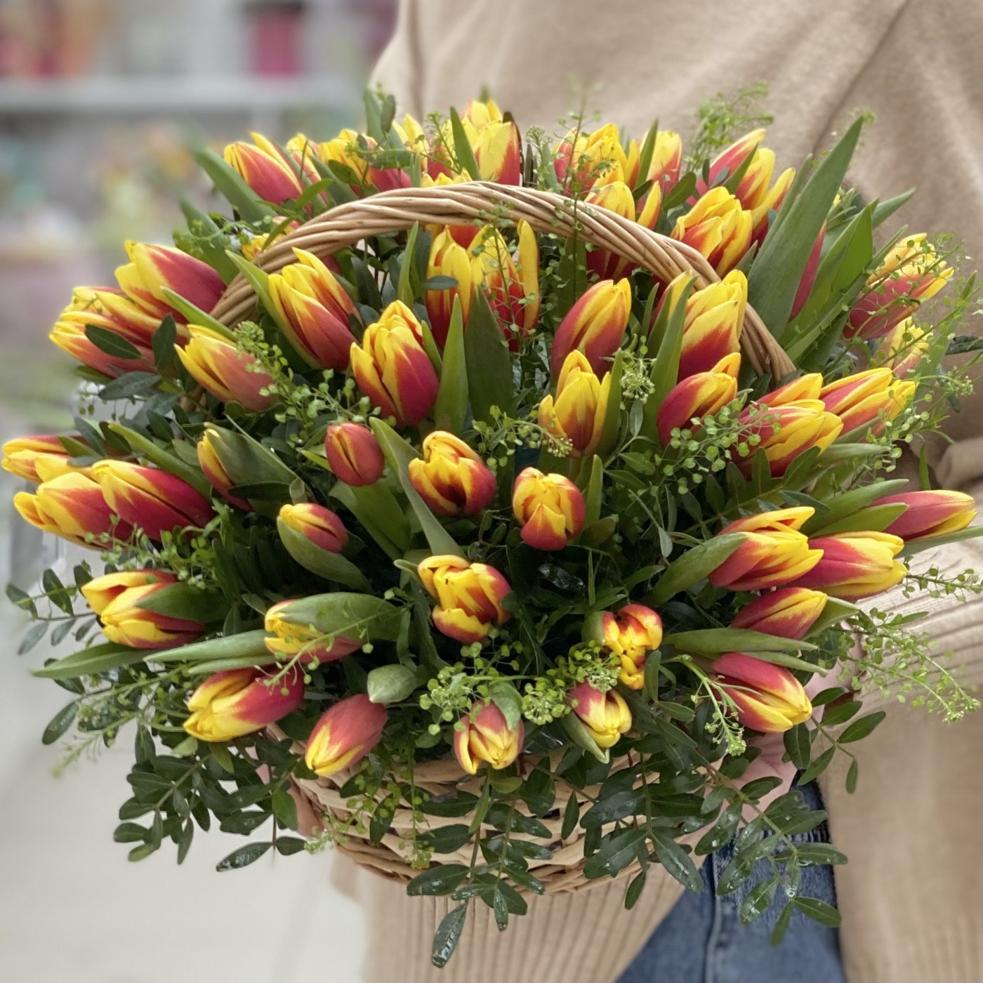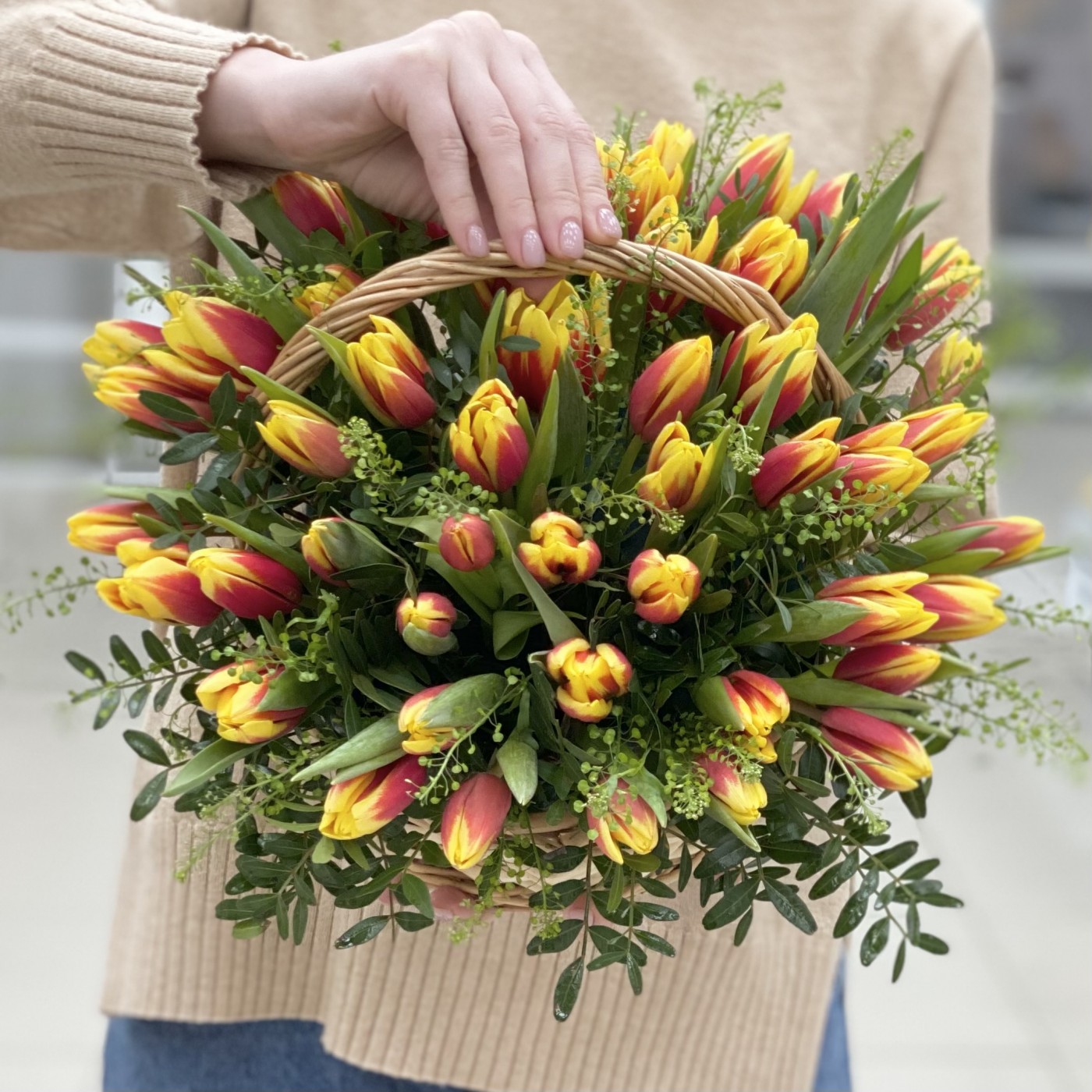 Корзина с тюльпанами создана, чтобы радовать женщин не только в Междунарожный женский день, но и в любой другой. Наполните дом светом и ароматом яркой, солнечной композиции в белой корзине.
